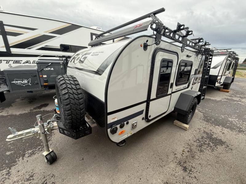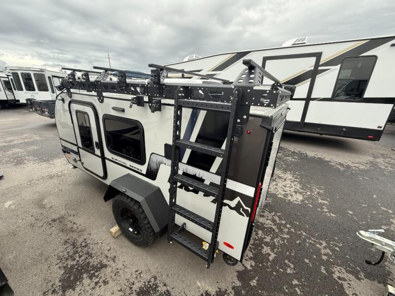 You'll be ready for anything in the 12RKSS Survival Series travel trailer! The rugged Survival Series upgrades make it suitable for the most extreme adventures, but you'll still love the comfortable living space, with amenities like a queen futon/mattress, AM/FM Bluetooth stereo, and tons of storage space. Outside you'll find a fully-equipped kitchen, with a removable table, 26" griddle, two burner cooktop, 3.3 cu. ft. refrigerator, and a stainless steel sink. The optional Power-Up package adds a 200-watt solar panel, 100 aH lithium battery, a battery monitor with custom bezel, and two extra battery trays so you will be prepared to go truly off-grid.