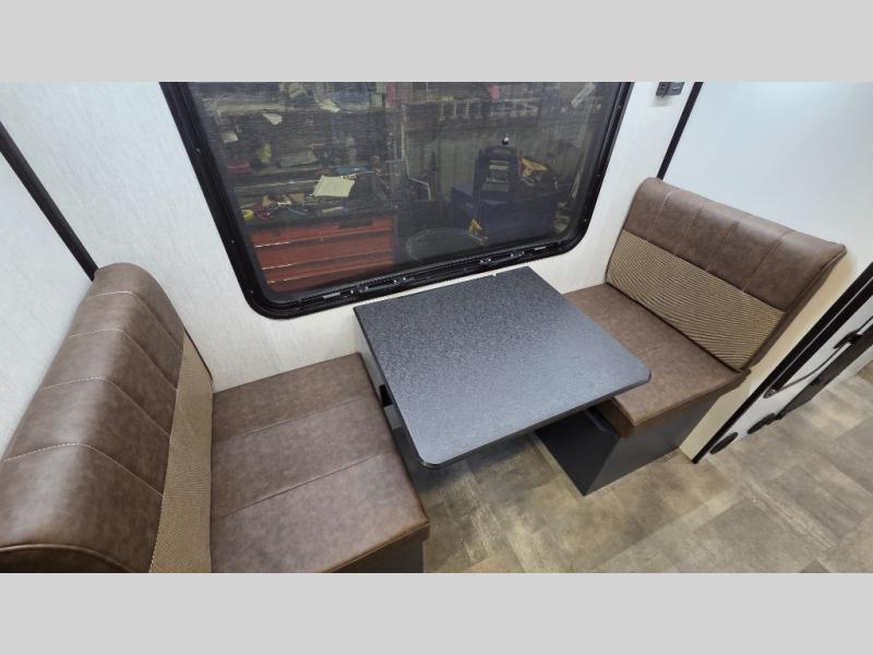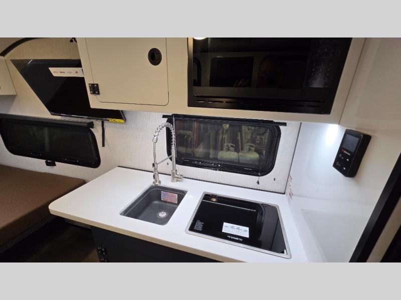 You'll love spending time at the campground in this cozy travel trailer for three. Once you arrive at the site, you can unload the pass-thru storage, then head in through the rear entry door to unpack. A two burner stove and microwave oven will let you make a quick lunch, and there is an 8 cu. ft. refrigerator/freezer to keep your cold items fresh. There are also drawers/beverage station, a pantry and closet plus overhead cabinets so everything has a place. You'll get a great night's rest on the front queen bed, while your guest or two little ones convert the booth dinette to sleeping space. And the wet bath is complete with a bath mat, cassette toilet, sink, and skylight for more standing space!