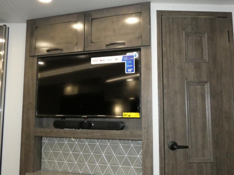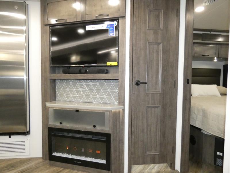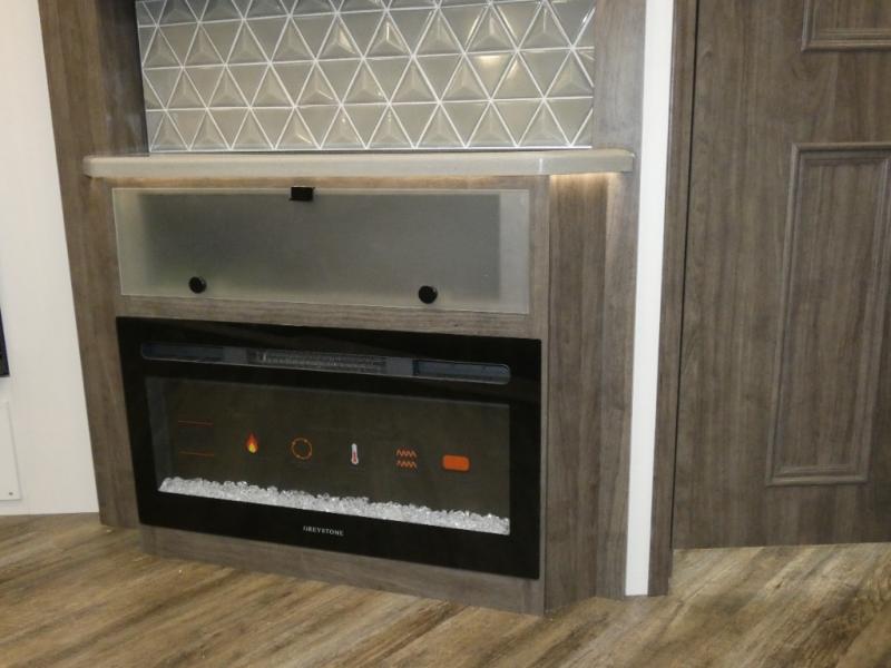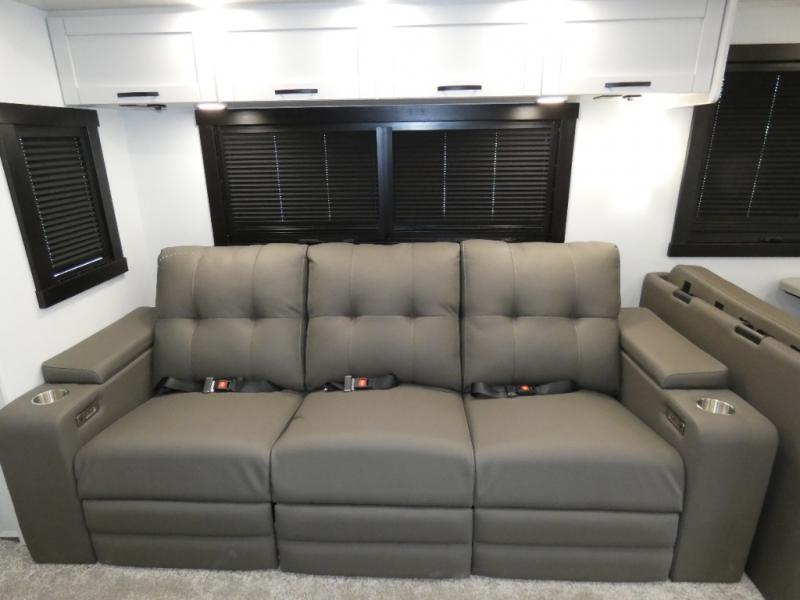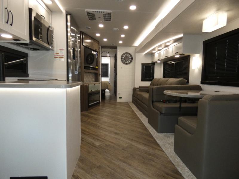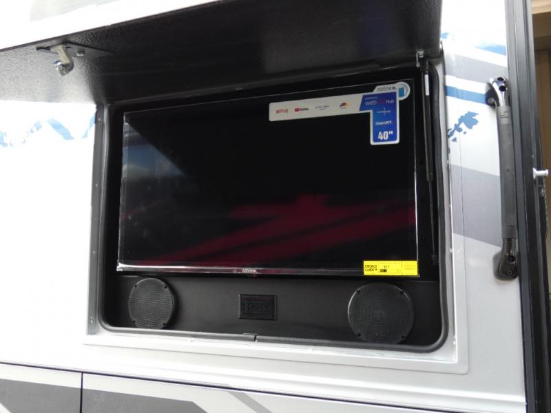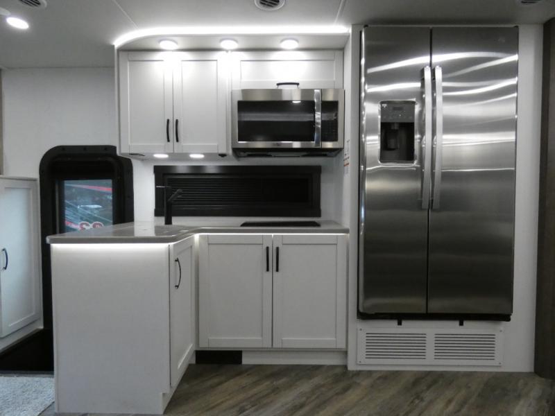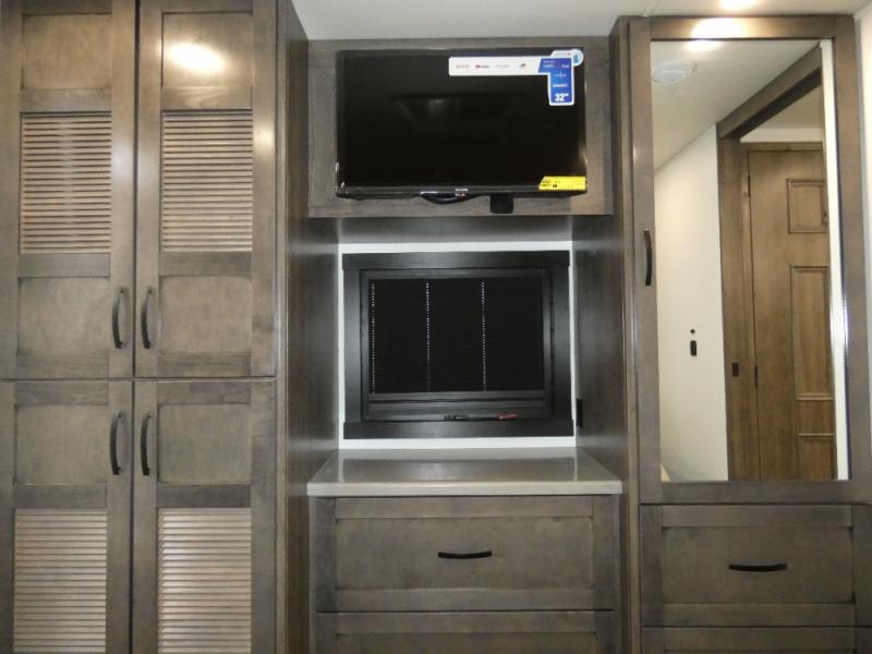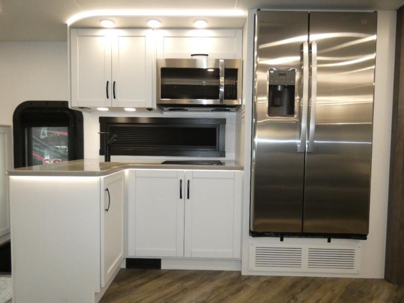 Get ready for fun adventures in this double slide out coach! Once you arrive at your destination, set up the 17' power awning with LED lights and watch the big game on the exterior LED Smart TV. You'll find plenty of seating spaces in the main living area on the 93" reclining sofa or at the booth dinette, plus there is a fireplace here and an LED HD Smart TV. The kitchen is any chef's dream with its residential refrigerator, two burner induction cooktop, and residential-size convection microwave. This model also includes a bath and a half that will come in handy when traveling with friends and family, and don't overlook the master bedroom with a power head lift king bed slide, large wardrobes, and an LED Smart TV!