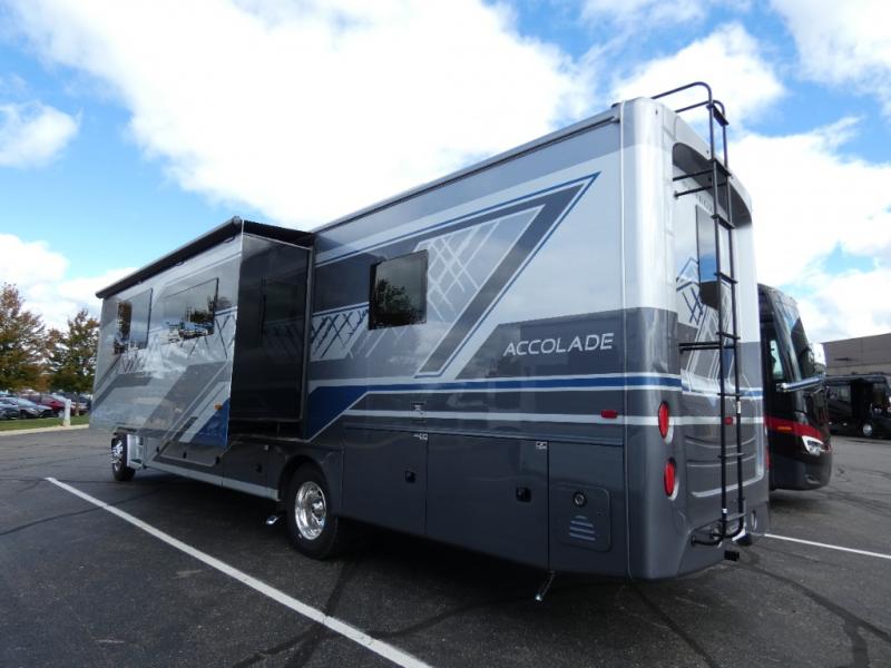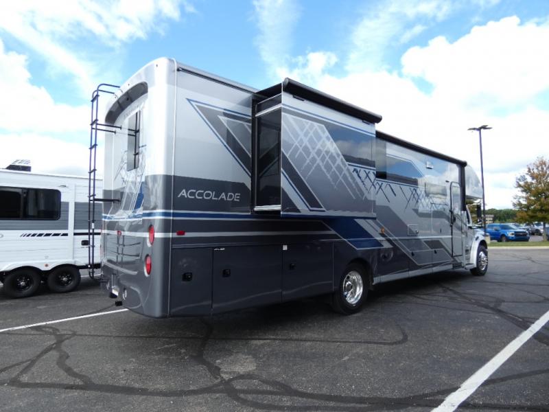 Strength and luxury come together perfectly to bring you the Accolade Super C diesel motorhome by Entegra Coach. The E-Z Drive Premier includes a computer-balanced driveshaft, a heavy-duty rear stabilizer bar, SACHS shocks, and more to provide a smooth drive. You'll be able to feel the power behind the Cummins ISB 6.7L diesel engine with 360 HP and 800 ft. lb. torque, plus each model sits on the advanced Freightliner S2RV chassis. The cockpit is every captain's dream with its Sony infotainment center, backup and side-view cameras, 6-way power driver and passenger seats, and much more. Step inside to find vinyl plank flooring, LED-lit solid-surface kitchen countertops, and high-intensity recessed LED ceiling lights to name a few comforts. The Accolade also includes many convenient amenities to make each trip enjoyable, like the water filtration system, the Winegard in-motion satellite dish, and the automatic hydraulic leveling jacks!