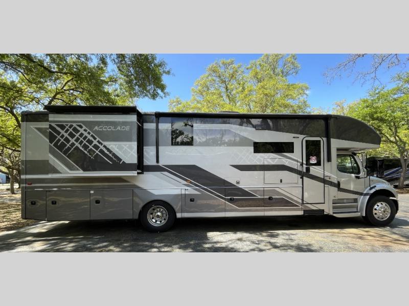 Strength and luxury come together perfectly to bring you the Accolade Super C diesel motorhome by Entegra Coach. The E-Z Drive Premier includes a computer-balanced driveshaft, a heavy-duty rear stabilizer bar, SACHS shocks, and more to provide a smooth drive. You'll be able to feel the power behind the Cummins ISB 6.7L diesel engine with 360 HP and 800 ft. lb. torque, plus each model sits on the advanced Freightliner S2RV chassis. The cockpit is every captain's dream with its Sony infotainment center, backup and side-view cameras, 6-way power driver and passenger seats, and much more. Step inside to find vinyl plank flooring, LED-lit solid-surface kitchen countertops, and high-intensity recessed LED ceiling lights to name a few comforts. The Accolade also includes many convenient amenities to make each trip enjoyable, like the water filtration system, the Winegard in-motion satellite dish, and the automatic hydraulic leveling jacks!