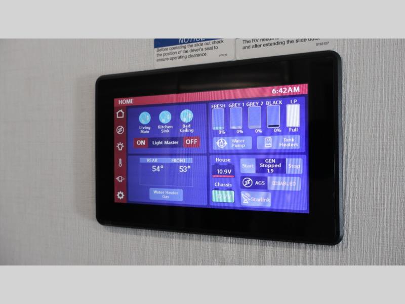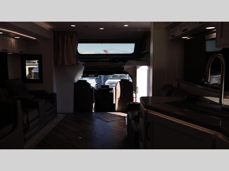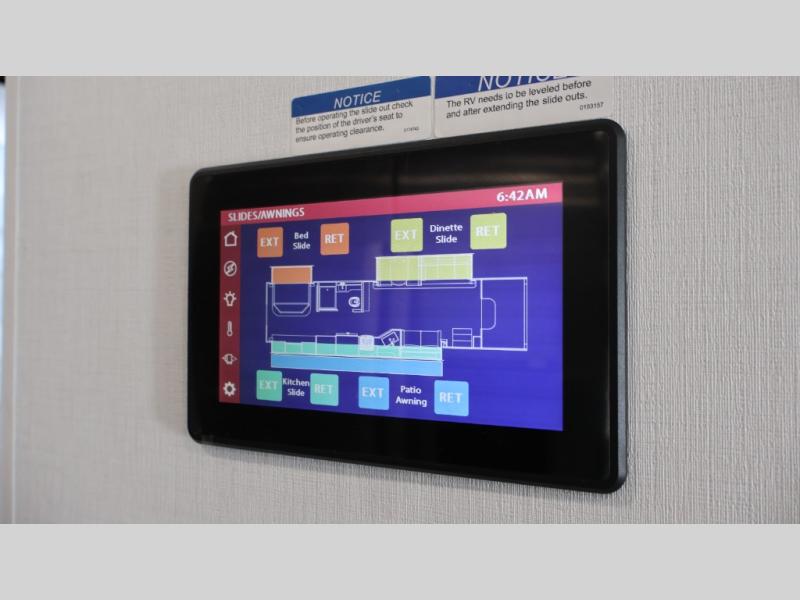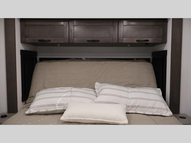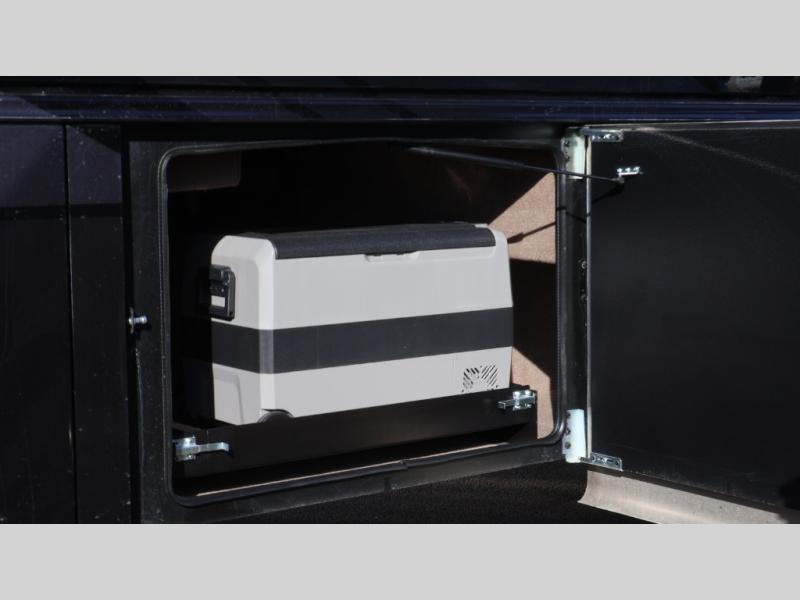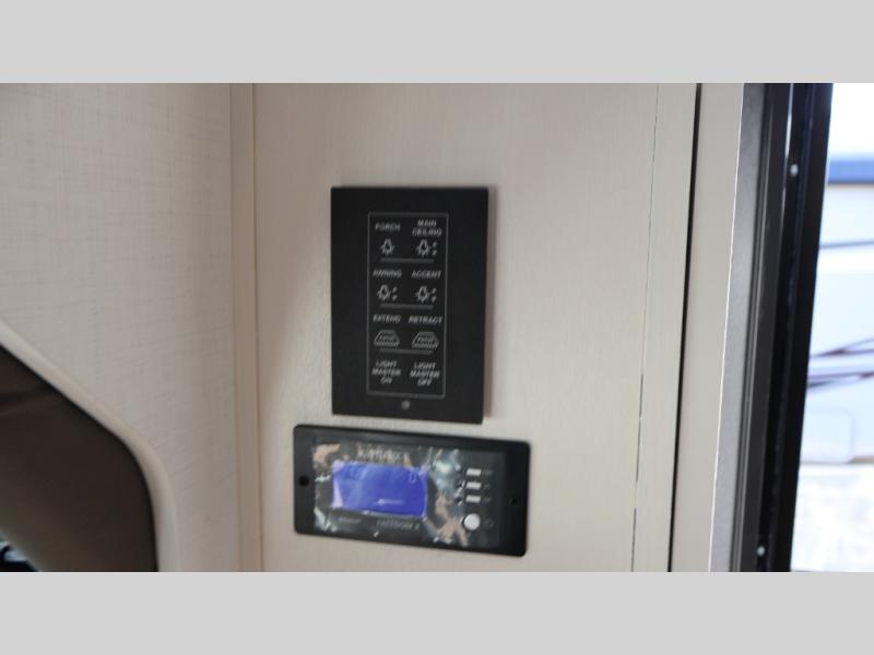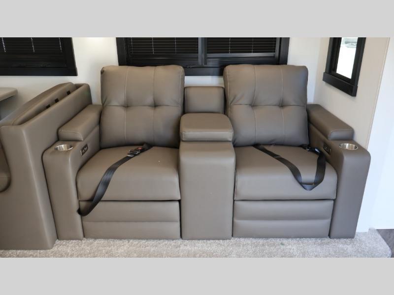 If you liked the Accolade model 37L, but don't need the extra sleeping space from the bunks, this 37M Accolade coach is perfect for you! You'll still have the cab-over bunk, the full-wall slide, and the rear private bedroom. The power head lift king bed will allow you to sit up and read at night, or you may just want to watch a movie on the bedroom LED TV. The chef of your group can prepare meals on the two burner induction cooktop, or use the residential-size convection microwave, and there is a residential refrigerator just like at home. Relaxing each day will be a breeze with the power theater seating across from the 50" TV lift and second sofa, and you can dine at the booth dinette. There is also a hutch for added storage space, and an impressive 23' power awning with LED lights!