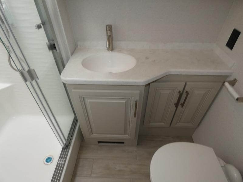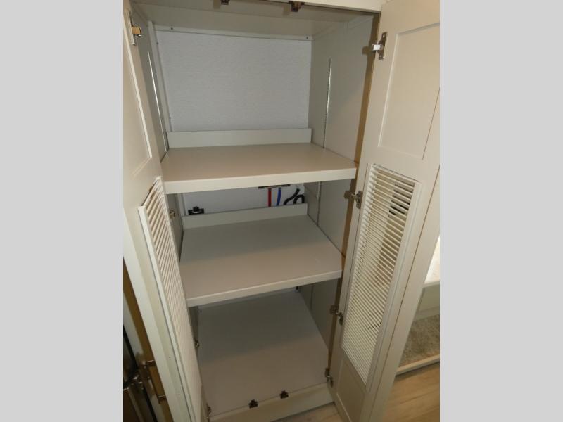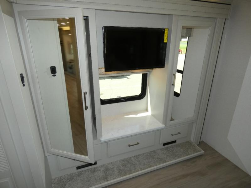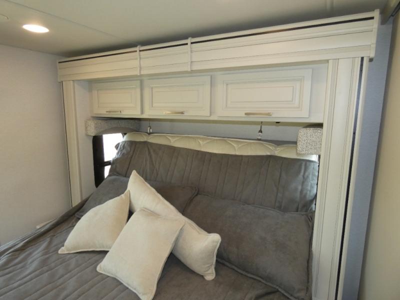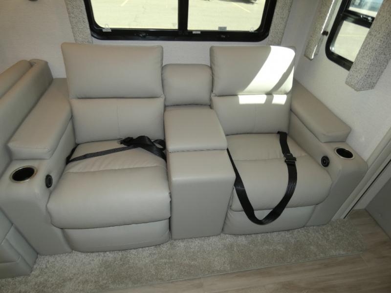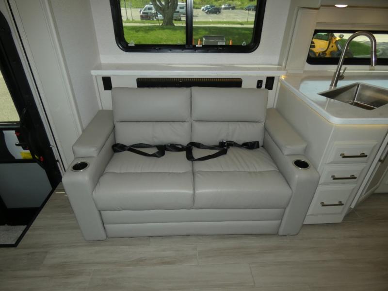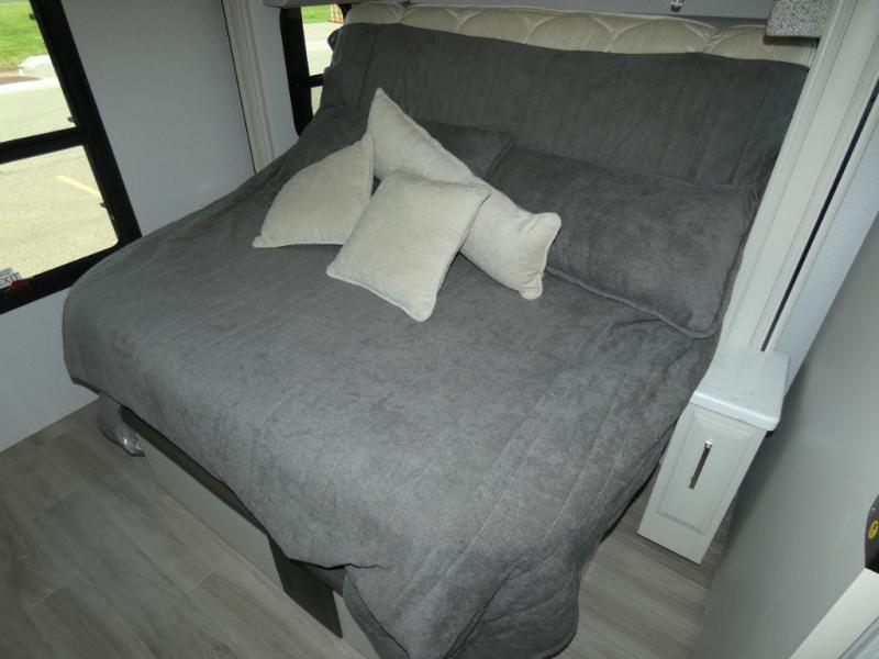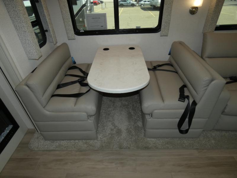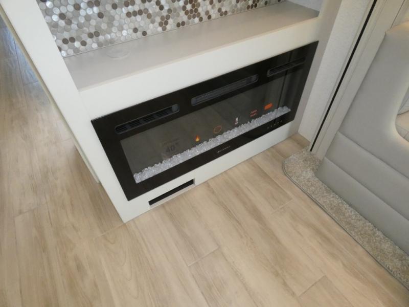 Pack your bags, pick your favorite spot on the map, and head out to a great adventure! There are plenty of sleeping spaces for everyone to have a good night's rest between the cabover bunk, the 72" x 80" power head lift king bed, the sofa and even the booth dinette once converted. You can keep your dishes safely stored in the hutch by the fireplace. You will also look your best too with the 30" x 36" shower and medicine cabinet mirror in the full bathroom!