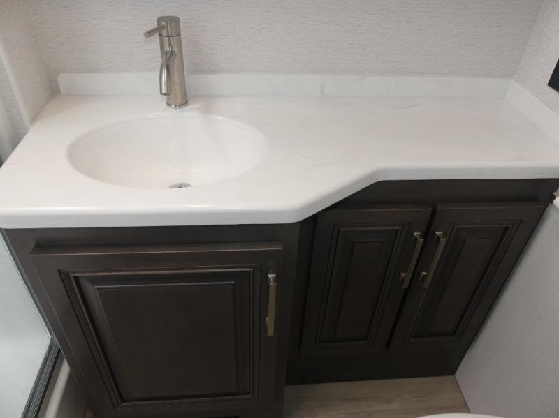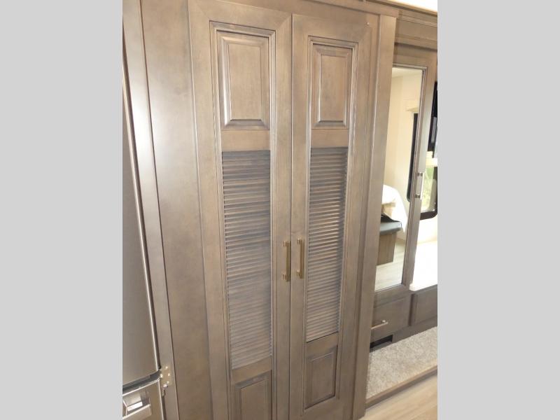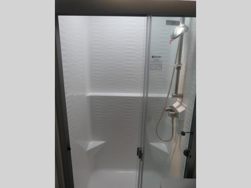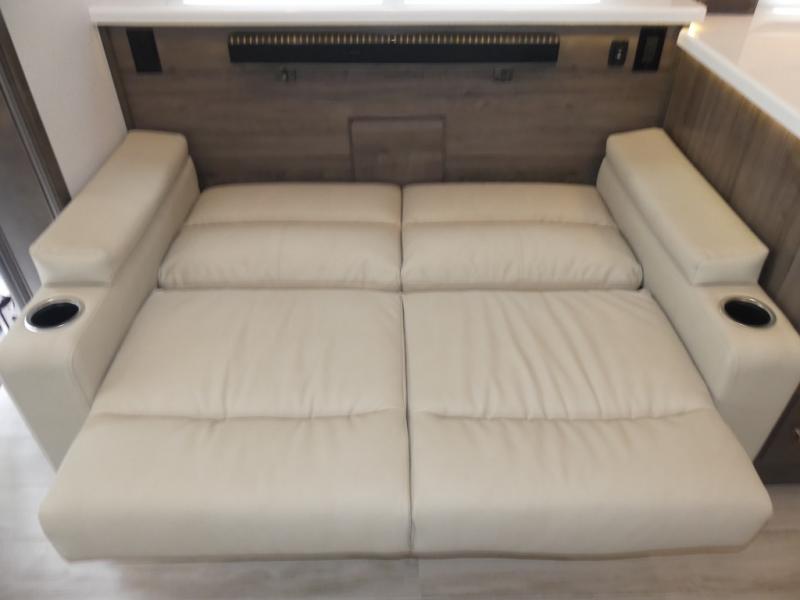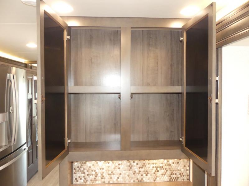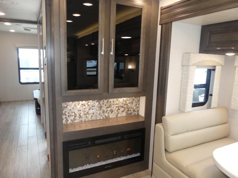 Pack your bags, pick your favorite spot on the map, and head out to a great adventure! There are plenty of sleeping spaces for everyone to have a good night's rest between the cabover bunk, the 72" x 80" power head lift king bed, the sofa and even the booth dinette once converted. There is also power theater seating that can be switched out for an optional 72" hide-a-bed sofa if you need more sleeping spaces. You can keep your dishes safely stored in the hutch by the fireplace. Next to the stainless steel residential refrigerator is an area prepped to add an optional stacked washer and dryer to keep your clothes looking their best. You will also look your best too with the 30" x 36" shower and medicine cabinet mirror in the full bathroom!