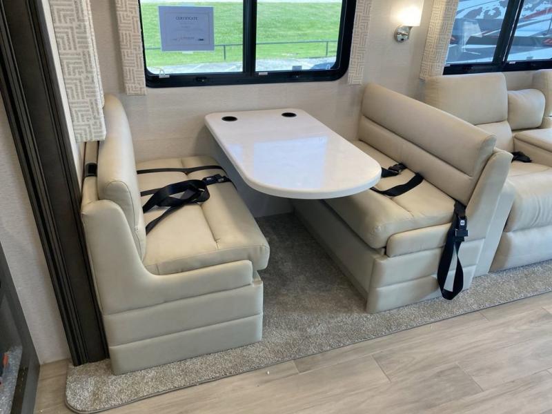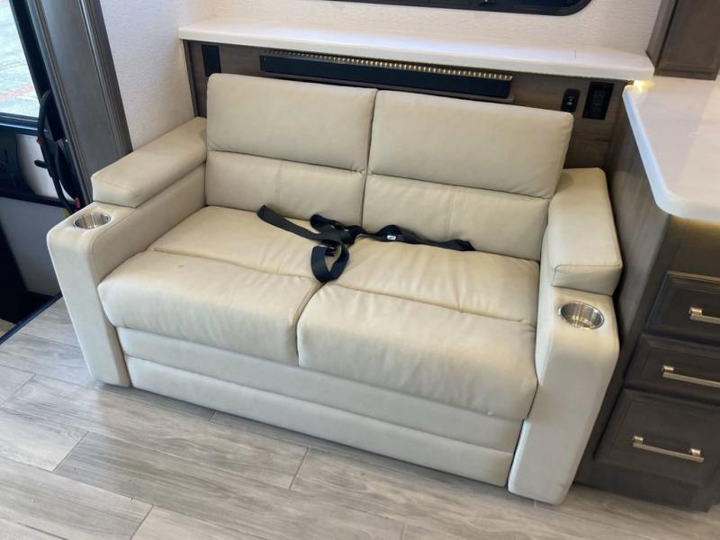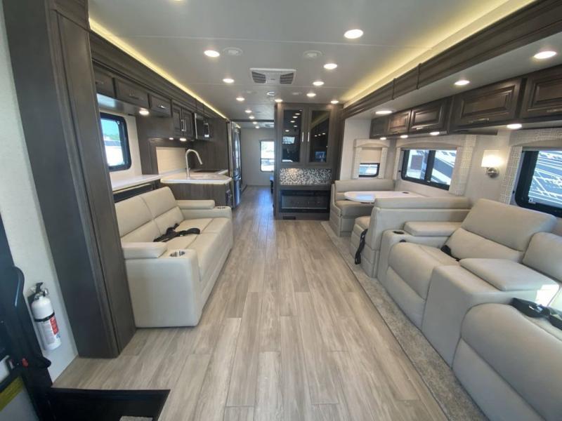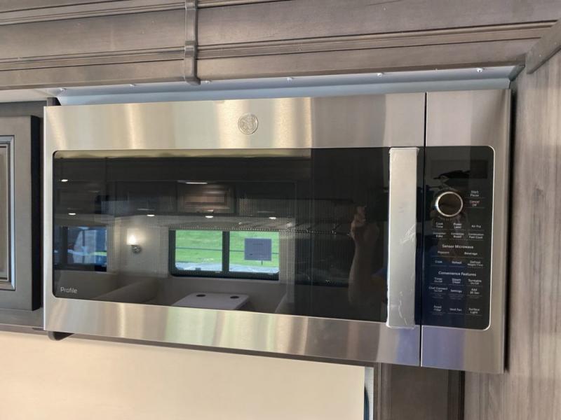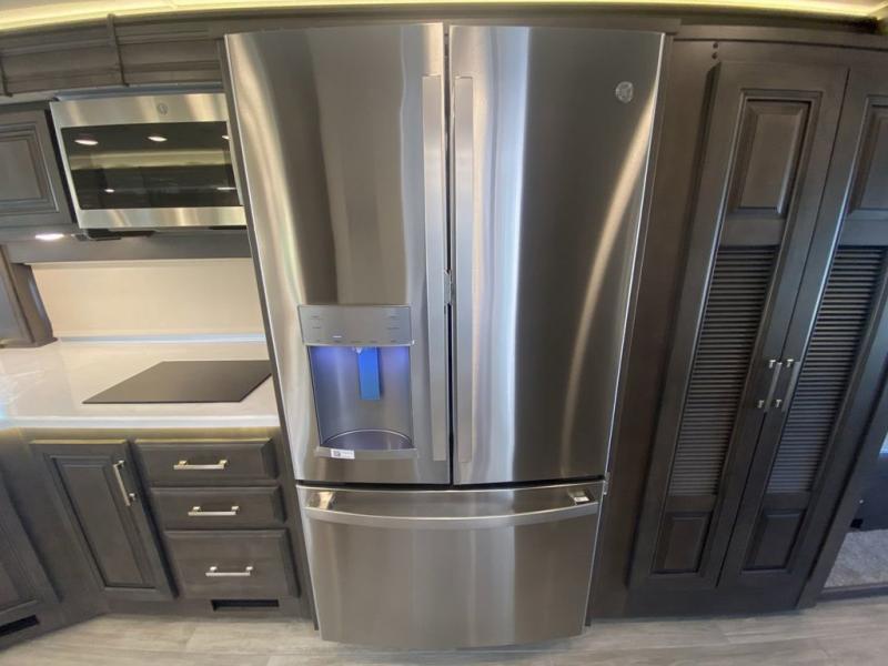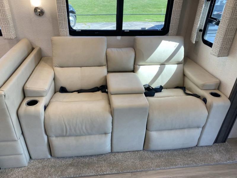 Pack your bags, pick your favorite spot on the map, and head out to a great adventure! There are plenty of sleeping spaces for everyone to have a good night's rest between the cabover bunk, the 72" x 80" power head lift king bed, the sofa and even the booth dinette once converted. There is also power theater seating that can be switched out for an optional 72" hide-a-bed sofa if you need more sleeping spaces. You can keep your dishes safely stored in the hutch by the fireplace. Next to the stainless steel residential refrigerator is an area prepped to add an optional stacked washer and dryer to keep your clothes looking their best. You will also look your best too with the 30" x 36" shower and medicine cabinet mirror in the full bathroom!