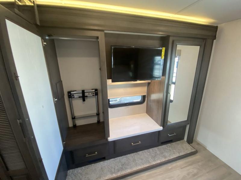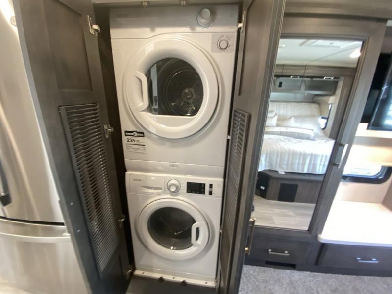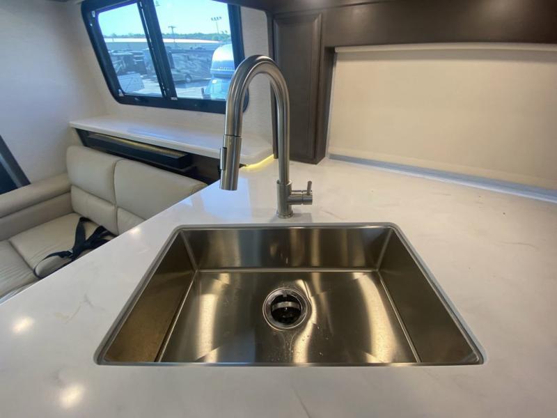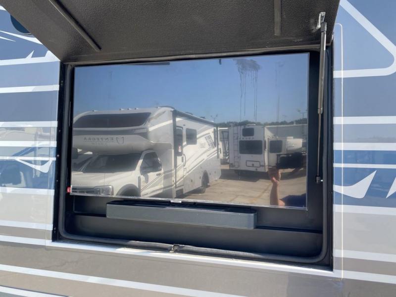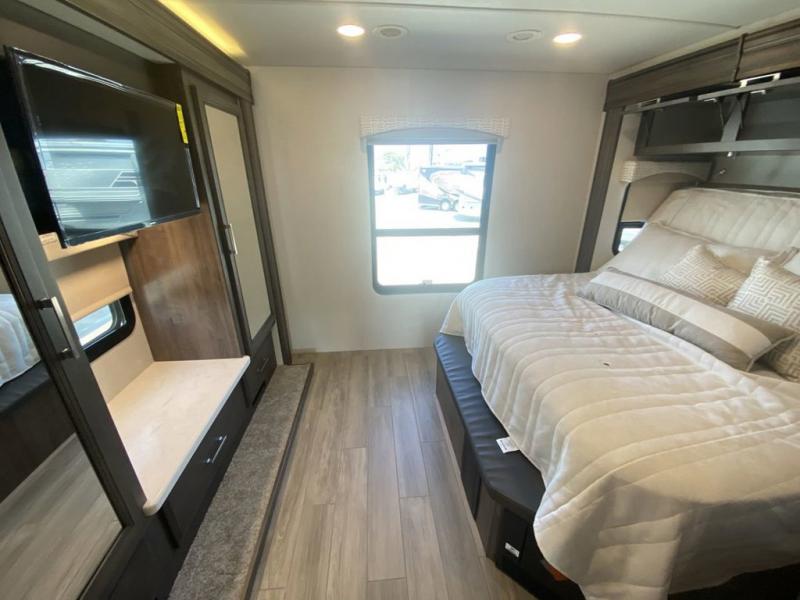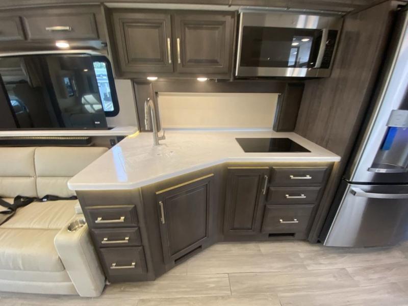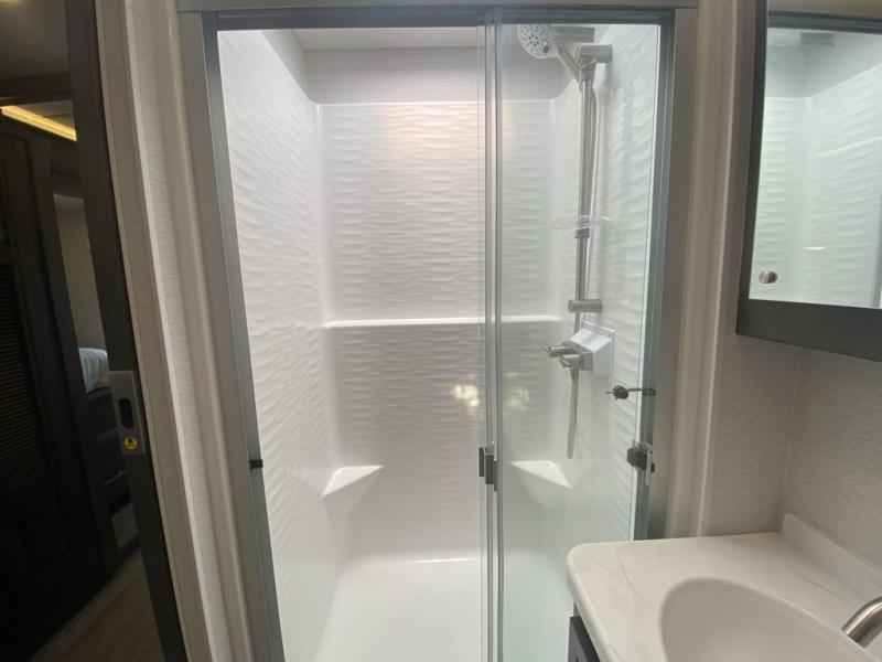 Pack your bags, pick your favorite spot on the map, and head out to a great adventure! There are plenty of sleeping spaces for everyone to have a good night's rest between the cabover bunk, the 72" x 80" power head lift king bed, the sofa and even the booth dinette once converted. There is also power theater seating that can be switched out for an optional 72" hide-a-bed sofa if you need more sleeping spaces. You can keep your dishes safely stored in the hutch by the fireplace. Next to the stainless steel residential refrigerator is an area prepped to add an optional stacked washer and dryer to keep your clothes looking their best. You will also look your best too with the 30" x 36" shower and medicine cabinet mirror in the full bathroom!