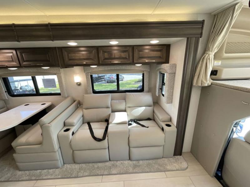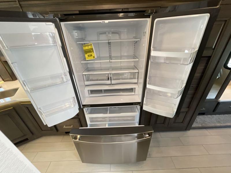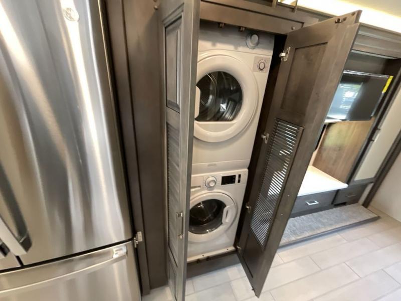 Pack your bags, pick your favorite spot on the map, and head out to a great adventure! There are plenty of sleeping spaces for everyone to have a good night's rest between the cabover bunk, the 72" x 80" power head lift king bed, the sofa and even the booth dinette once converted. There is also power theater seating that can be switched out for an optional 72" hide-a-bed sofa if you need more sleeping spaces. You can keep your dishes safely stored in the hutch by the fireplace. Next to the stainless steel residential refrigerator is an area prepped to add an optional stacked washer and dryer to keep your clothes looking their best. You will also look your best too with the 30" x 36" shower and medicine cabinet mirror in the full bathroom!