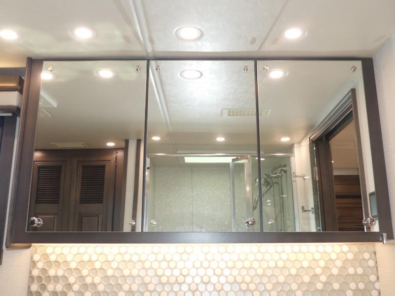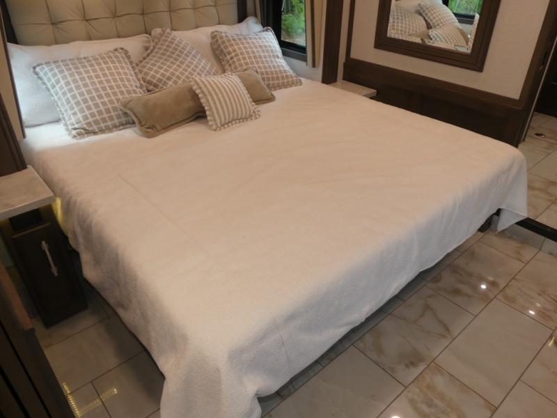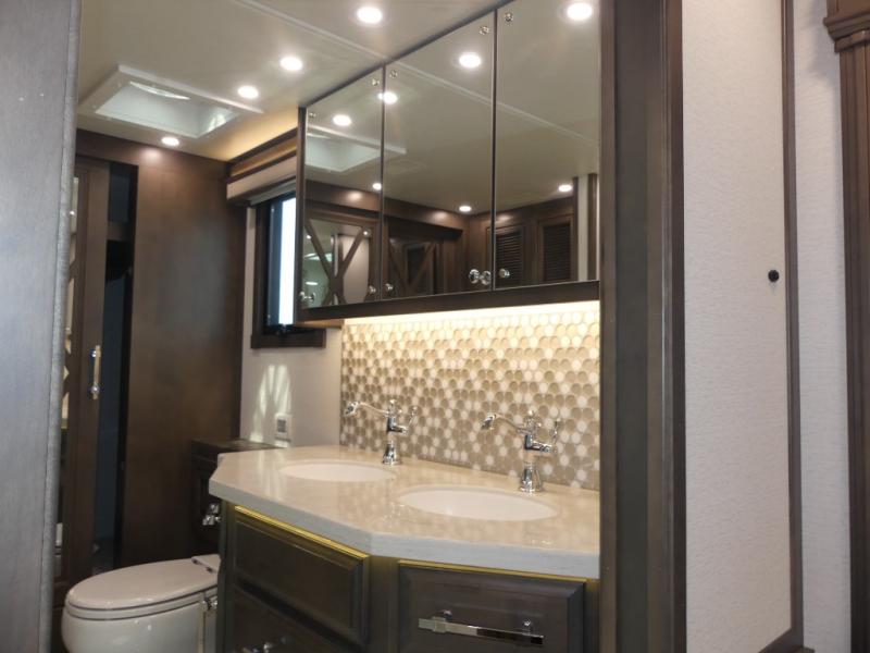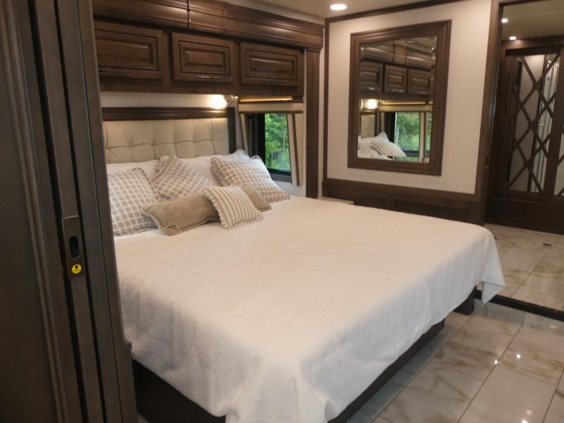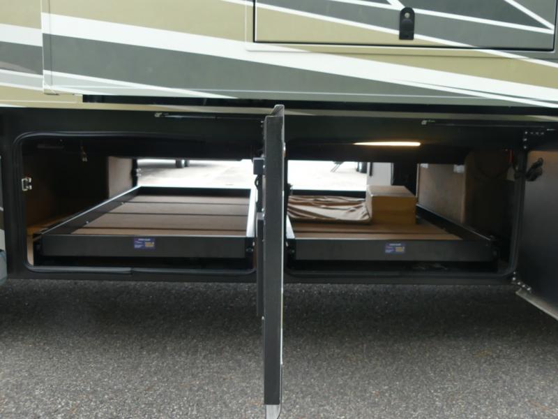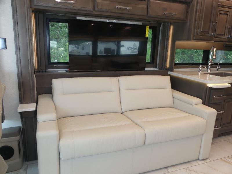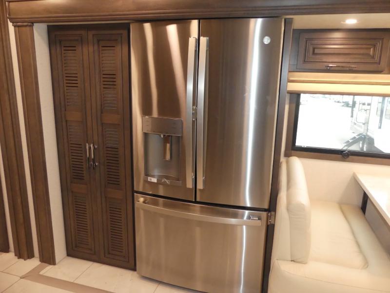 With any Anthem Class A diesel motorhome by Entegra Coach, setting up camp has never been easier with the 15-inch digital dash displaying an integrated 360-degree surround view system with fourteen smart radar sensors and six HD cameras plus the Valid air leveling system. Each roof is constructed with arched aluminum trusses filled with batt insulation and reflective Flexfoil topped with plywood decking then one-piece fiberglass, exterior walls with Aluma-Tru welded tubular aluminum studs, insulated front and rear caps, and X-Bridge bracing welded into the chassis frame. The interior provides the Firefly multiplex system with 10-inch VegaTouch touchscreen for complete integration of the coach controls with remote monitoring and control from the available mobile app, a decorative ceiling feature with integrated accent lighting, powered solar day and blackout night shades, and Aire-Secure travel locks for all pocket doors!