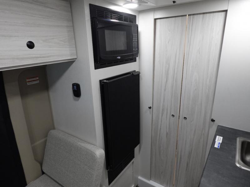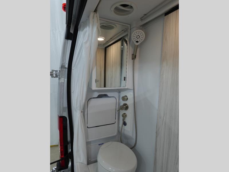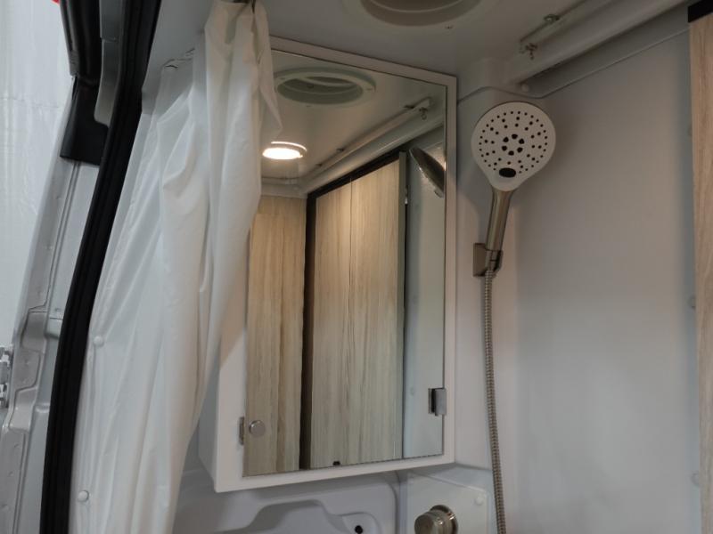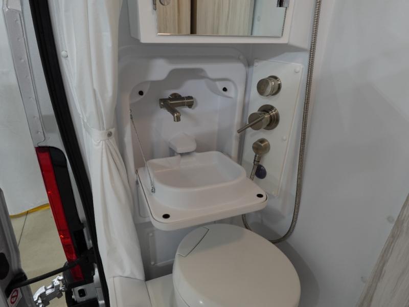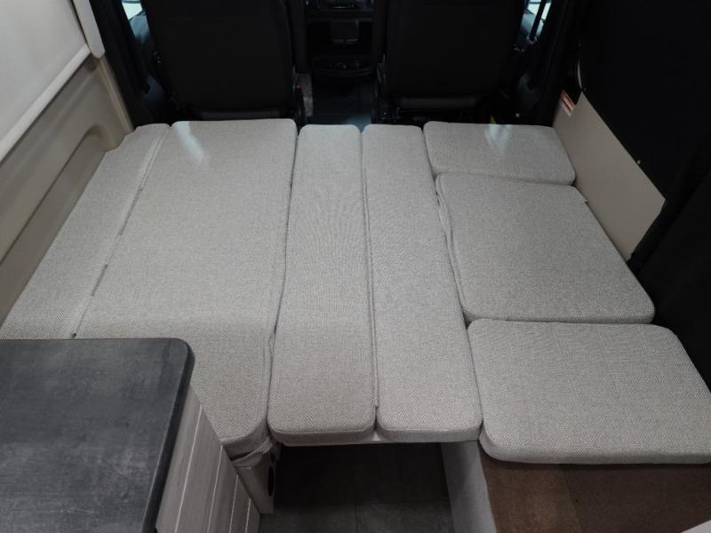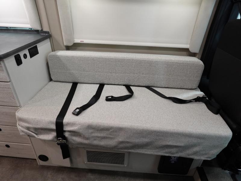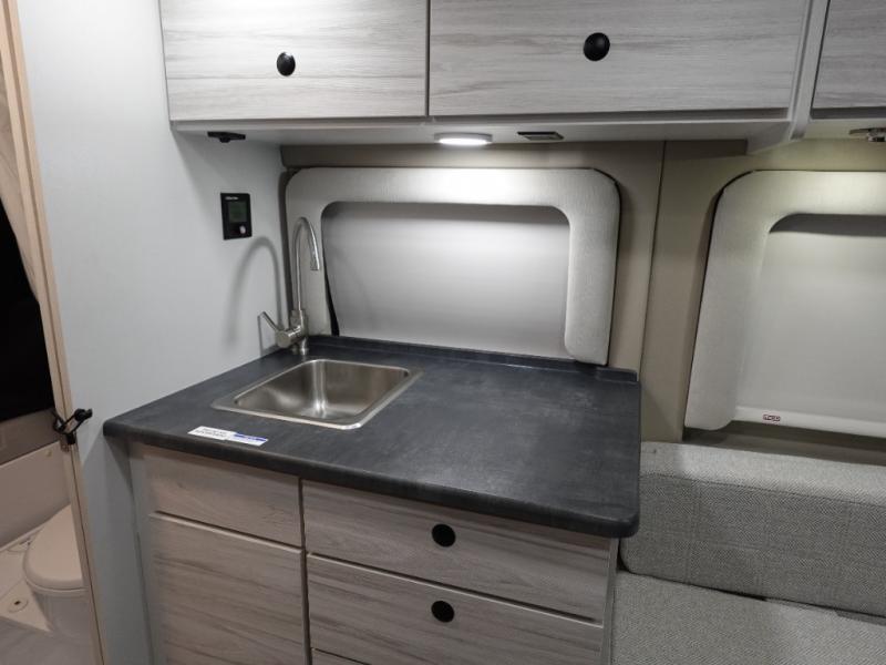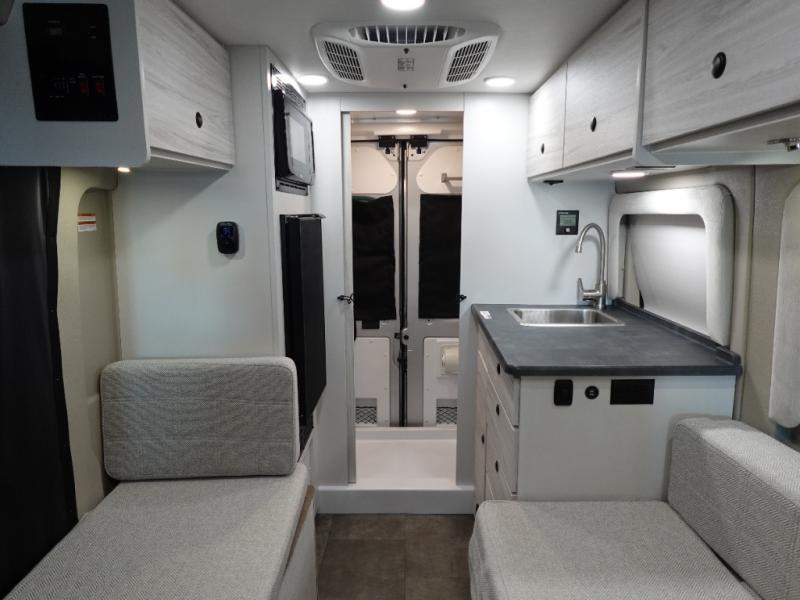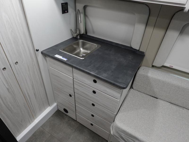 Any trip in this camper van will be spent in comfort thanks to the convenient wet bath and full kitchen amenities. You can whip up a hearty breakfast on the portable induction cooktop or use the microwave oven. There is a stainless steel sink to clean up, and the pressed countertops will be easy to clean. After you've hiked for the day and gotten cleaned up in the rear wet bath, you can relax on the 54" sofa that will convert to a 54" x 72" bed. There is also a 27" bench seat for more seating space and plenty of overhead cabinets for personal belongings, board games and more.