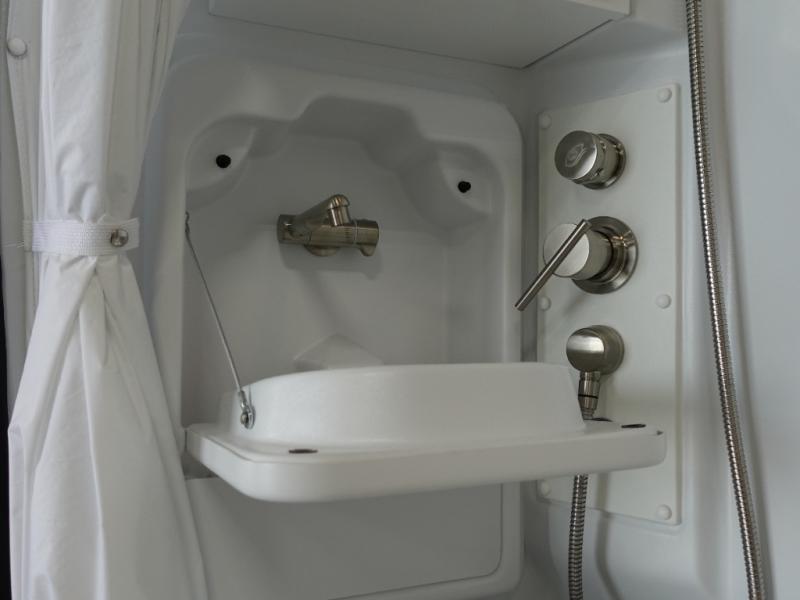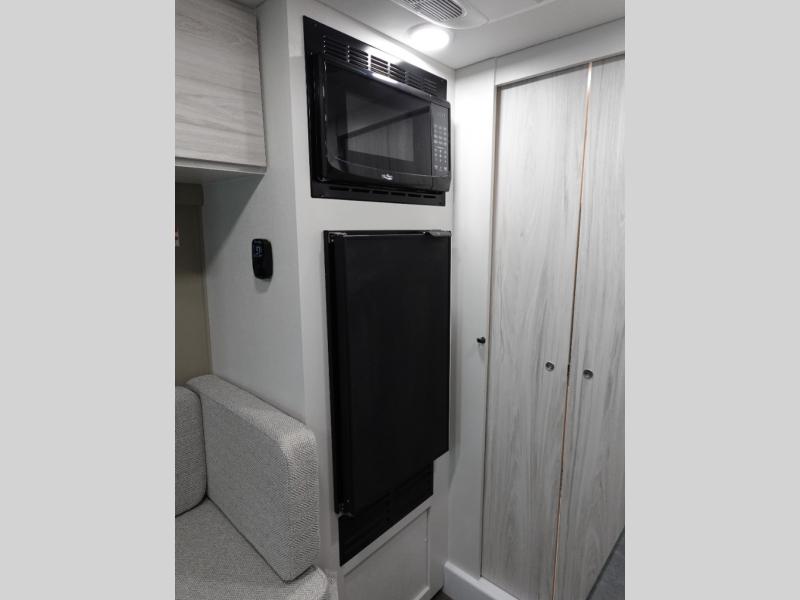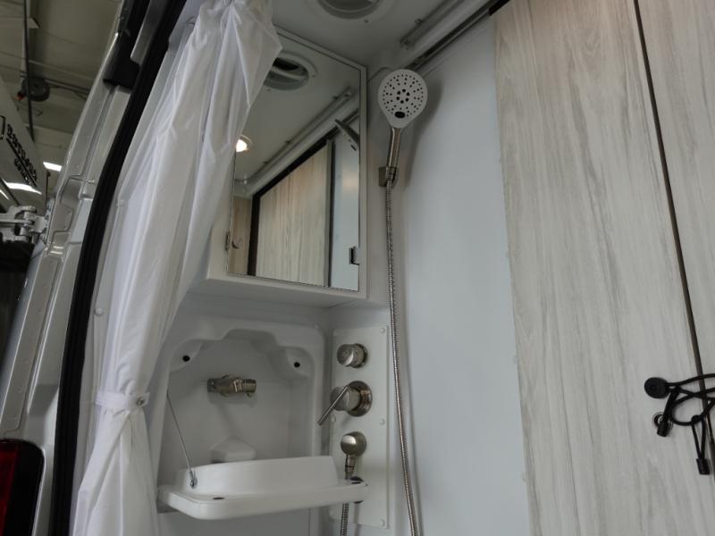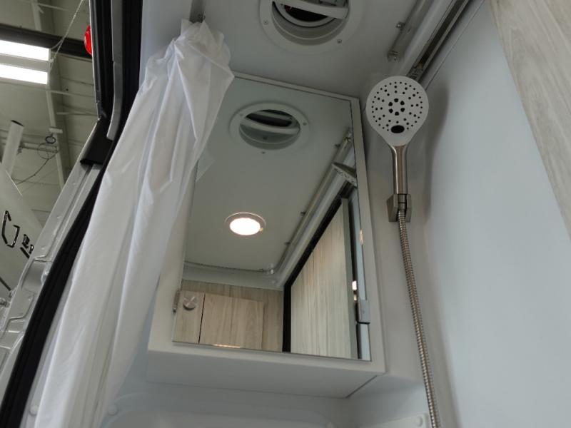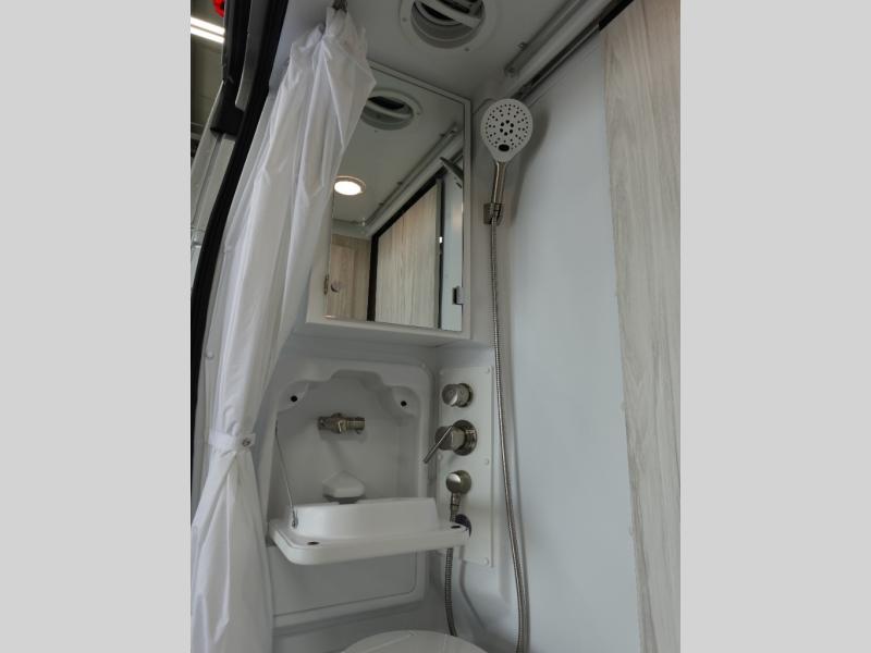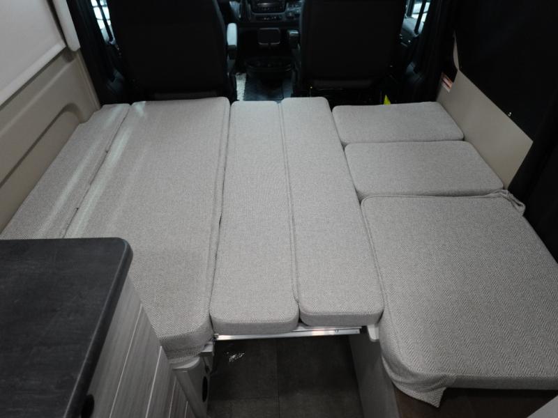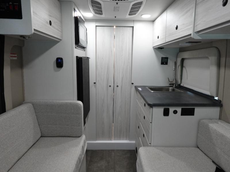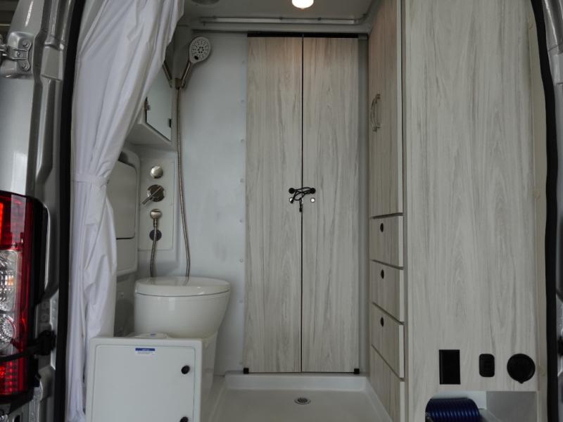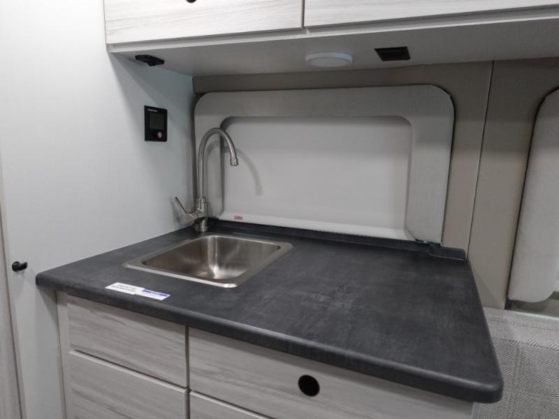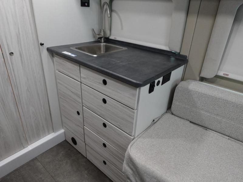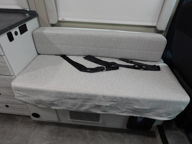 Any trip in this camper van will be spent in comfort thanks to the convenient wet bath and full kitchen amenities. You can whip up a hearty breakfast on the portable induction cooktop or use the microwave oven. There is a stainless steel sink to clean up, and the pressed countertops will be easy to clean. After you've hiked for the day and gotten cleaned up in the rear wet bath, you can relax on the 54" sofa that will convert to a 54" x 72" bed. There is also a 27" bench seat for more seating space and plenty of overhead cabinets for personal belongings, board games and more.
