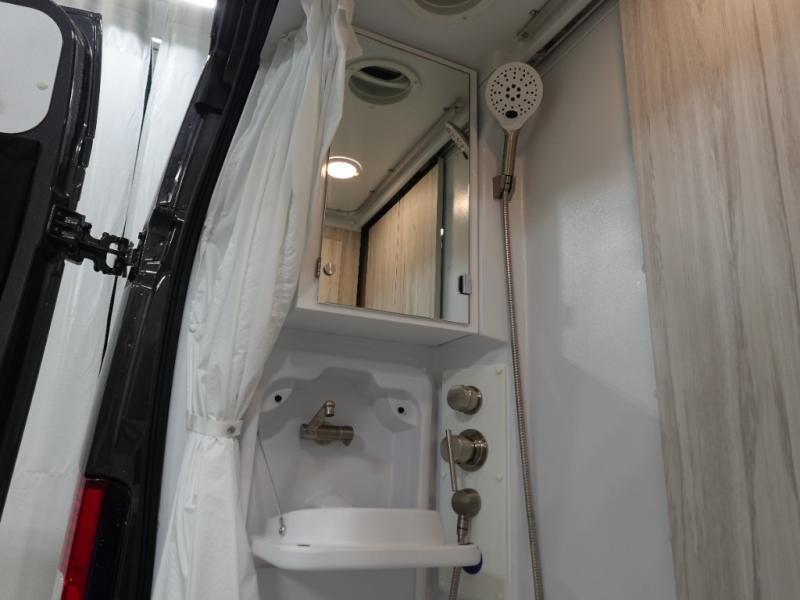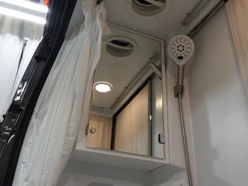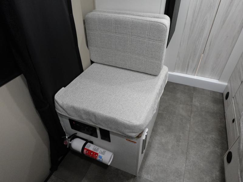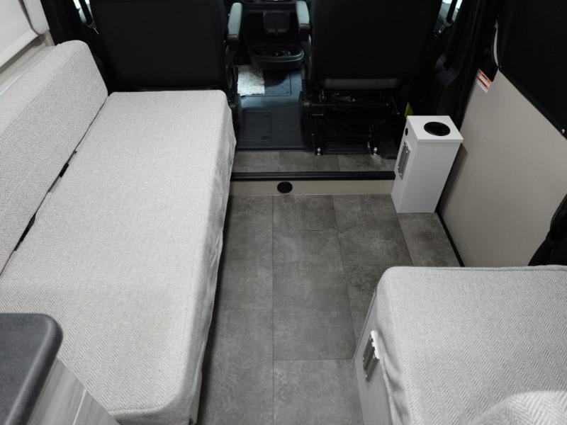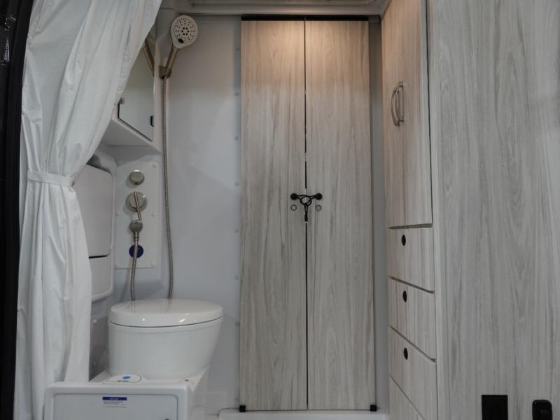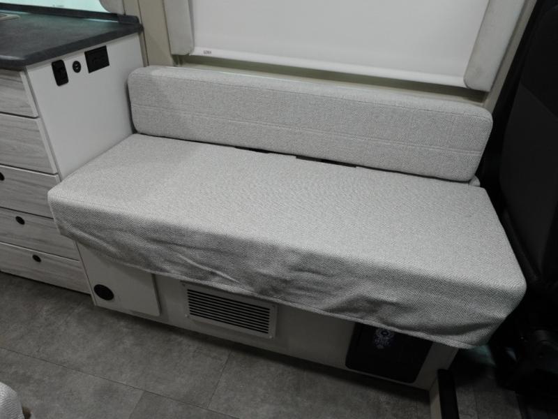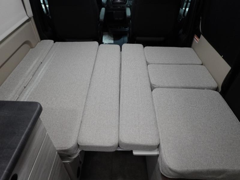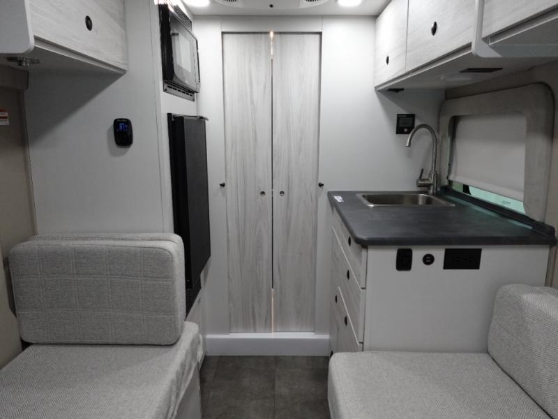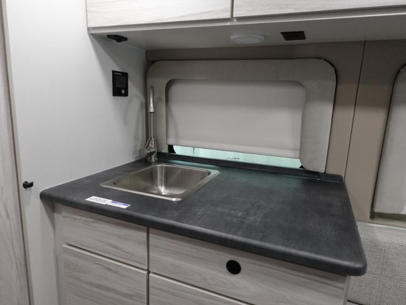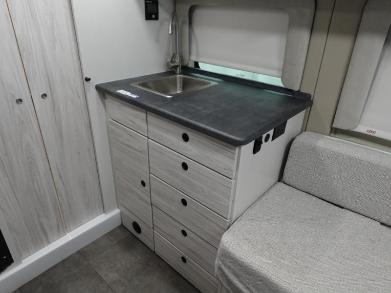 Any trip in this camper van will be spent in comfort thanks to the convenient wet bath and full kitchen amenities. You can whip up a hearty breakfast on the portable induction cooktop or use the microwave oven. There is a stainless steel sink to clean up, and the pressed countertops will be easy to clean. After you've hiked for the day and gotten cleaned up in the rear wet bath, you can relax on the 54" sofa that will convert to a 54" x 72" bed. There is also a 27" bench seat for more seating space and plenty of overhead cabinets for personal belongings, board games and more.