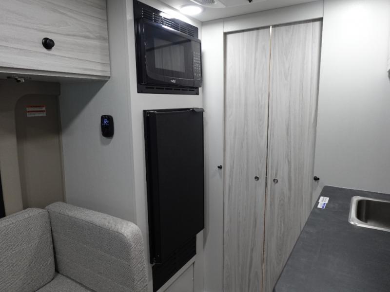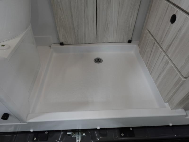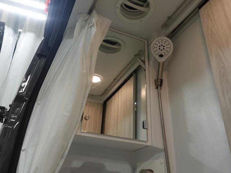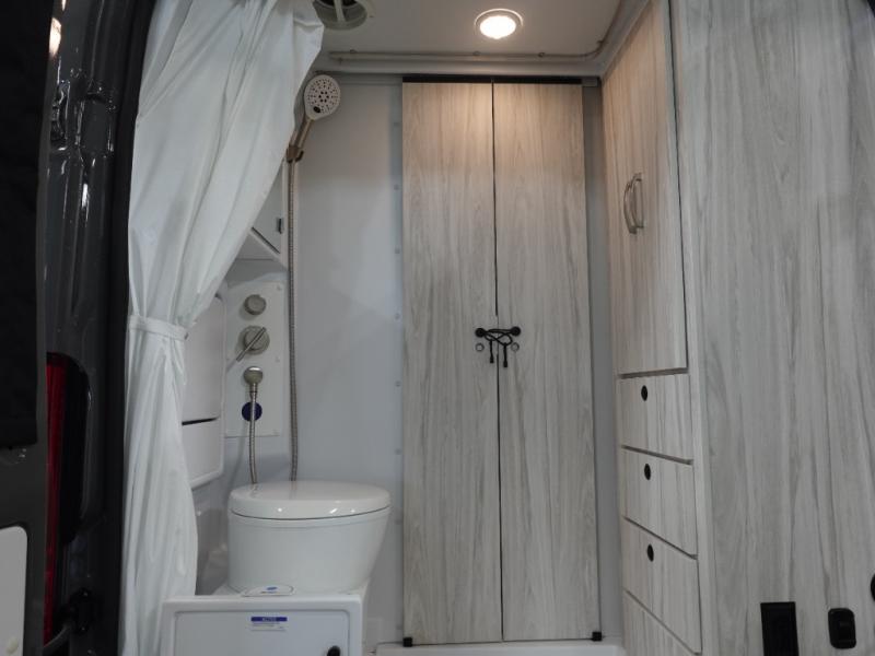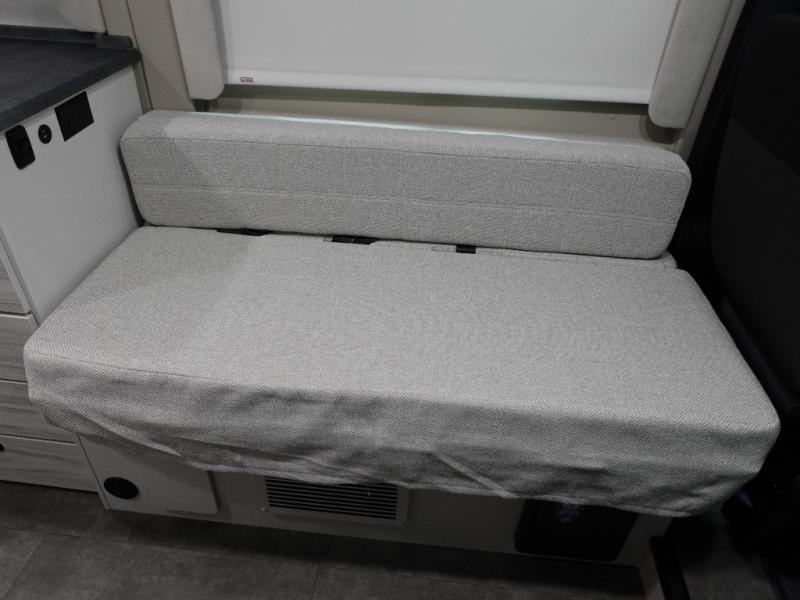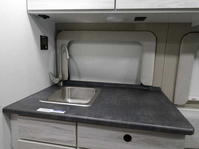 Any trip in this camper van will be spent in comfort thanks to the convenient wet bath and full kitchen amenities. You can whip up a hearty breakfast on the portable induction cooktop or use the microwave oven. There is a stainless steel sink to clean up, and the pressed countertops will be easy to clean. After you've hiked for the day and gotten cleaned up in the rear wet bath, you can relax on the 54" sofa that will convert to a 54" x 72" bed. There is also a 27" bench seat for more seating space and plenty of overhead cabinets for personal belongings, board games and more.