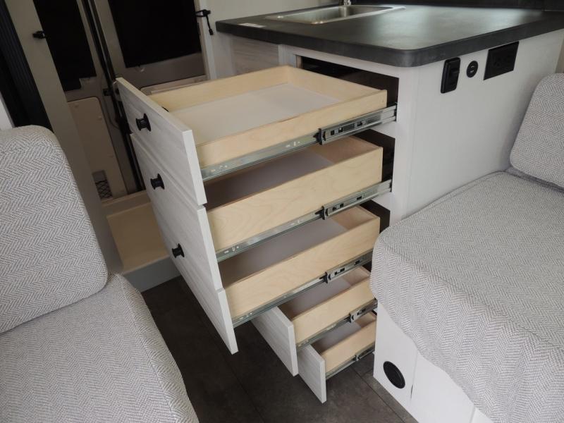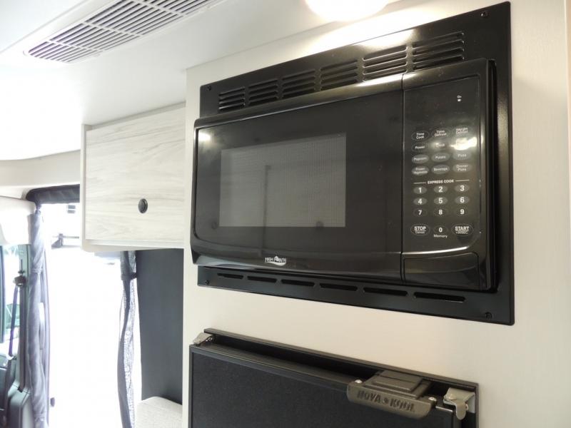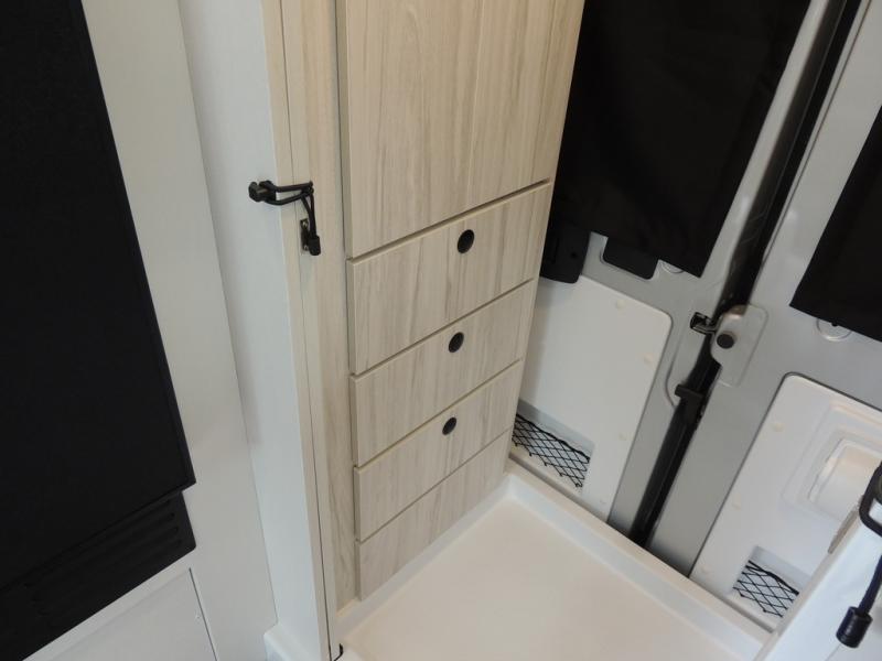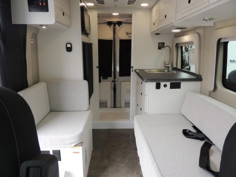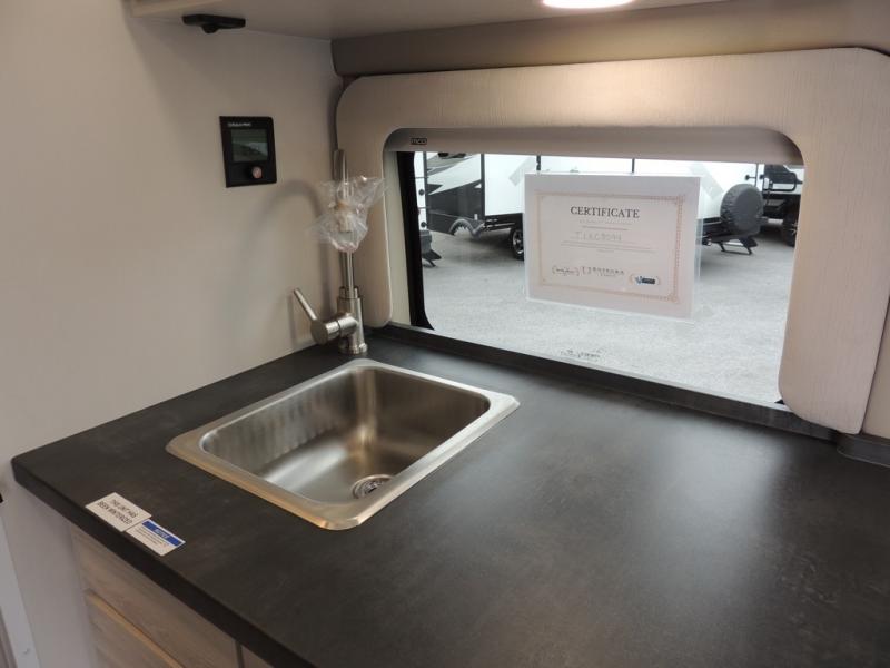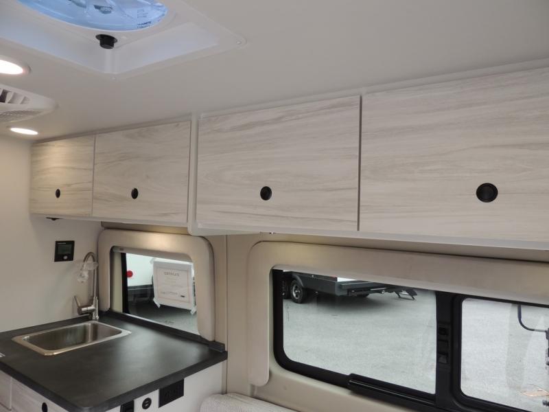 Any trip in this camper van will be spent in comfort thanks to the convenient wet bath and full kitchen amenities. You can whip up a hearty breakfast on the portable induction cooktop or use the microwave oven. There is a stainless steel sink to clean up, and the pressed countertops will be easy to clean. After you've hiked for the day and gotten cleaned up in the rear wet bath, you can relax on the 54" sofa that will convert to a 54" x 72" bed. There is also a 27" bench seat for more seating space and plenty of overhead cabinets for personal belongings, board games and more.