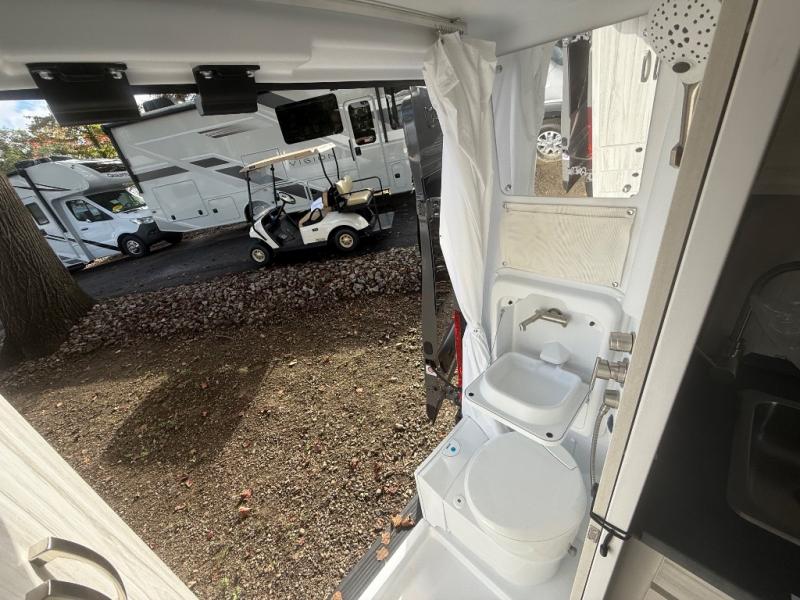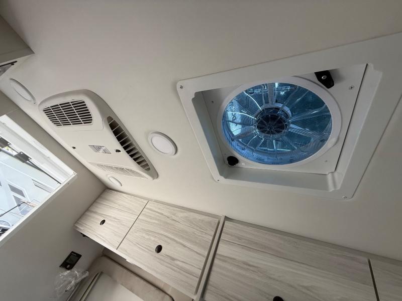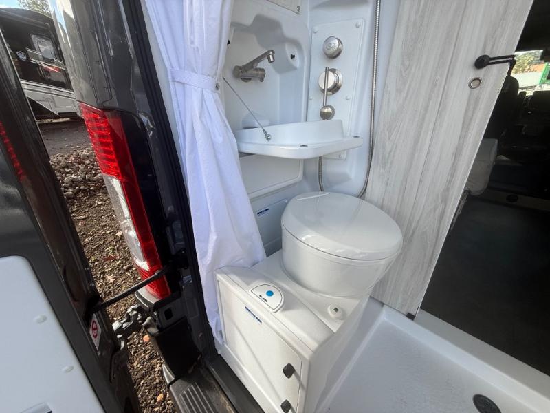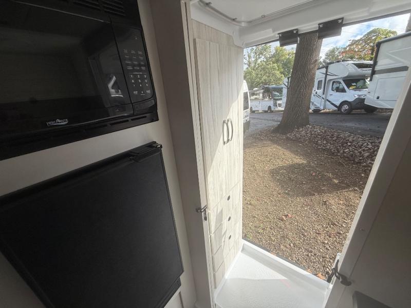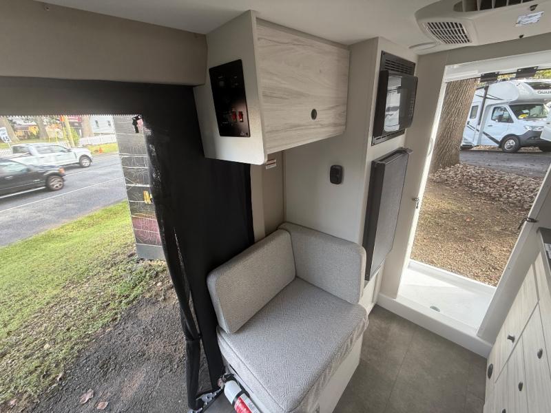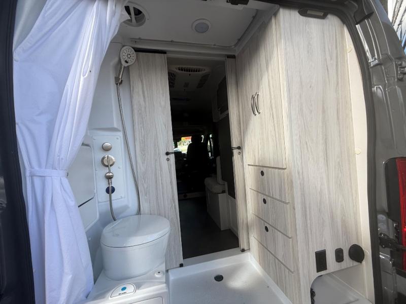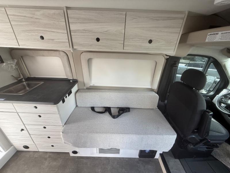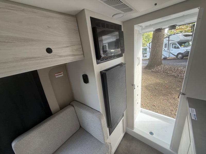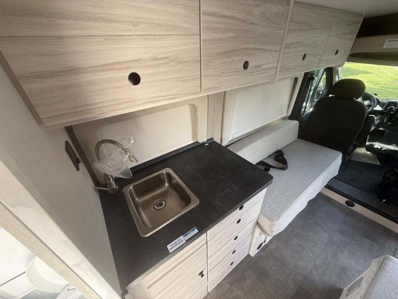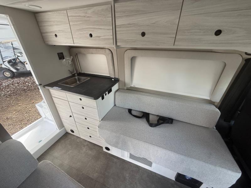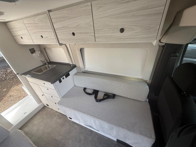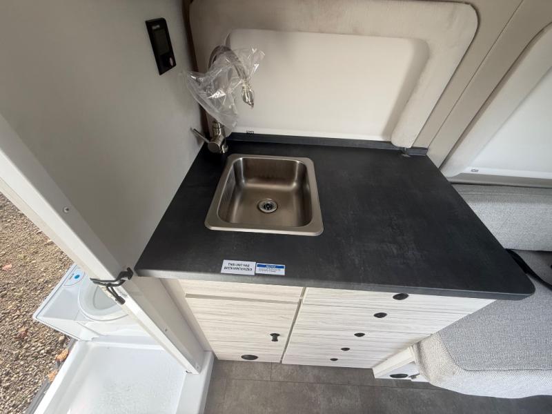 Any trip in this camper van will be spent in comfort thanks to the convenient wet bath and full kitchen amenities. You can whip up a hearty breakfast on the portable induction cooktop or use the microwave oven. There is a stainless steel sink to clean up, and the pressed countertops will be easy to clean. After you've hiked for the day and gotten cleaned up in the rear wet bath, you can relax on the 54" sofa that will convert to a 54" x 72" bed. There is also a 27" bench seat for more seating space and plenty of overhead cabinets for personal belongings, board games and more.