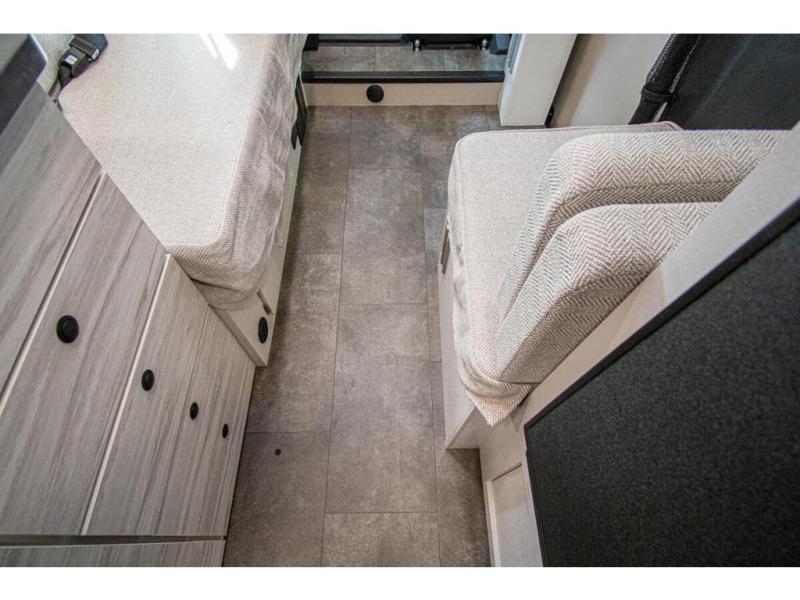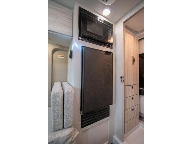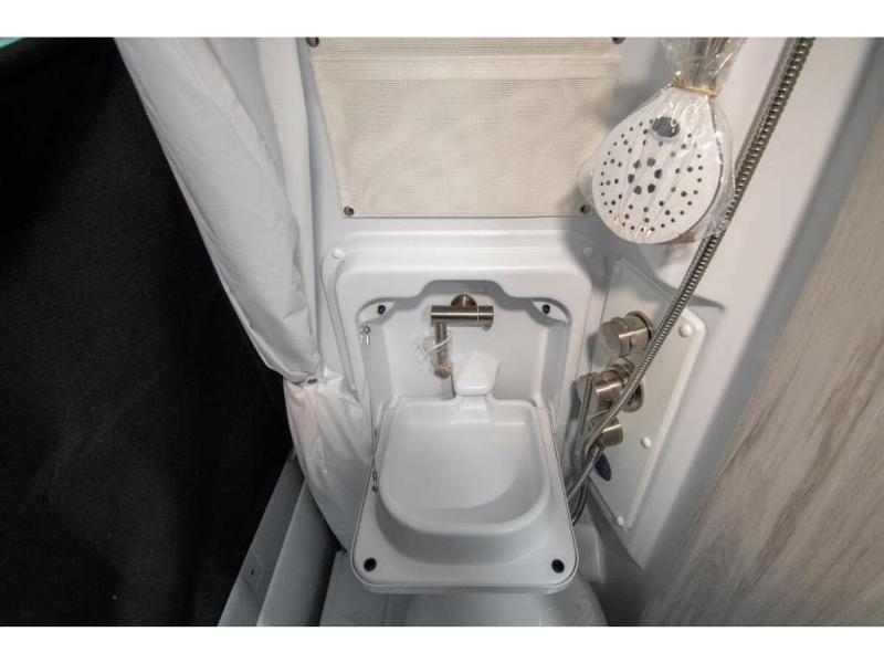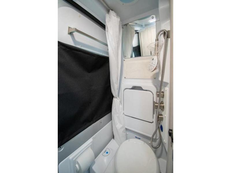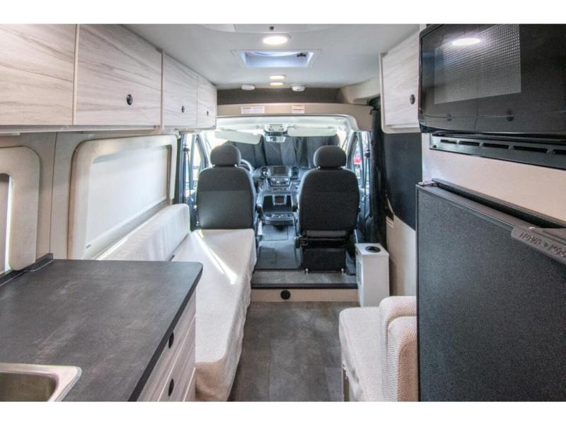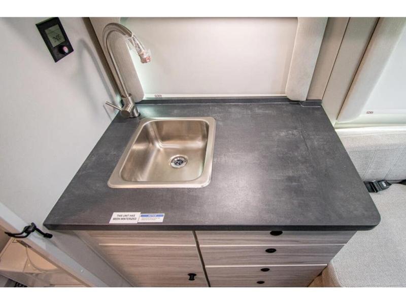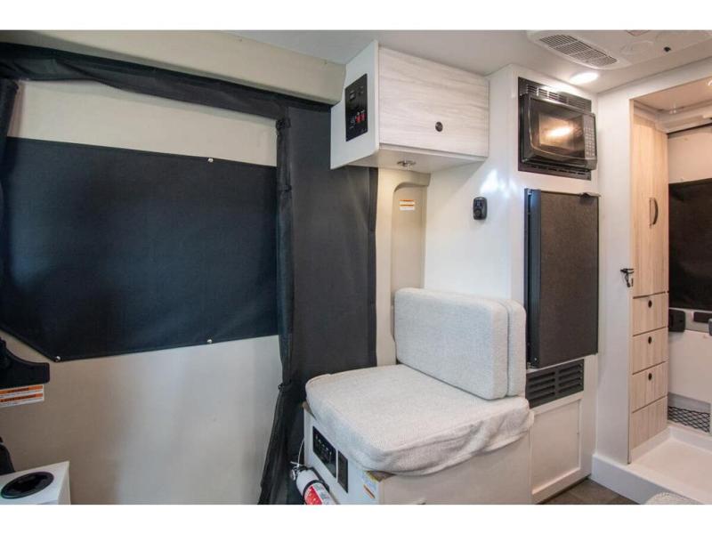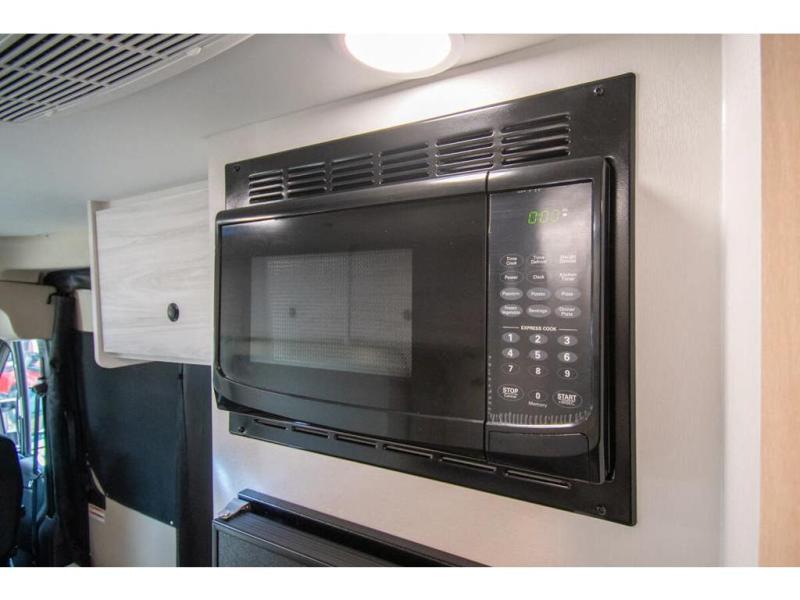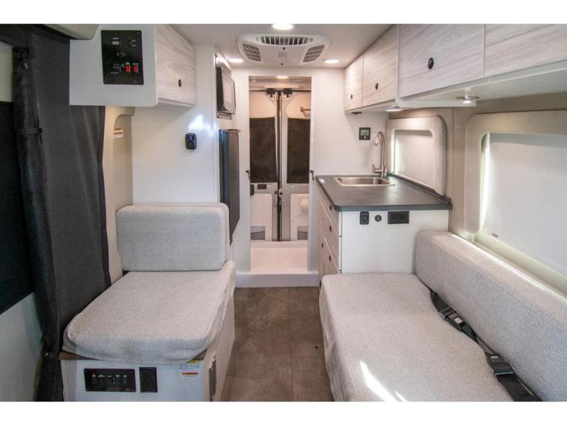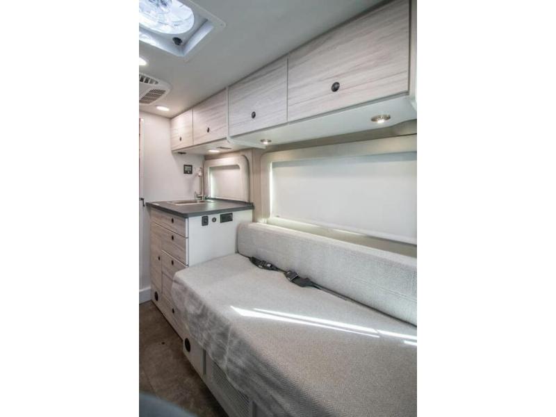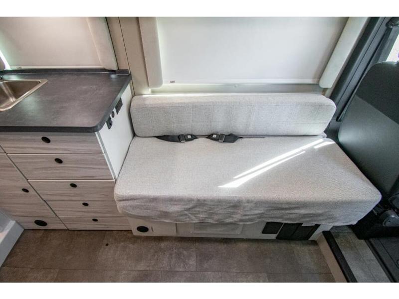 Any trip in this camper van will be spent in comfort thanks to the convenient wet bath and full kitchen amenities. You can whip up a hearty breakfast on the portable induction cooktop or use the microwave oven. There is a stainless steel sink to clean up, and the pressed countertops will be easy to clean. After you've hiked for the day and gotten cleaned up in the rear wet bath, you can relax on the 54" sofa that will convert to a 54" x 72" bed. There is also a 27" bench seat for more seating space and plenty of overhead cabinets for personal belongings, board games and more.