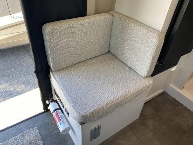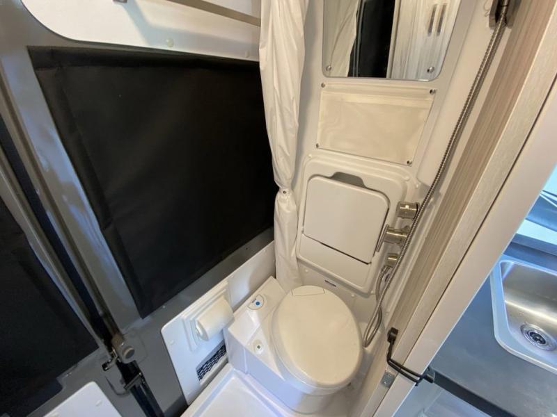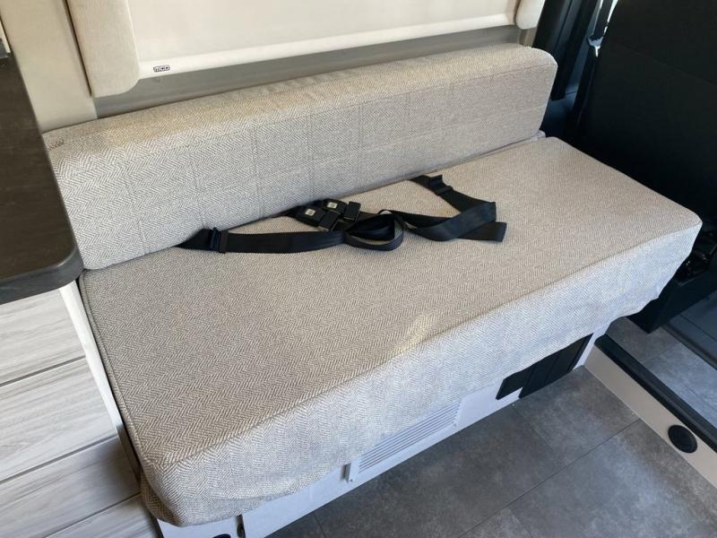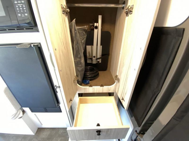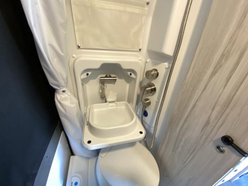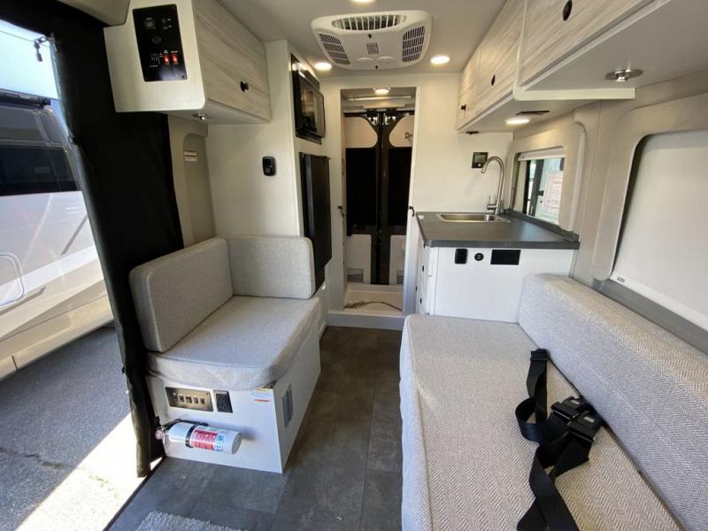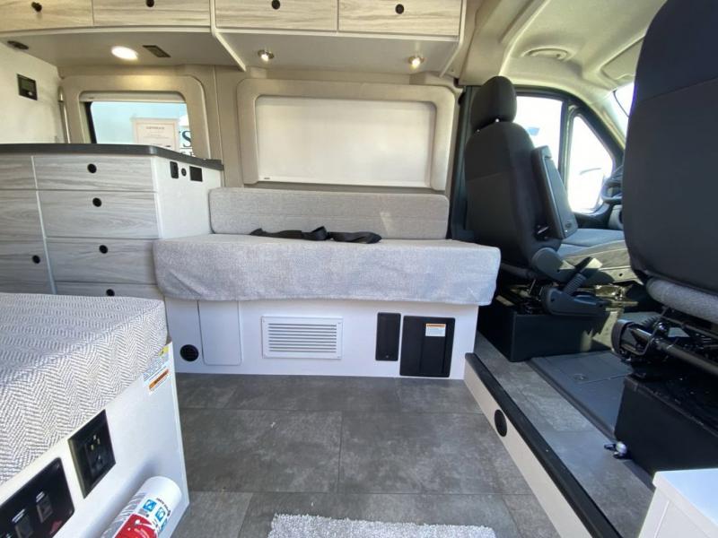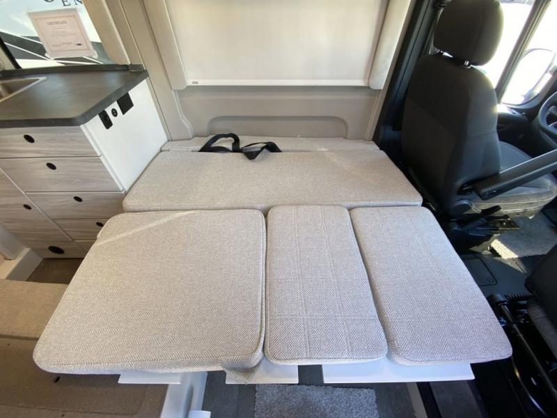 Any trip in this camper van will be spent in comfort thanks to the convenient wet bath and full kitchen amenities. You can whip up a hearty breakfast on the portable induction cooktop or use the microwave oven. There is a stainless steel sink to clean up, and the pressed countertops will be easy to clean. After you've hiked for the day and gotten cleaned up in the rear wet bath, you can relax on the 54" sofa that will convert to a 54" x 72" bed. There is also a 27" bench seat for more seating space and plenty of overhead cabinets for personal belongings, board games and more.