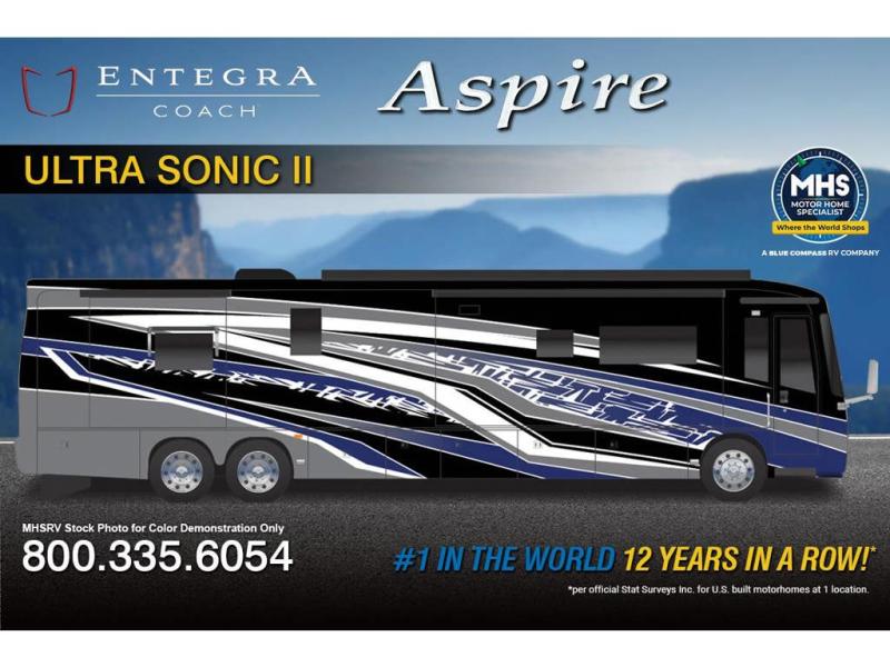 With any Aspire Class A diesel motorhome by Entegra Coach you will enjoy a smooth ride thanks to the Spartan K2 raised-rail chassis, the independent front suspension, and the E-Z Steer adjustable power steering assist. The leather captain's seats include 6-way power adjustment, lumbar and footrest functions that will have you sitting in the lap of luxury, plus there is a Valid Truline air leveling system with auxiliary air compressor for a smooth ride and easy set up. You'll find many high-end features inside, including a Teakwood shower seat in the bath, a decorative ceiling feature, solid surface countertops with dimmable LED accent lighting, and premium Crown Compass furniture. The Aspire also features exterior amenities that will make being on the road easier than ever. The push-button, power-unlatching baggage doors let you unload in record-time, and the Girard awnings will provide tons of shade to relax outdoors. A few new features you are sure to enjoy include a portable Shark vacuum cleaner, a Splendide washer and dryer, plus a filtered water dispenser at the kitchen sink!