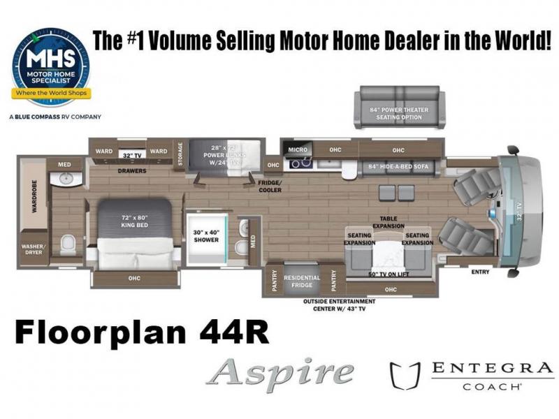 MSRP $739,313 All New 2026 Entegra Aspire Model 44R Bath & 1/2 Bunk Model rides on a Spartan K2 tag axle chassis with IFS featuring Entegra’s exclusive X-Bridge framing and is powered by a Cummins® L9 turbocharged 450 HP engine with 1,250 lb.-ft. torque at 1,400 RPM and an Allison 3000 series transmission. This luxury bath & 1/2 bunk model diesel motor coach measures approximately 44 feet 11 inches in length and is backed by Entegra Coach's superior 2-Year/24K Mile Limited Coach & 5-Year Limited Structural Warranties. New for 2026 on the Aspire is the larger square-shaped windows with wood framed valances and a leather accent, LED strip lighting in bed base and under the sofa/dinette cabinets, upgraded tile work in the entry well, GE convection microwave with air fryer and larger Samsung Smart TV in the bedroom. Options include the amazing stonewall gray cabinetry, tacoma shadow tile and blackout appearance package. Some of the standard features that really set the Entegra Aspire apart include the Valid 15” high brightness digital dash with quad core graphics processor and on-board diagnostics, Ramco 360° HD digital camera system, Aqua-Hot® 400D hydronic water and heating system with in-floor heat throughout, power tilt & telescoping steering wheel, Aqua View Showermi$er with “GREEN” technology saves fresh water, day and night shades throughout, solid-surface countertops with LED accent lighting, Girard window awnings & slide-out toppers, stainless steel refrigerator, Induction cook top with matching wood cover, LED marker and turn lights, DEF fill door, power rear engine door with push button control, Firefly multiplex system with 10” VegaTouch touchscreen for complete integration of coach controls, a 10,000 Onan diesel generator, Victron MultiPlus II 120V 3000VA pure sine inverter system with 7" digital LED information system, water softener prep, (3) 15K BTU roof A/C units with heat pumps, heated floors, 50 amp power cord reel, power water hose reel, GPS navigation system, frameless dual pane & tinted windows, automatic hydraulic leveling system, central vacuum, LED TV in bedroom, automatic generator start, Splendide stack washer/dryer, removed carpet on all slide floors, 360 degree birds' eye view camera system, LED TV in cab and much more. **Unit Not California CARB Compliant and Cannot be Registered in California**. Shop a huge selection of luxury diesel pusher motorhomes all at 1 location! Choose from American Coach Eagle – Dream – Entegra Coach Cornerstone – Anthem – Aspire – Fleetwood Palisade – Discovery LXE – Holiday Rambler Armada – Foretravel Realm – Foretravel Realm Presidential and more. We also buy and sell quality pre-owned models such Newmar King Aire – Essex – London Aire – Mountain Aire – Dutch Star - Tiffin Zephyr – Allegro Bus – Phaeton – Prevost Liberty Lady – Millennium - Marathon – Newell and much more. Visit MHSRV.com for our complete line-up and the sale prices that have made us the #1 volume selling motor home dealership in the world 12 years in a row! For additional details on this unit and our entire inventory including brochures, window sticker, videos, photos, reviews & testimonials as well as additional information about Motor Home Specialist and our manufacturers please visit us at MHSRV.com or call 800-335-6054. At Motor Home Specialist, we DO NOT charge any prep or orientation fees like you will find at other dealerships. All sale prices include a 200-point inspection, interior & exterior wash, detail service and a fully automated high-pressure rain booth test and coach wash that is a standout service unlike that of any other in the industry. You will also receive a thorough coach orientation with an MHSRV technician, a night stay in our delivery park featuring landscaped and covered pads with full hook-ups and much more! Read Thousands upon Thousands of 5-Star Reviews at MHSRV.com and See What They Had to Say About Their Experience at Motor Home Specialist. WHY PAY MORE? WHY SETTLE FOR LESS?