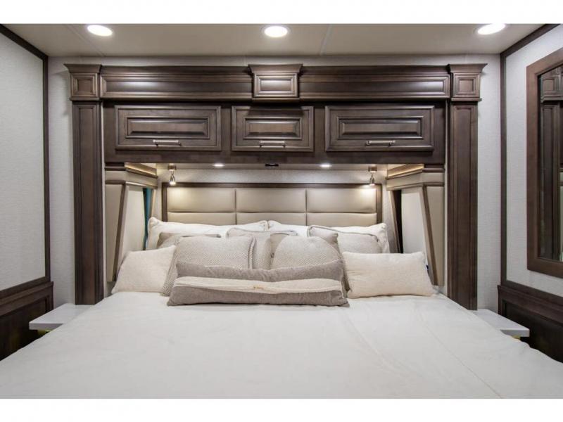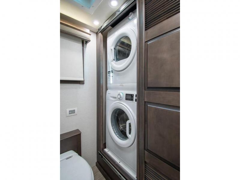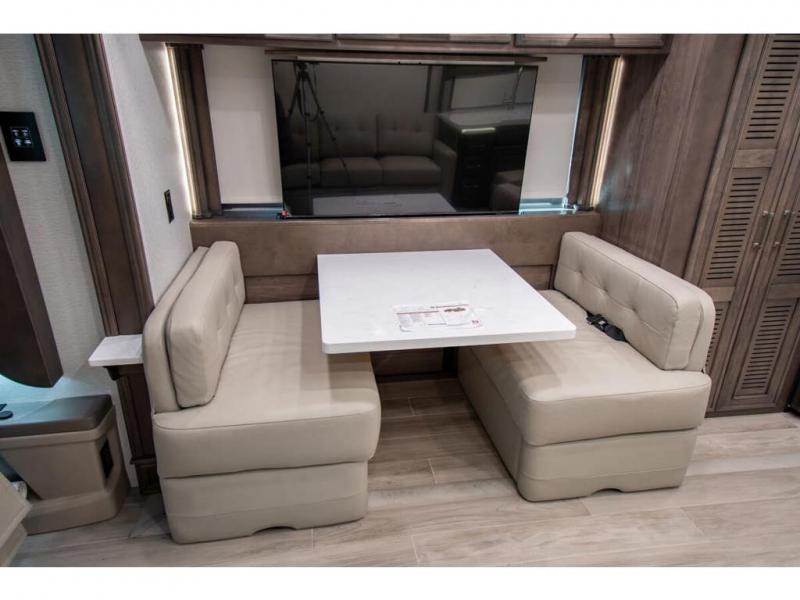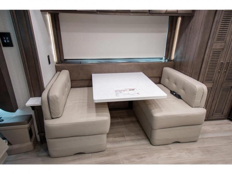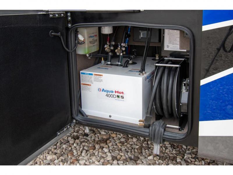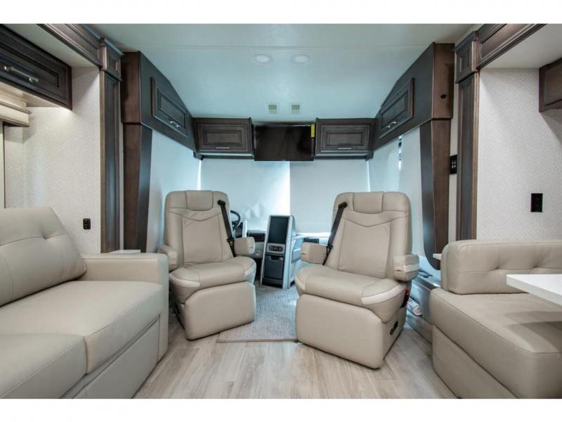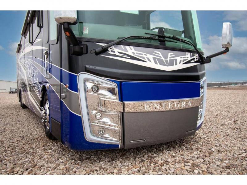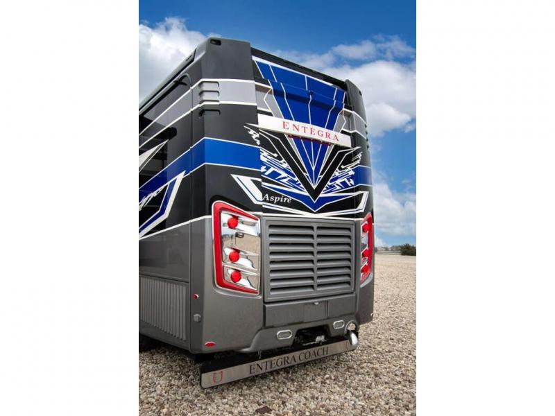 This RV rides on a Freightliner chassis and is powered by a Cummins® L9 turbocharged 450 HP engine with 1,250 lb.-ft. torque at 1,400 RPM and an Allison 3000 series transmission. This luxury bath & 1/2 bunk model diesel motor coach measures approximately 44 feet 11 inches in length and is backed by Entegra Coach's superior 2-Year/24K Mile Limited Coach & 5-Year Limited Structural Warranties. New for 2026 on the Aspire is the larger square-shaped windows with wood framed valances and a leather accent, LED strip lighting in bed base and under the sofa/dinette cabinets, upgraded tile work in the entry well, GE convection microwave with air fryer and larger Samsung Smart TV in the bedroom. Some of the standard features that really set the Entegra Aspire apart include the Valid 15” high brightness digital dash with quad core graphics processor and on-board diagnostics, Ramco 360° HD digital camera system, Aqua-Hot® 400D hydronic water and heating system with in-floor heat throughout, power tilt & telescoping steering wheel, Aqua View Showermi$er with “GREEN” technology saves fresh water, day and night shades throughout, solid-surface countertops with LED accent lighting, Girard window awnings & slide-out toppers, stainless steel refrigerator, Induction cook top with matching wood cover, LED marker and turn lights, DEF fill door, power rear engine door with push button control, Firefly multiplex system with 10” VegaTouch touchscreen for complete integration of coach controls, Victron MultiPlus II 120V 3000VA pure sine inverter system with 7" digital LED information system, water softener prep, (3) 15K BTU roof A/C units with heat pumps, heated floors, 50 amp power cord reel, power water hose reel, GPS navigation system, frameless dual pane & tinted windows, automatic hydraulic leveling system, central vacuum, LED TV in bedroom, automatic generator start, Splendide stack washer/dryer, removed carpet on all slide floors, 360 degree birds' eye view camera system, LED TV in cab and much more.