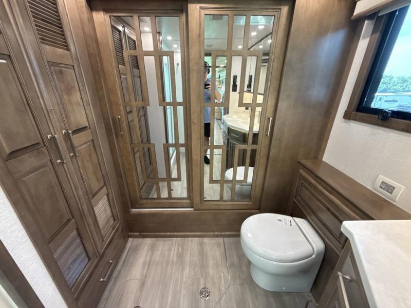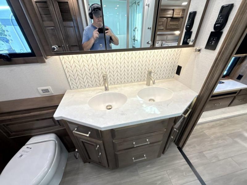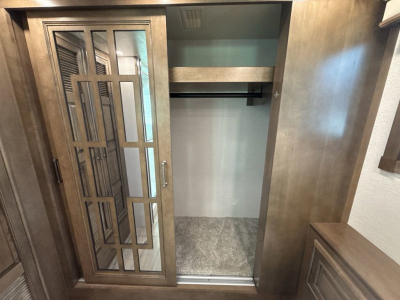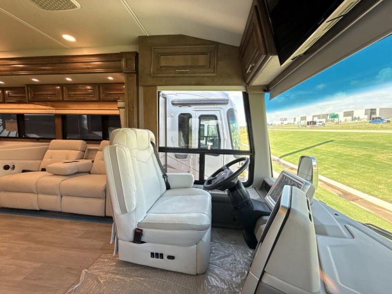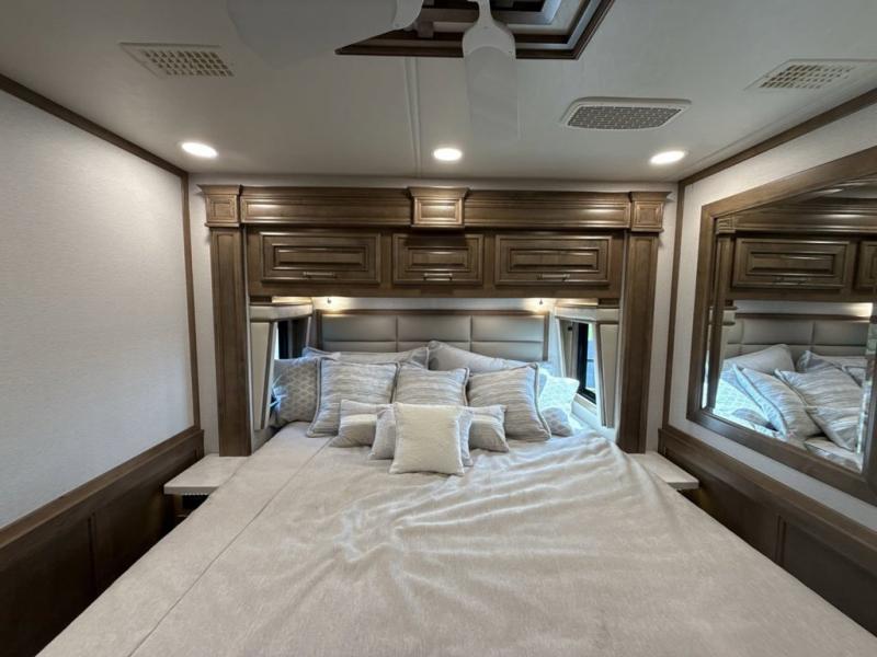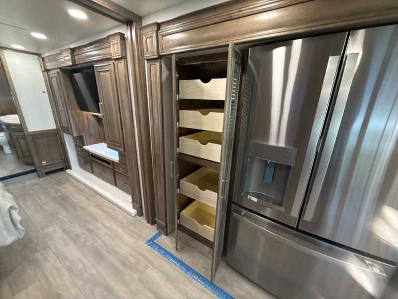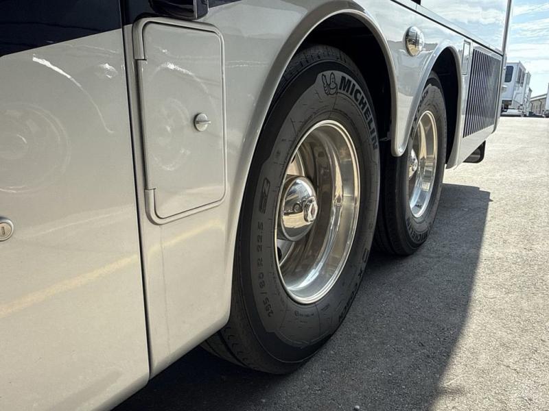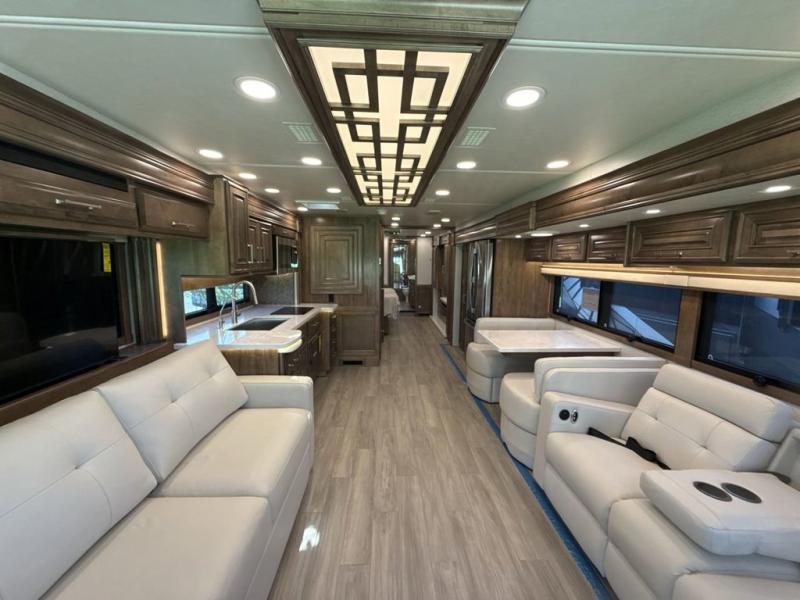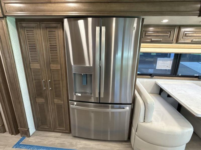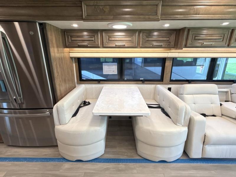 With any Anthem Class A diesel motorhome by Entegra Coach, setting up camp has never been easier with the 15-inch digital dash displaying an integrated 360-degree surround view system with fourteen smart radar sensors and six HD cameras plus the Valid air leveling system. Each roof is constructed with arched aluminum trusses filled with batt insulation and reflective Flexfoil topped with plywood decking then one-piece fiberglass, exterior walls with Aluma-Tru welded tubular aluminum studs, insulated front and rear caps, and X-Bridge bracing welded into the chassis frame. The interior provides the Firefly multiplex system with 10-inch VegaTouch touchscreen for complete integration of the coach controls with remote monitoring and control from the available mobile app, a decorative ceiling feature with integrated accent lighting, powered solar day and blackout night shades, and Aire-Secure travel locks for all pocket doors!