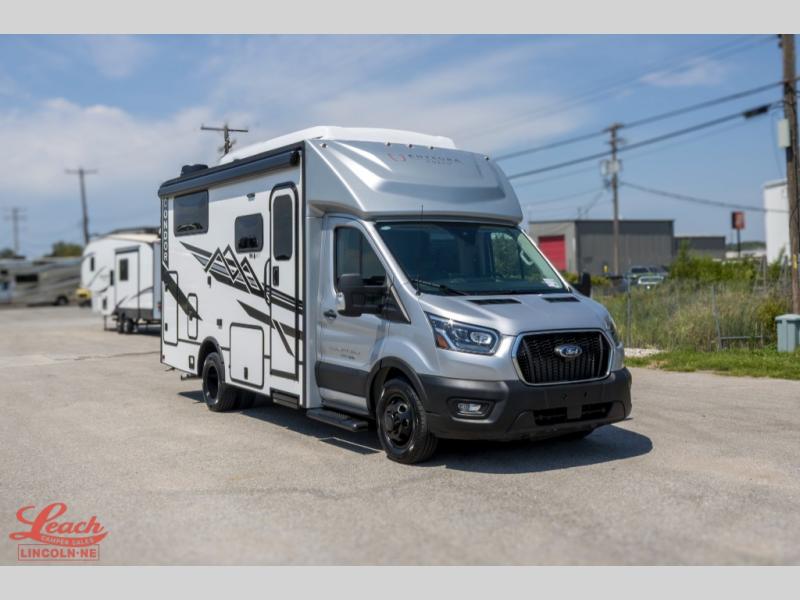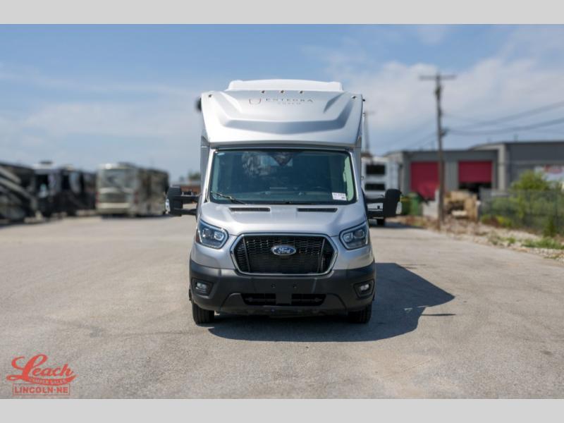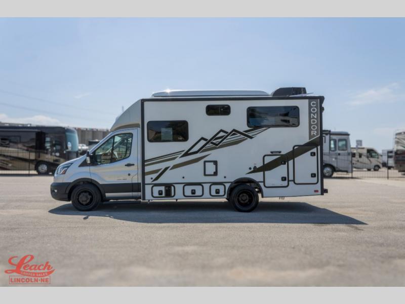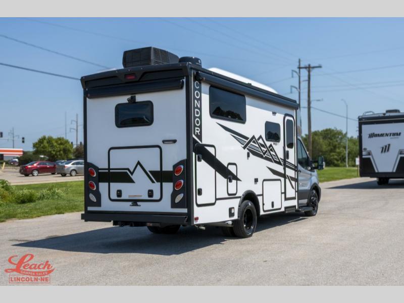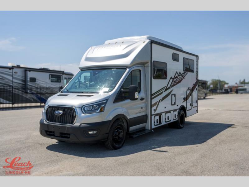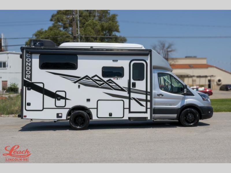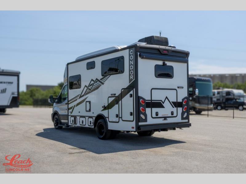 The all-weather capable and all-terrain ready Condor Class C gas motorhome by Entegra Coach is ready for adventure! Not only does this coach feature durable TuffShell construction, but it also sits on a Ford transit 350HD all-wheel drive chassis. This chassis, along with the Van Compass front and rear lift kit and all-terrain tires will allow you to go off the beaten path when the journey calls for it. Some of the cockpit amenities included to make driving easier than ever are the backup camera, the 12" SYNC 4 infotainment system, and the collision mitigation for added safety. There is also an outside shower, a 360W roof mounted solar panel with a dual controller, a remote keyless entry, and many more convenient exterior features. Inside, you'll be met with residential vinyl flooring, a custom-molded ABS cab-over with storage, pressed countertops, and privacy shades for the cab windows for added privacy!