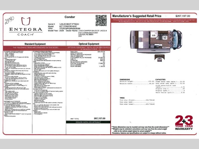 Entegra Coach Condor Class C gas motorhome 22T highlights: