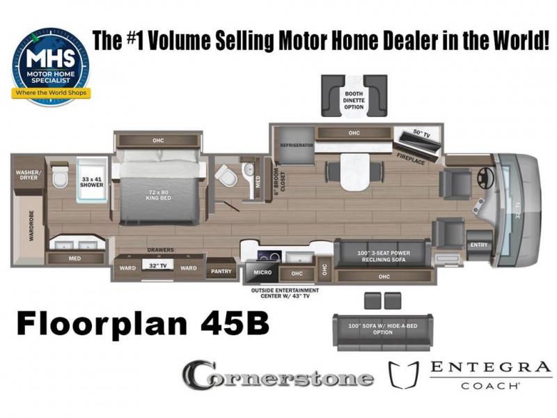 MSRP $997,269. All New 2026 Entegra Cornerstone Model 45B Bath & 1/2 is approximately 44 feet 11 inches in length and rides on a Spartan K3 tag axle chassis with IFS featuring Entegra’s exclusive X-Bridge framing, powered by a Cummins 15-liter ISX turbocharged 605HP engine 1,950 lb. ft. torque at 1,150 RPM, an Allison 4000 series transmission and is backed by Entegra Coach's superior 2-Year/24K Mile Limited Coach & 5-Year Limited Structural Warranties. New for 2026 on the cornerstone is the larger square-shaped windows with wood framed valances and a leather accent, LED strip lighting in bed base and under the sofa/dinette cabinets, soft-closing, dovetail-constructed drawers with magnetic catches, upgraded tile work in the entry well, GE convection microwave with air fry and larger Samsung Smart TV in the bedroom. Optional equipment on this RV includes the blackout package, polished tile flooring and double lav sink. A few of the impressive standards include Collision avoidance system with collision warning, adaptive cruise control and electronic stability control, Equalizer™ hydraulic automatic coach leveling, Onan® 12,500-watt diesel generator, with automatic start, on powered slide-out tray, Aqua-Hot® 600D hydronic water and heating system with in-floor heat throughout and engine preheat, Aqua View Showermi$er with “GREEN” technology saves fresh water, Dual roof-mounted Girard® Vision dual-pitched patio awnings with LED lights, Xite™ 360° HD digital camera system, E-Z Steer™ adjustable power steering assist, Villa® heated and cooled leather driver and passenger seats with powered 6-way adjustment, lumbar, recline, footrest and massage functions, Firefly multiplex system with 10” VegaTouch touchscreen for complete integration of coach controls, Hand-laid porcelain tiled floors, Powered solar day and blackout night shades, Induction cooktop with matching wood cover, Solid-surface countertops, Select Comfort® Sleep Number® King-size mattress and much more. **Unit Not California CARB Compliant and Cannot be Registered in California**. Shop a huge selection of luxury diesel pusher motorhomes all at 1 location! Choose from American Coach Eagle – Dream – Entegra Coach Cornerstone – Anthem – Aspire – Fleetwood Palisade – Discovery LXE – Holiday Rambler Armada – Foretravel Realm – Foretravel Realm Presidential and more. We also buy and sell quality pre-owned models such Newmar King Aire – Essex – London Aire – Mountain Aire – Dutch Star - Tiffin Zephyr – Allegro Bus – Phaeton – Prevost Liberty Lady – Millennium - Marathon – Newell and much more. Visit MHSRV.com for our complete line-up and the sale prices that have made us the #1 volume selling motor home dealership in the world 12 years in a row! For additional details on this unit and our entire inventory including brochures, window sticker, videos, photos, reviews & testimonials as well as additional information about Motor Home Specialist and our manufacturers please visit us at MHSRV.com or call 800-335-6054. At Motor Home Specialist, we DO NOT charge any prep or orientation fees like you will find at other dealerships. All sale prices include a 200-point inspection, interior & exterior wash, detail service and a fully automated high-pressure rain booth test and coach wash that is a standout service unlike that of any other in the industry. You will also receive a thorough coach orientation with an MHSRV technician, a night stay in our delivery park featuring landscaped and covered pads with full hook-ups and much more! Read Thousands upon Thousands of 5-Star Reviews at MHSRV.com and See What They Had to Say About Their Experience at Motor Home Specialist. WHY PAY MORE? WHY SETTLE FOR LESS?