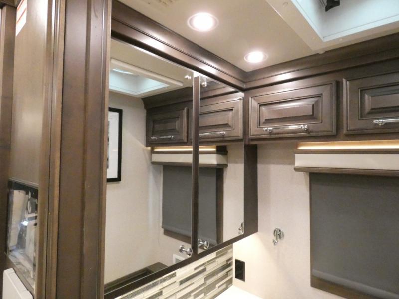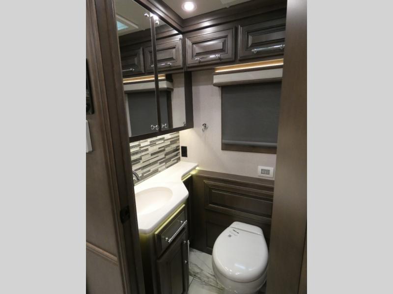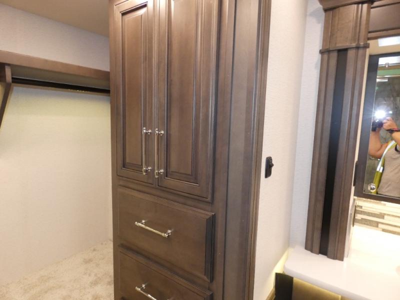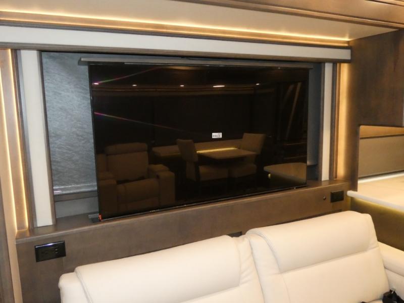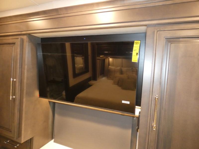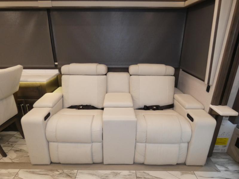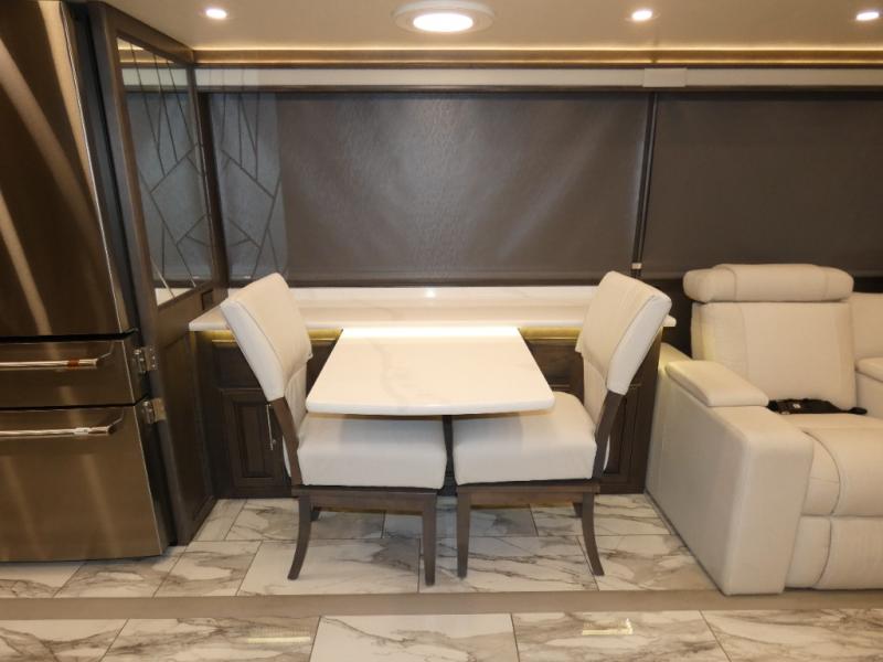 If you've been looking to upgrade your motorhome, this Cornerstone will be the perfect choice. There is a bath and a half, four slides, and sleeping space for four. Once you arrive at the campground, relax on the power theatre seating that is directly across from the 50" TV on lift. You can play a game at the free-standing dinette, or you may just want to head outside since there is an outside entertainment center. The master suite includes a king bed slide out, dual wardrobes, plus your own 43" TV. And check out the full rear bath that includes a rear walk-in wardrobe with plenty of storage space and a washer and dryer.