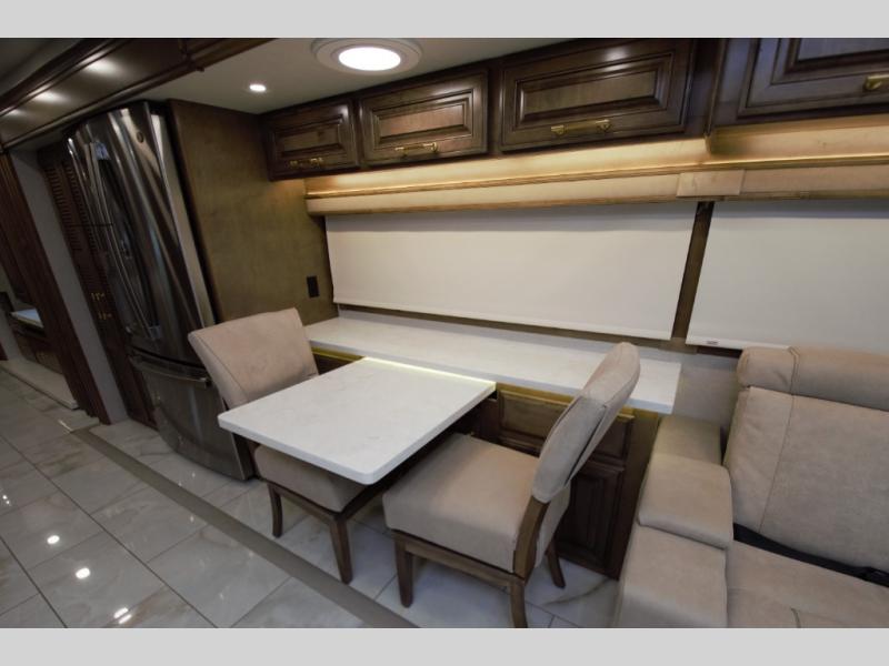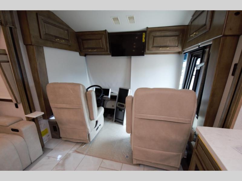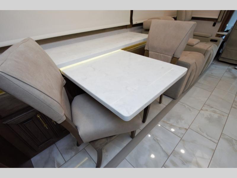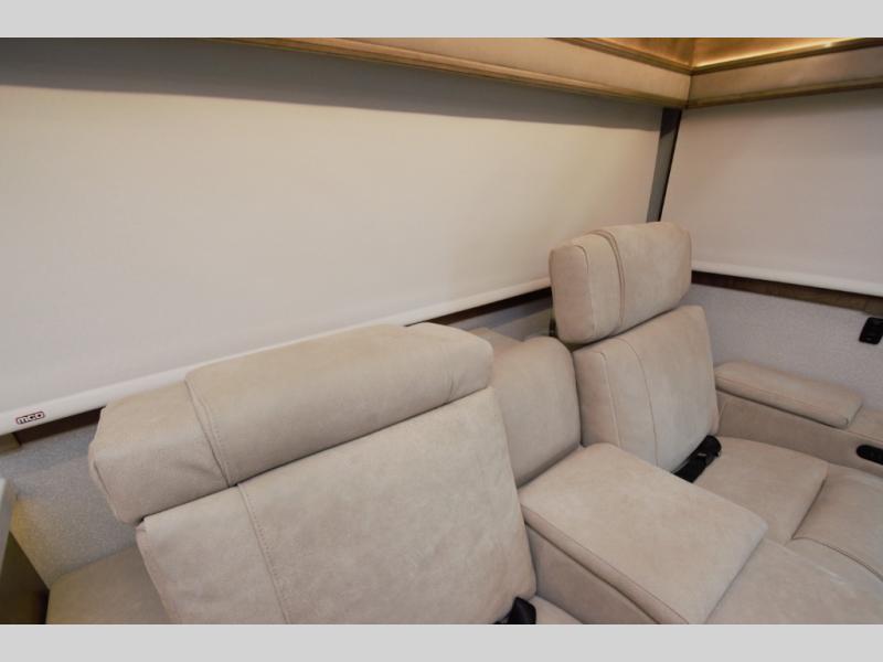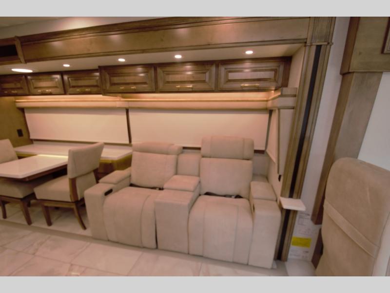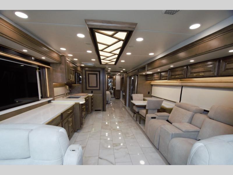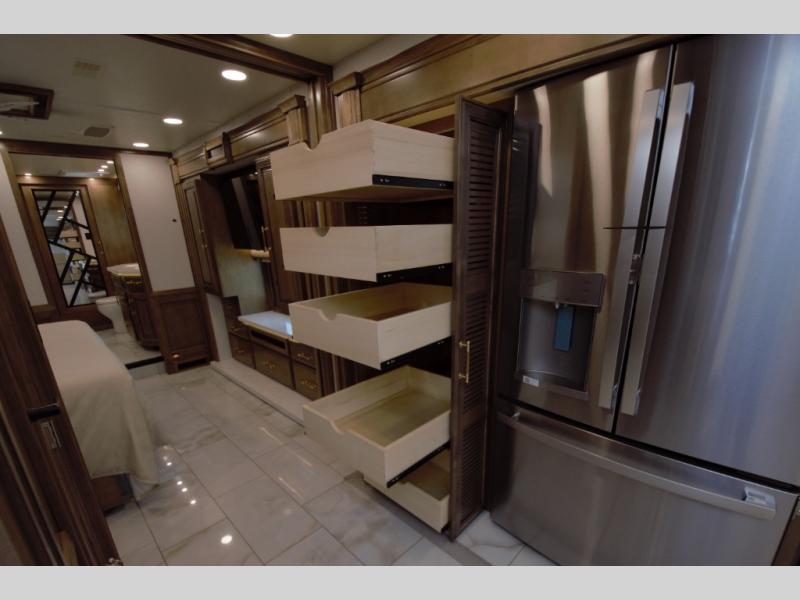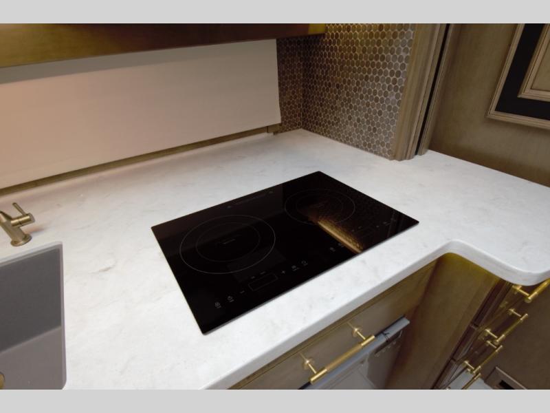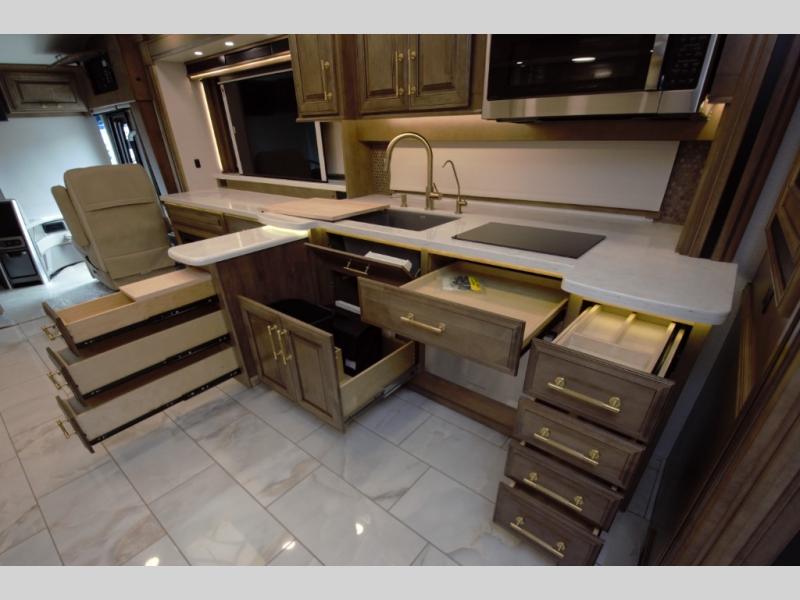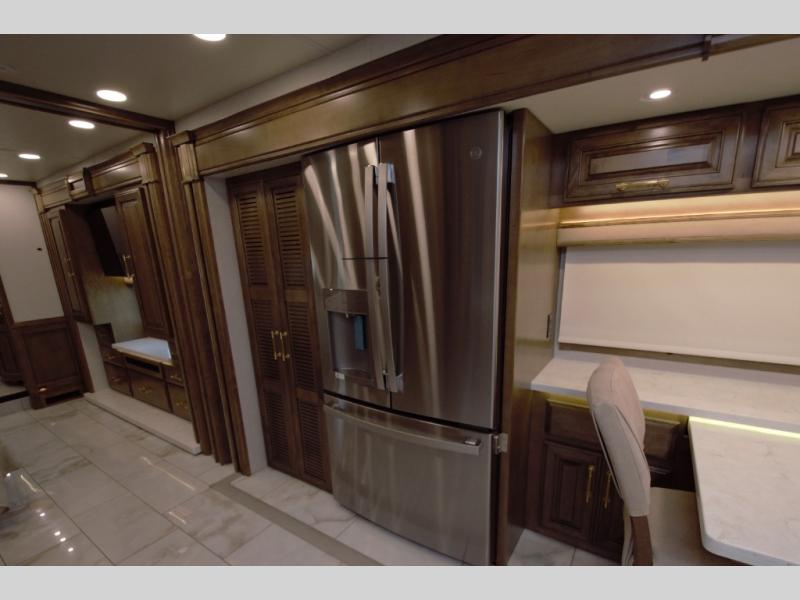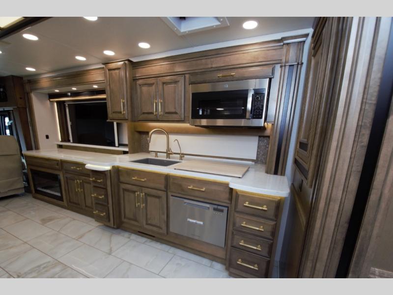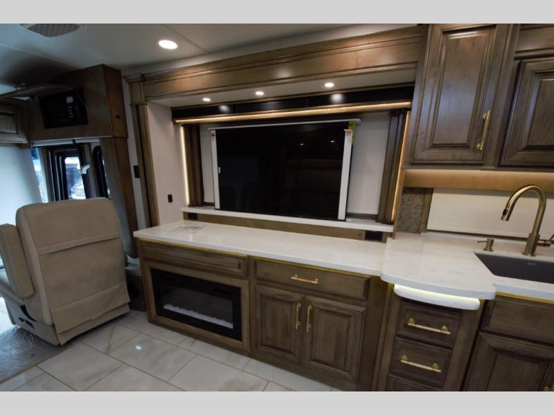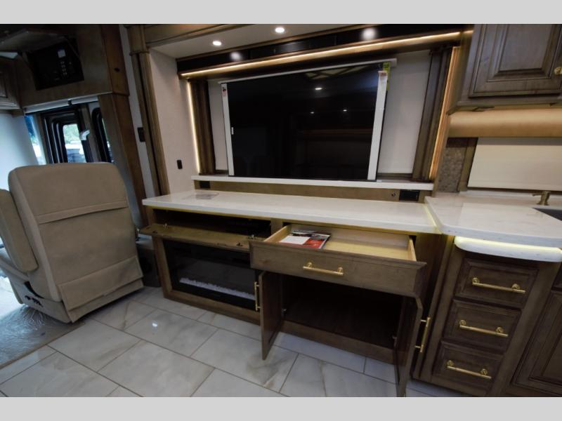 From the handcrafted cabinetry to heated porcelain tile floors, the interior of the 45V is a sanctuary of style and sophistication. You'll enjoy ultra-leather furniture, a fireplace, dual recliners, and a king-sized bed with a premium mattress. The residential kitchen features high-end appliances, including an induction cooktop, dishwasher, and residential refrigerator—perfect for gourmet meals on the go.