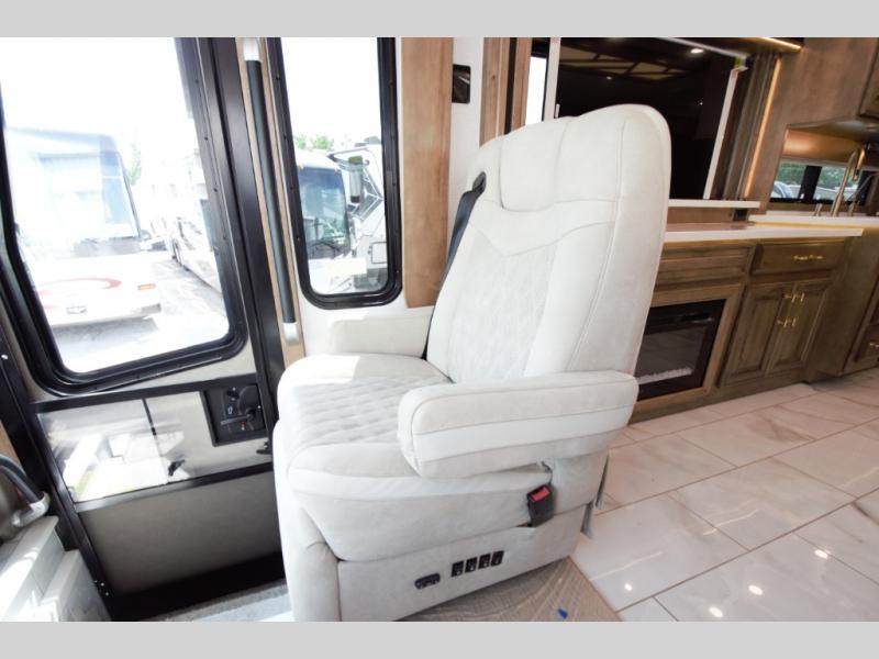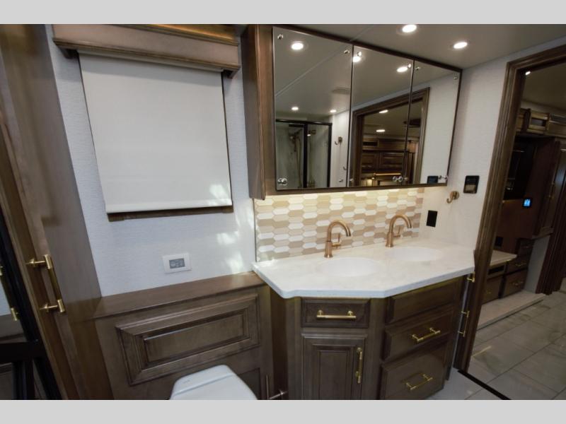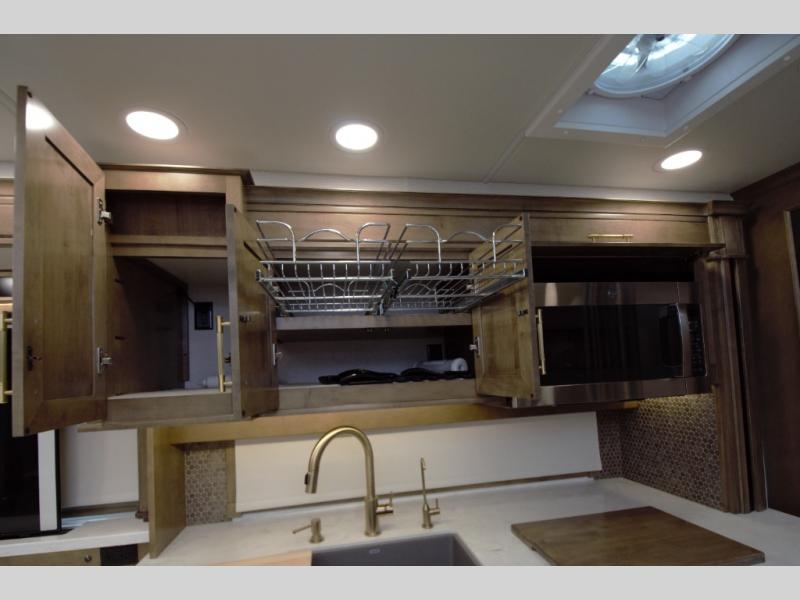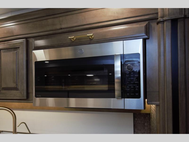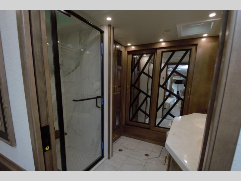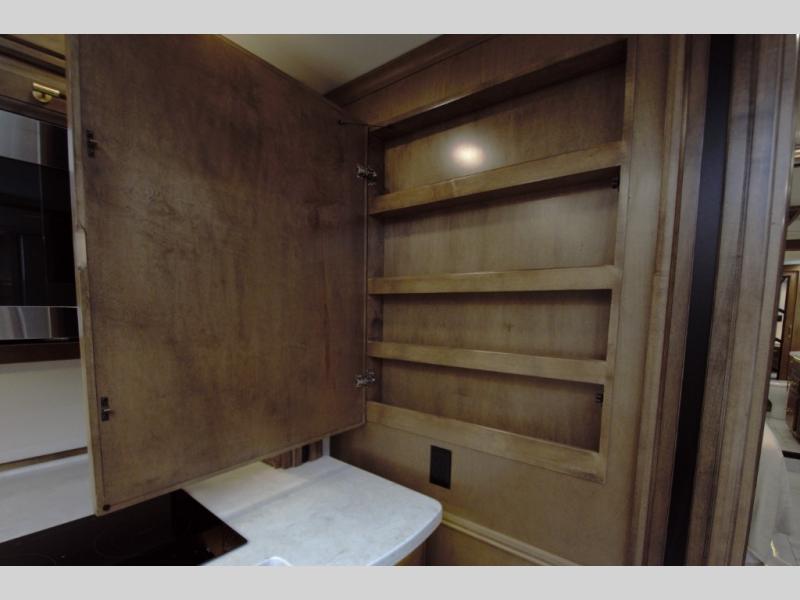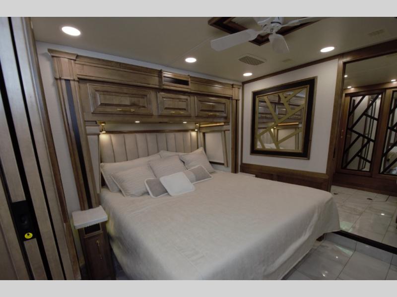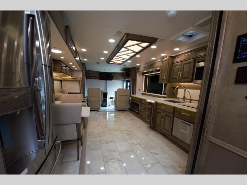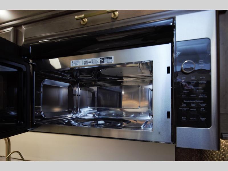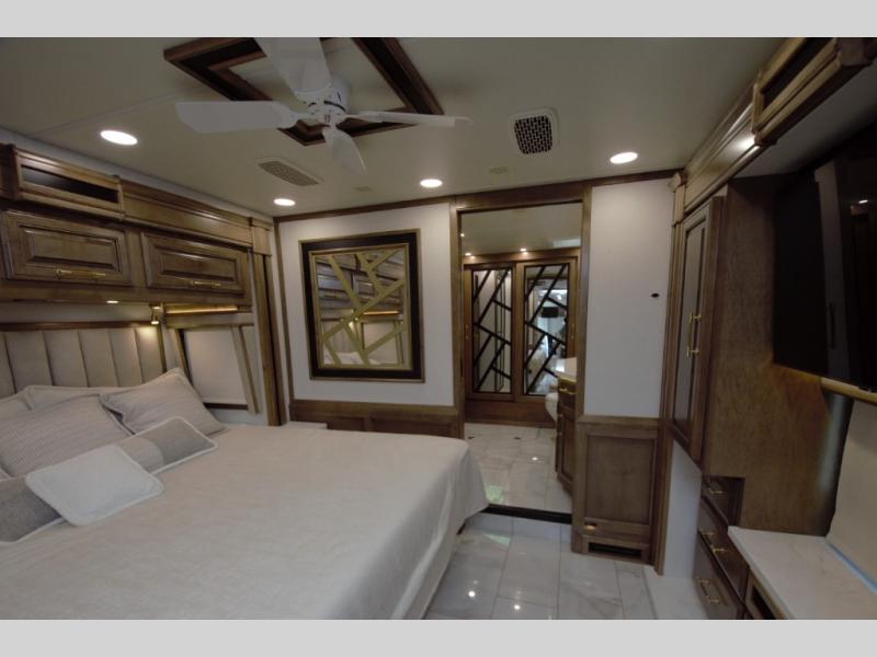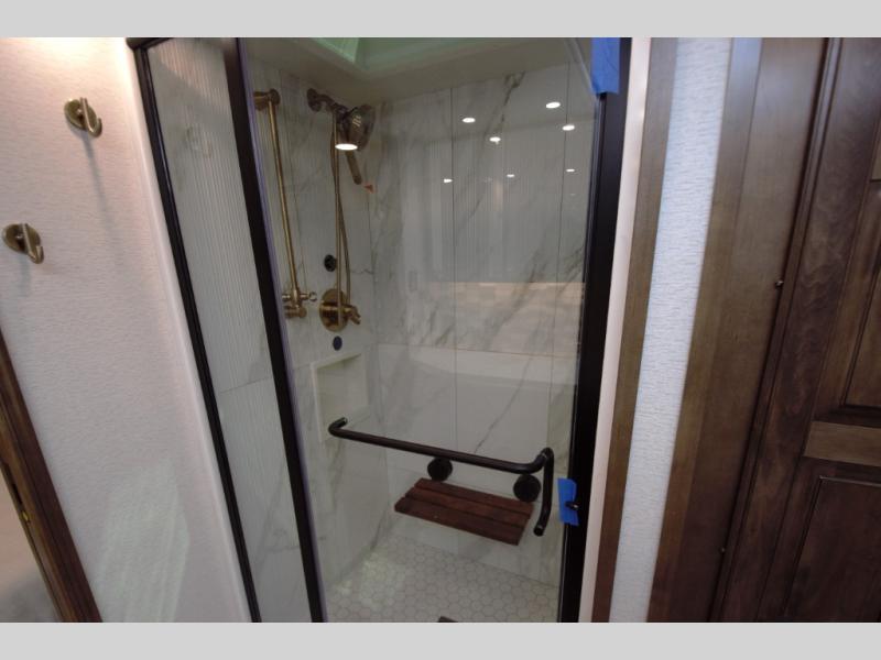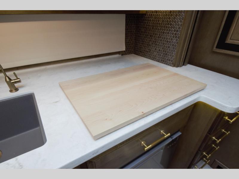 From the handcrafted cabinetry to heated porcelain tile floors, the interior of the 45V is a sanctuary of style and sophistication. You'll enjoy ultra-leather furniture, a fireplace, dual recliners, and a king-sized bed with a premium mattress. The residential kitchen features high-end appliances, including an induction cooktop, dishwasher, and residential refrigerator—perfect for gourmet meals on the go.