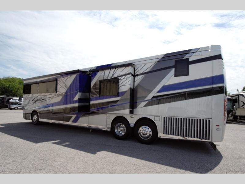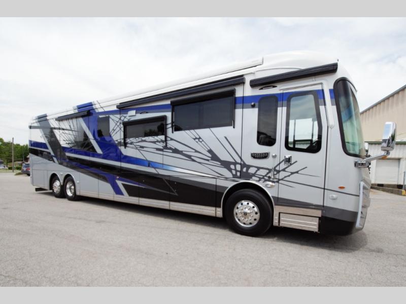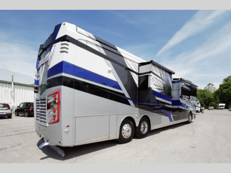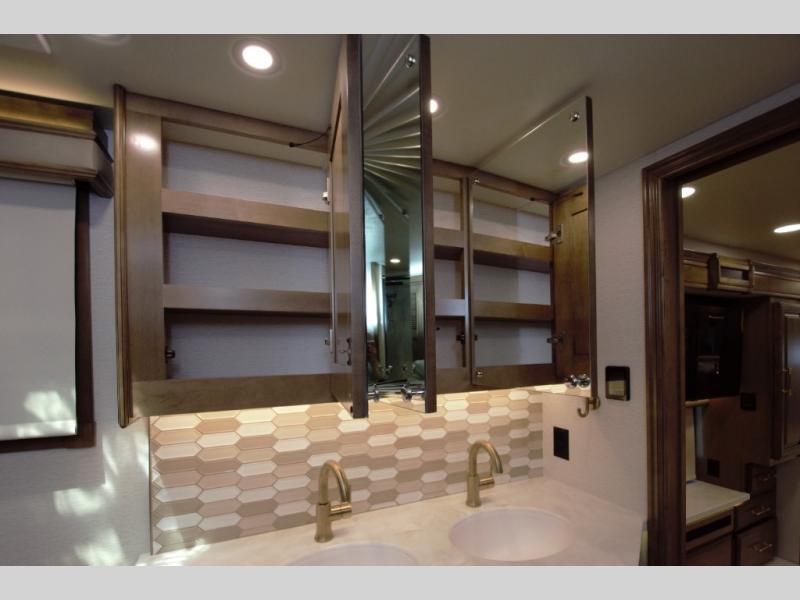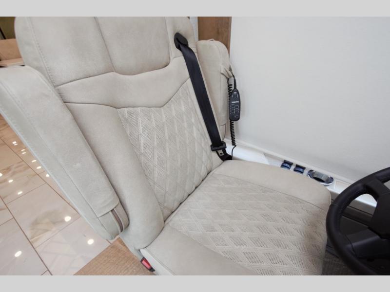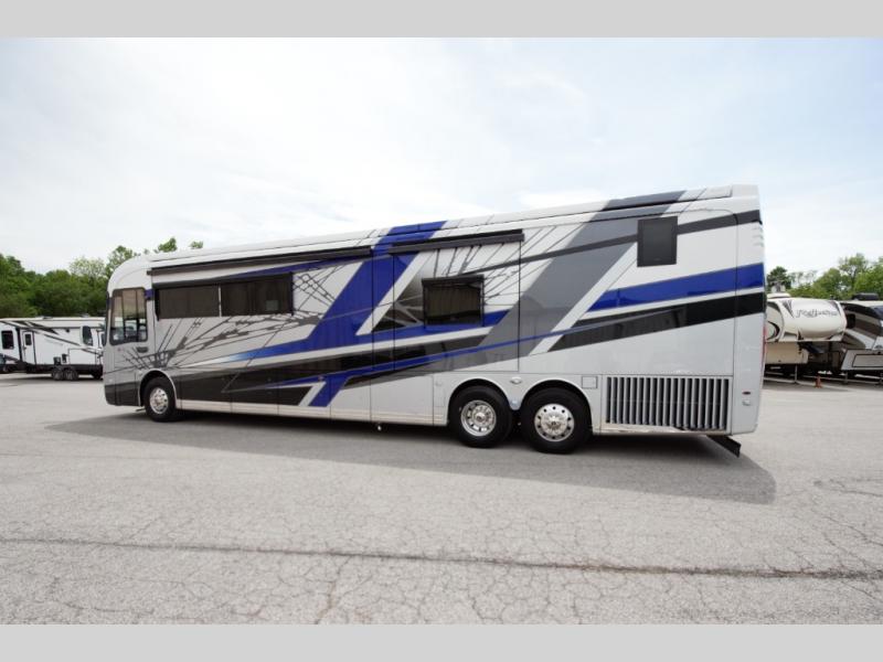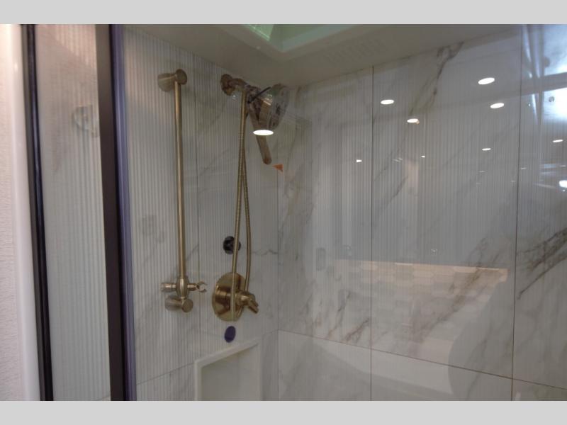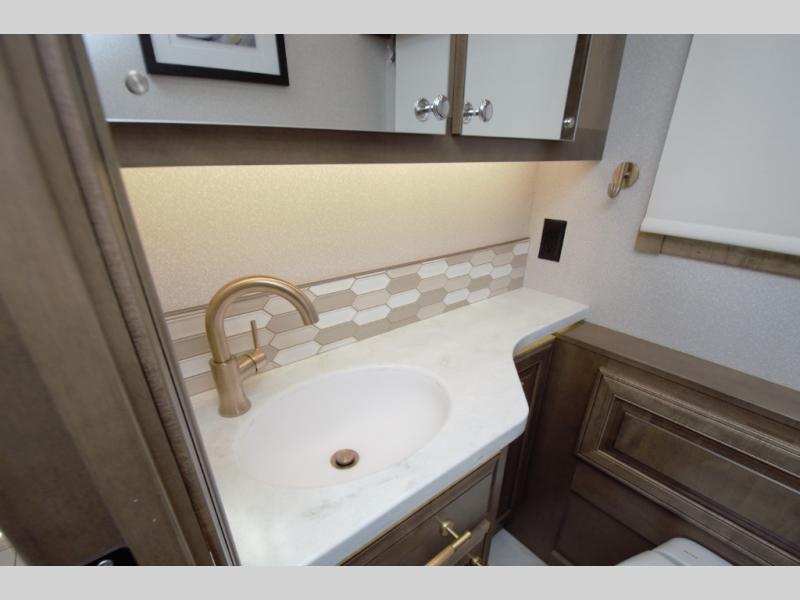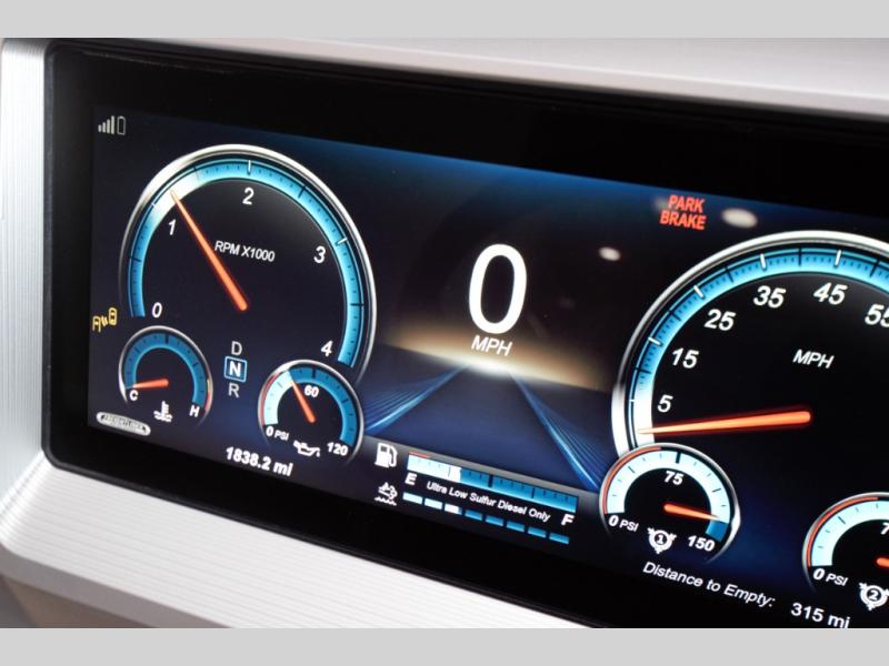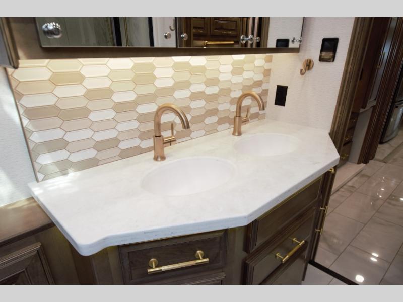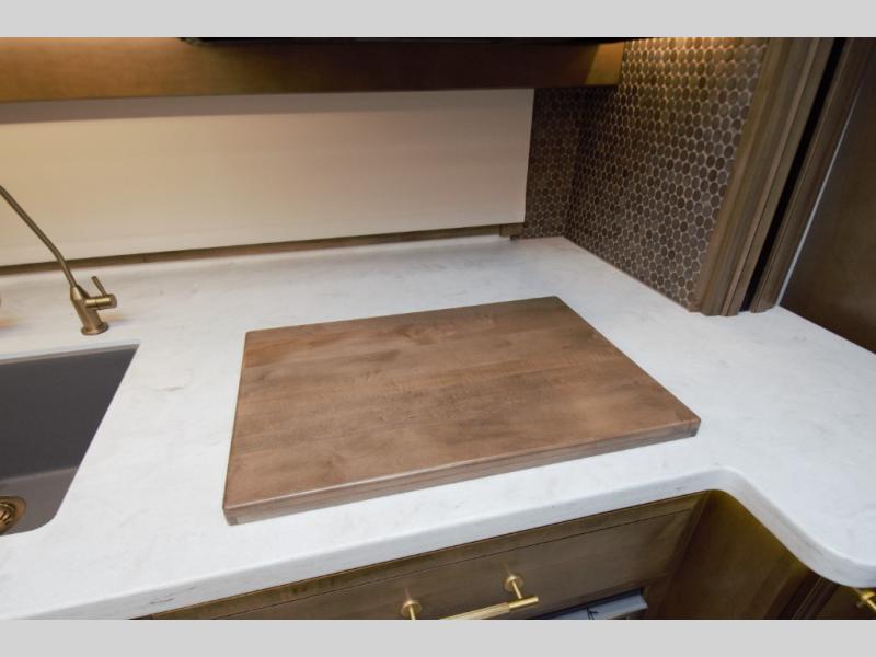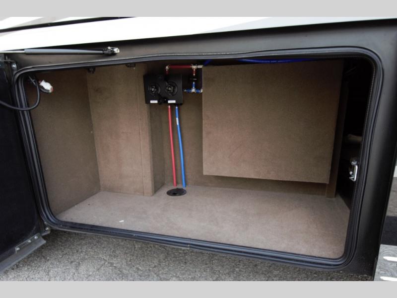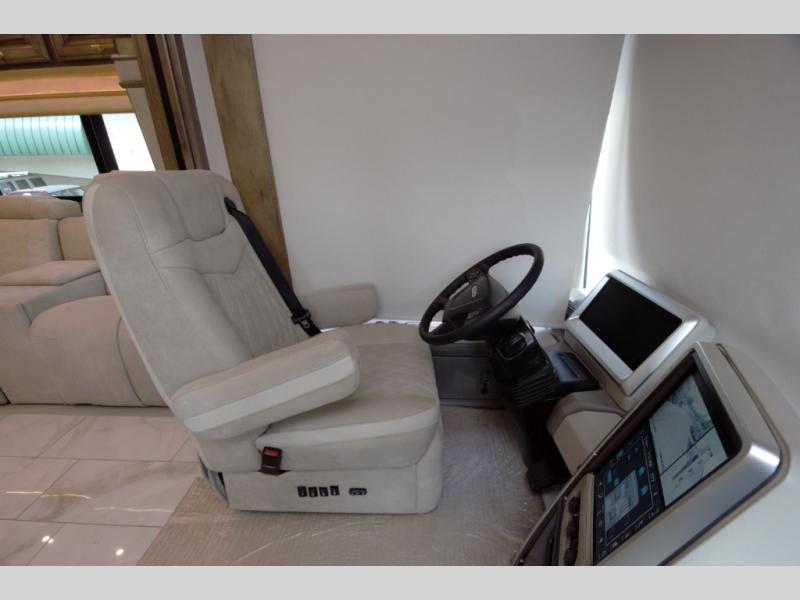 From the handcrafted cabinetry to heated porcelain tile floors, the interior of the 45V is a sanctuary of style and sophistication. You'll enjoy ultra-leather furniture, a fireplace, dual recliners, and a king-sized bed with a premium mattress. The residential kitchen features high-end appliances, including an induction cooktop, dishwasher, and residential refrigerator—perfect for gourmet meals on the go.