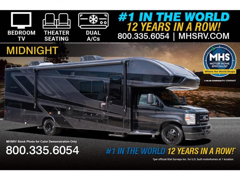 You can bring a few guests to join in on the fun with this motorhome! The bunk over cab and 66" x 76" king bed offer comfortable places to sleep, plus you can transform the booth dinette and the sofa into extra sleeping spaces if needed. Everyone can freshen up each morning with the 30" x 36" shower in the rear corner bathroom, and keep their bellies full with a Furrion all-in-one cooktop and oven plus a residential microwave. There is even a countertop extension to make meal prepping easier. Take the fun outside and watch movies on the exterior LED HD Smart TV while staying protected by the 18' electric awning with LED lights!