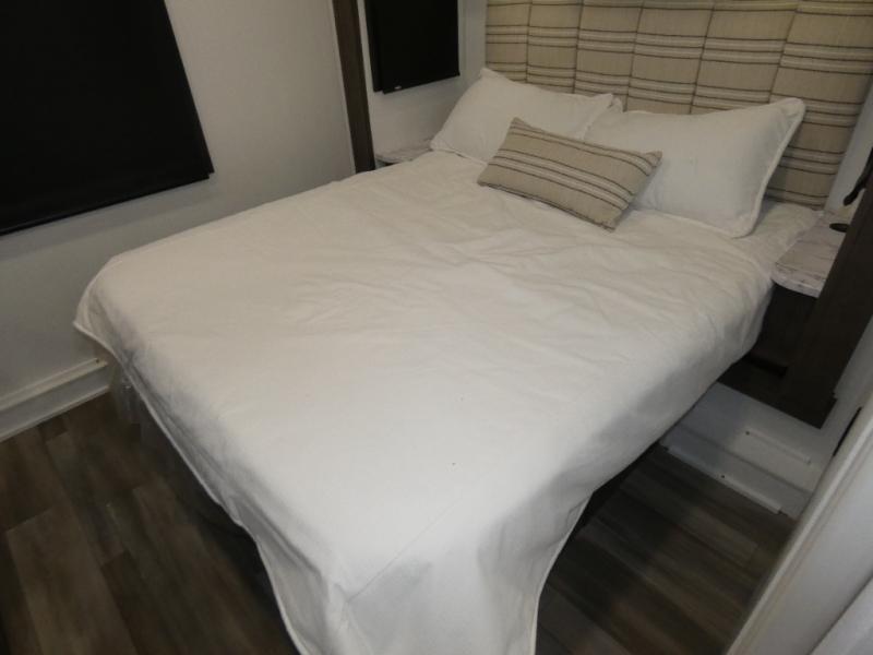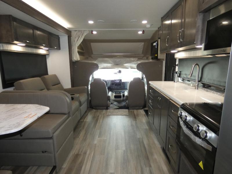 Enjoy a home on wheels with this motorhome! The rear private bedroom has a 60" x 74" queen bed slide to lay your head on at night and dual wardrobes opposite to keep your clothes looking their best. The separated bathroom makes it easy for one person to freshen up in the 30" x 36" shower while another uses the private toilet and sink. Prepare your best home cooked meals with the Furrion all-in-one cooktop and oven then enjoy them at the booth dinette. The theater sofa offers a comfortable place to relax. There is also a bunk over cab for more to join in on the fun!