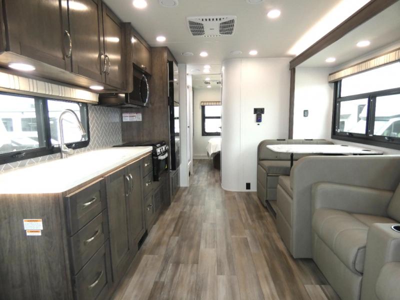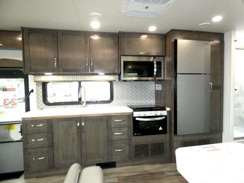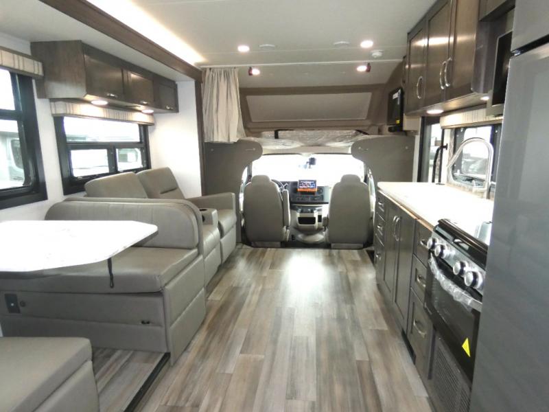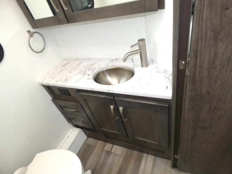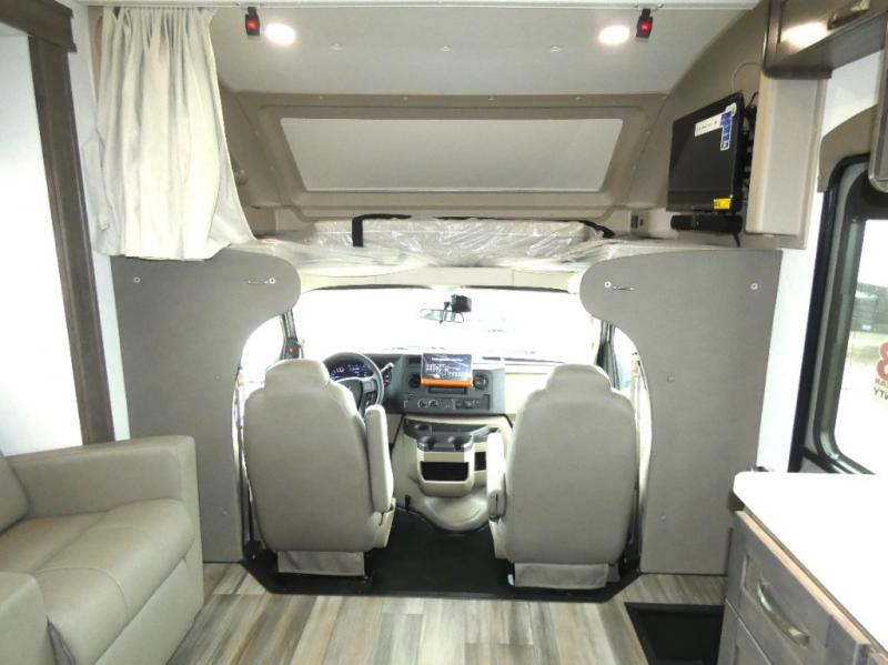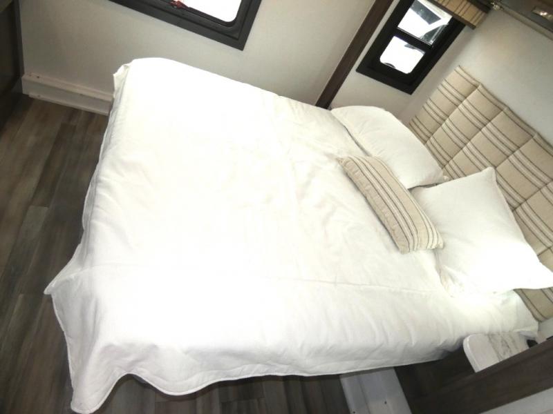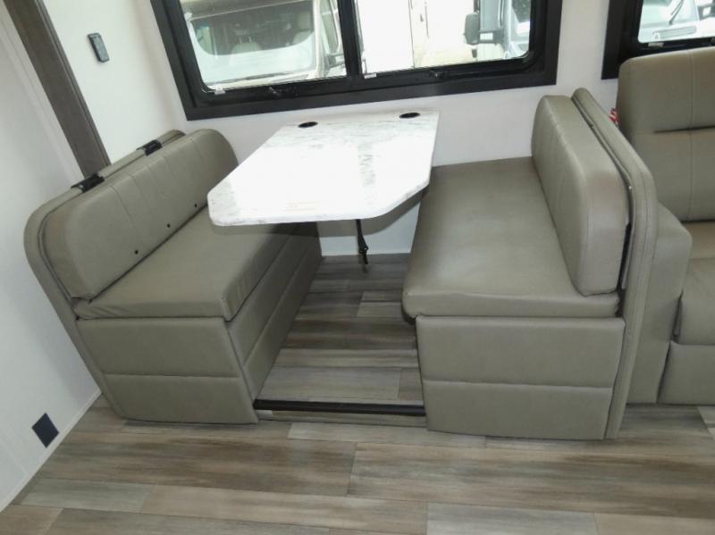 Enjoy a home on wheels with this motorhome! The rear private bedroom has a 60" x 74" queen bed slide to lay your head on at night and dual wardrobes opposite to keep your clothes looking their best. The separated bathroom makes it easy for one person to freshen up in the 30" x 36" shower while another uses the private toilet and sink. Prepare your best home cooked meals with the Furrion all-in-one cooktop and oven then enjoy them at the booth dinette.
