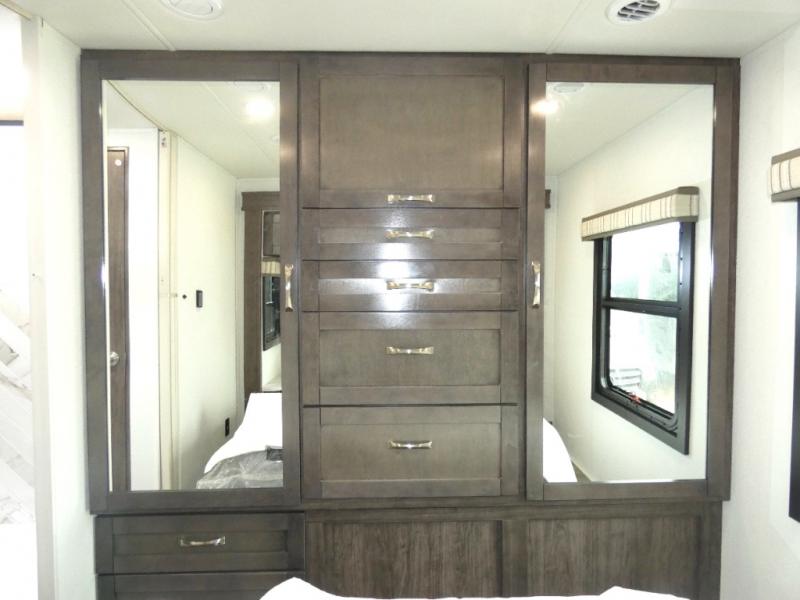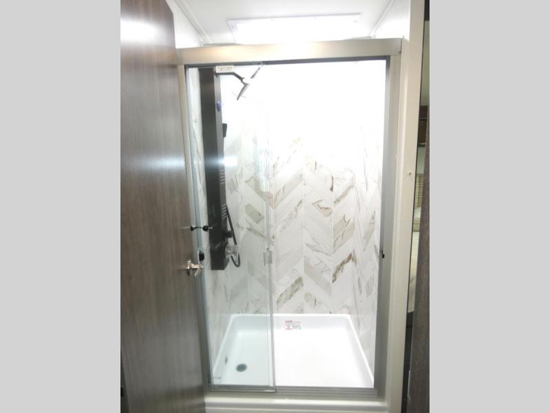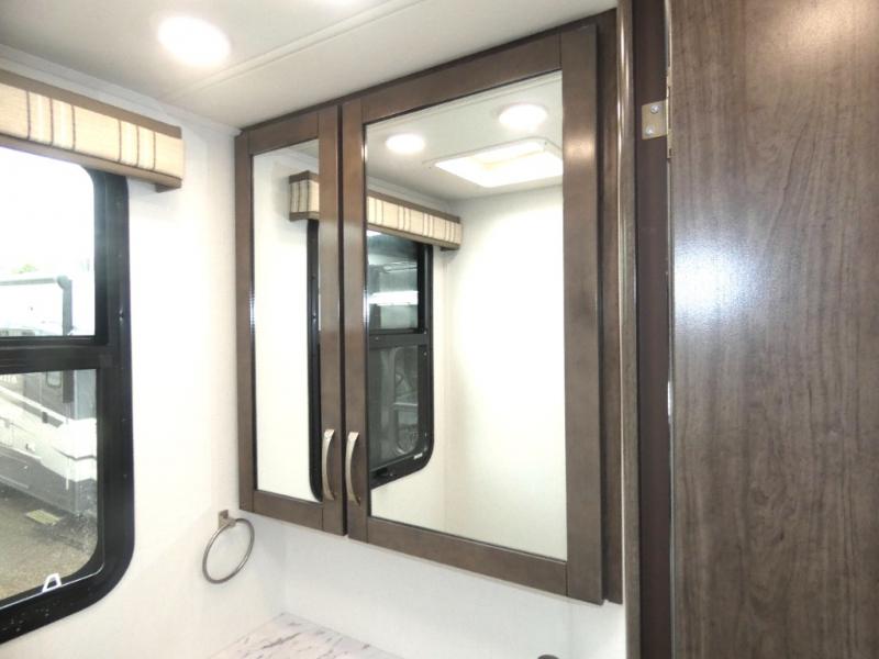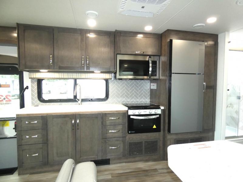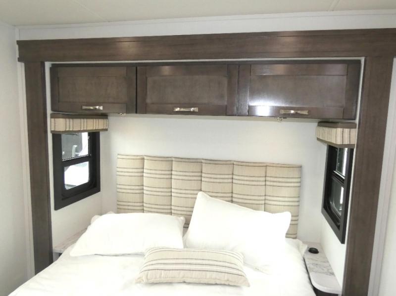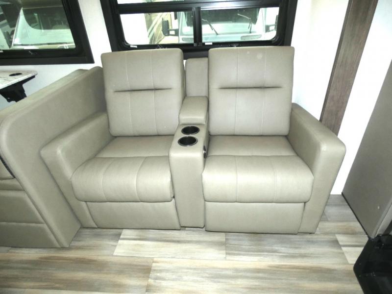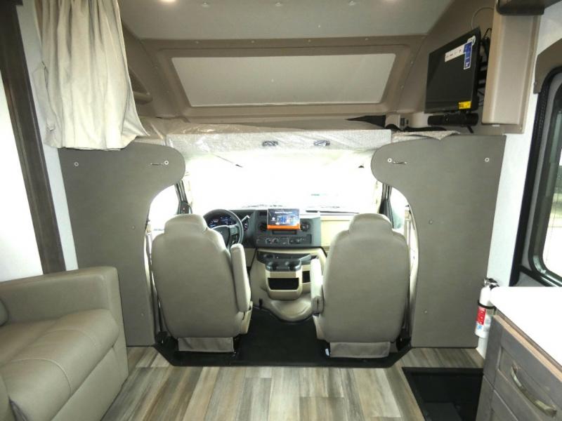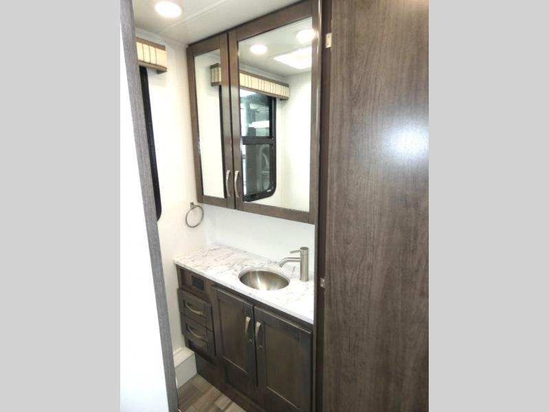 Enjoy a home on wheels with this motorhome! The rear private bedroom has a 60" x 74" queen bed slide to lay your head on at night and dual wardrobes opposite to keep your clothes looking their best. The separated bathroom makes it easy for one person to freshen up in the 30" x 36" shower while another uses the private toilet and sink. Prepare your best home cooked meals with the Furrion all-in-one cooktop and oven then enjoy them at the booth dinette.