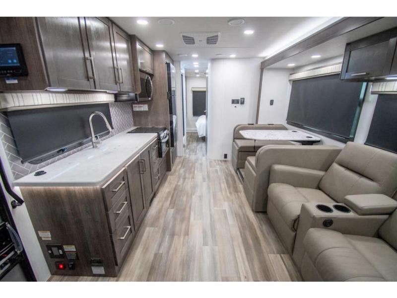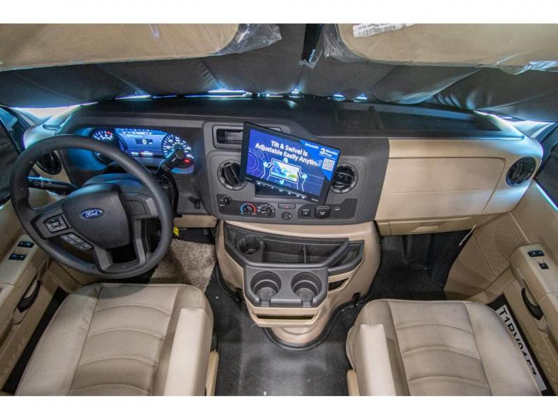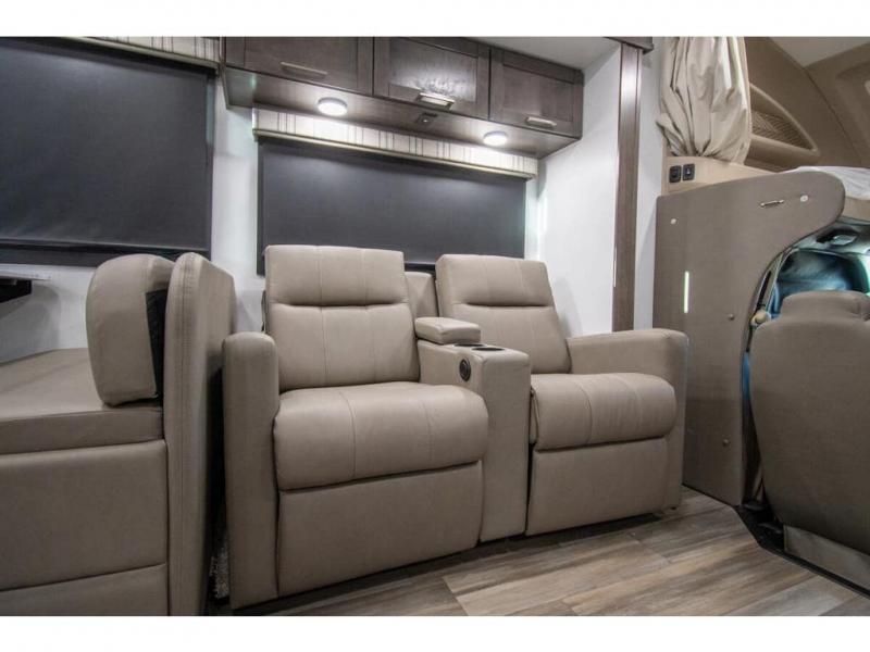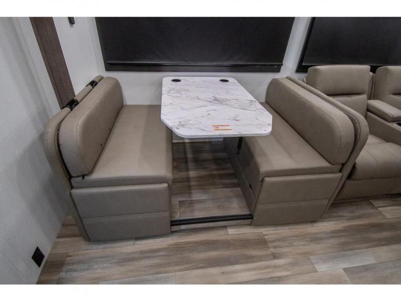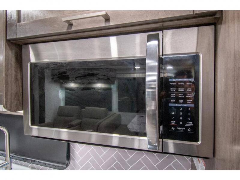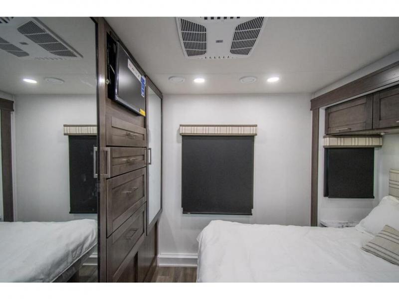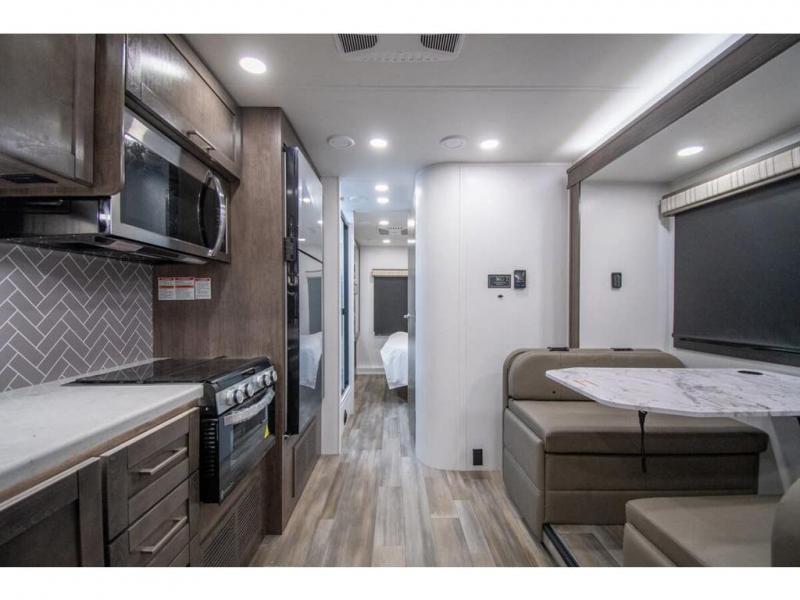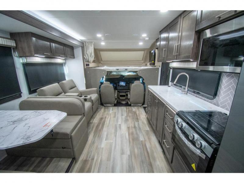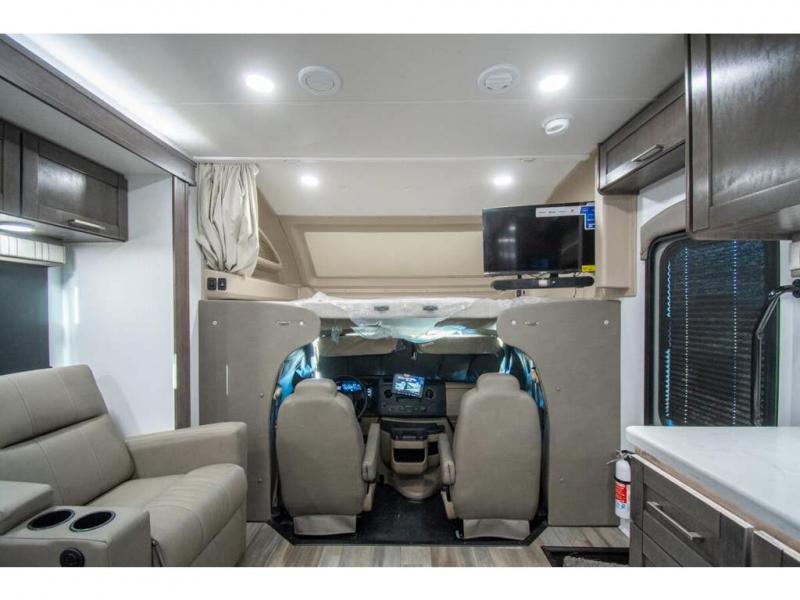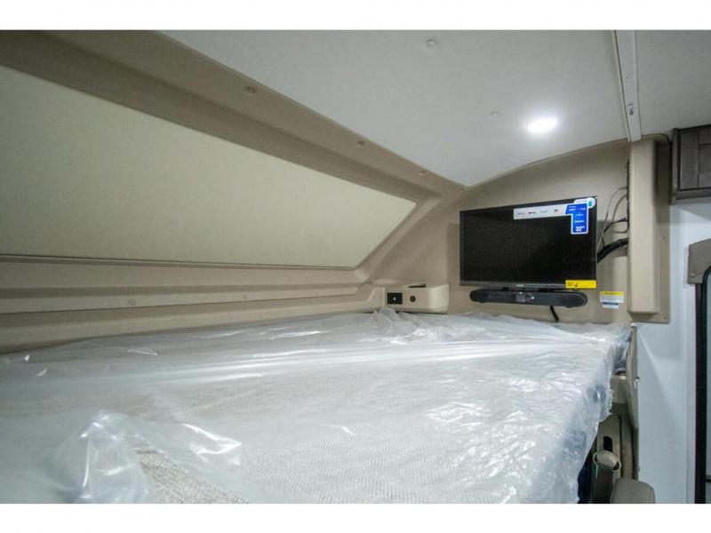 Enjoy a home on wheels with this motorhome! The rear private bedroom has a 60" x 74" queen bed slide to lay your head on at night and dual wardrobes opposite to keep your clothes looking their best. Add the optional TV if you enjoy watching a movie in bed. The separated bathroom makes it easy for one person to freshen up in the 30" x 36" shower while another uses the private toilet and sink. Prepare your best home cooked meals with the Furrion all-in-one cooktop and oven then enjoy them at the booth dinette. The tri-fold sofa offers a comfortable place to relax but it can be switched out for the an optional theater sofa instead. There is also a bunk over cab for more to join in on the fun!