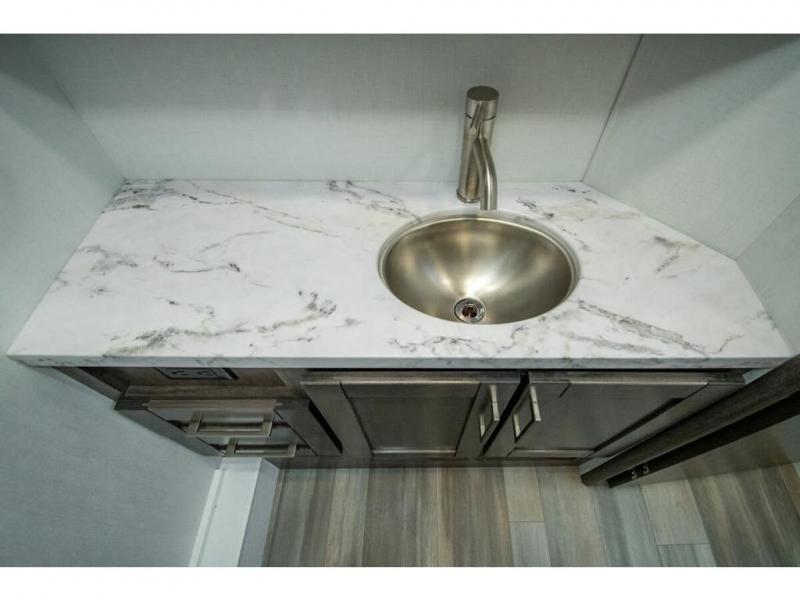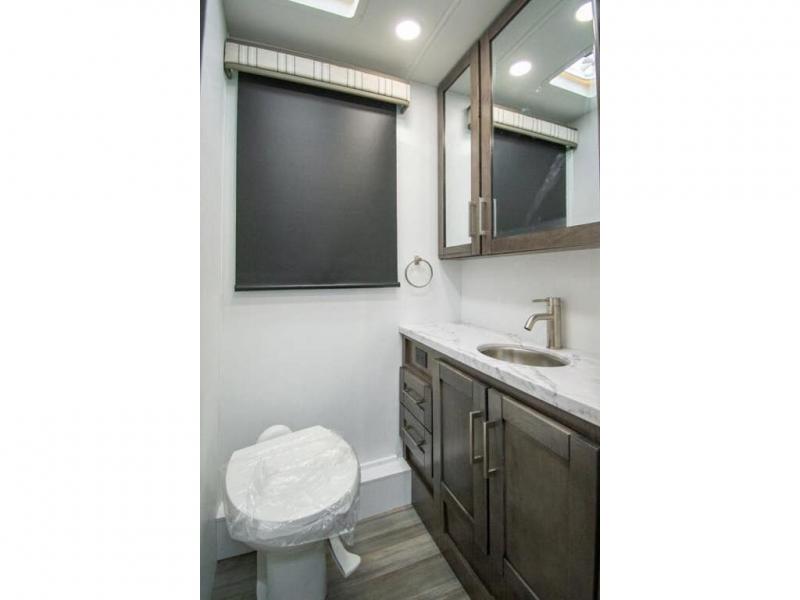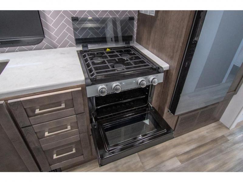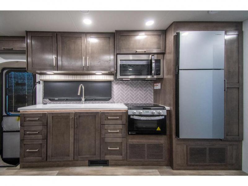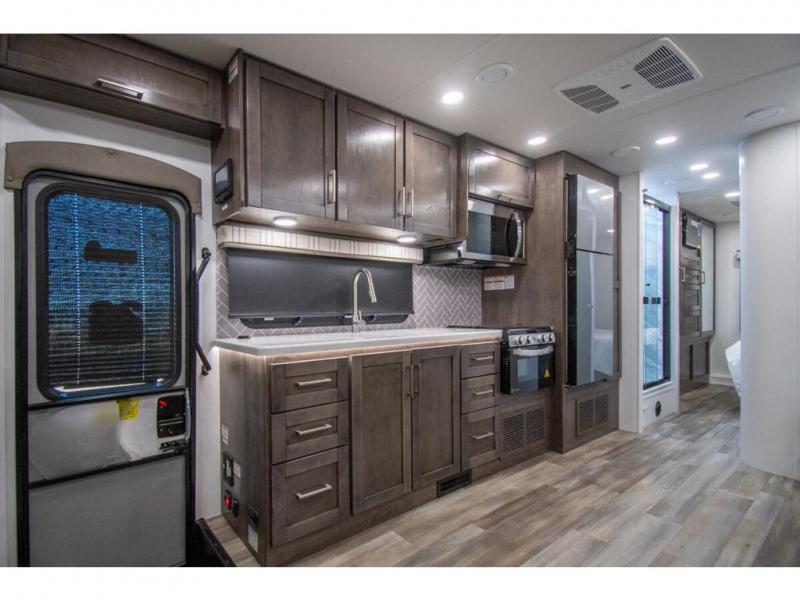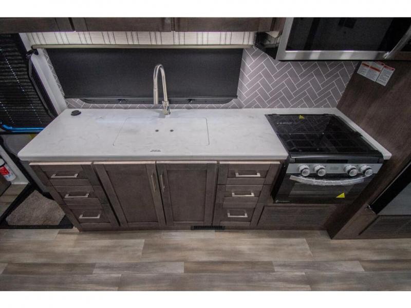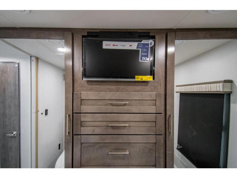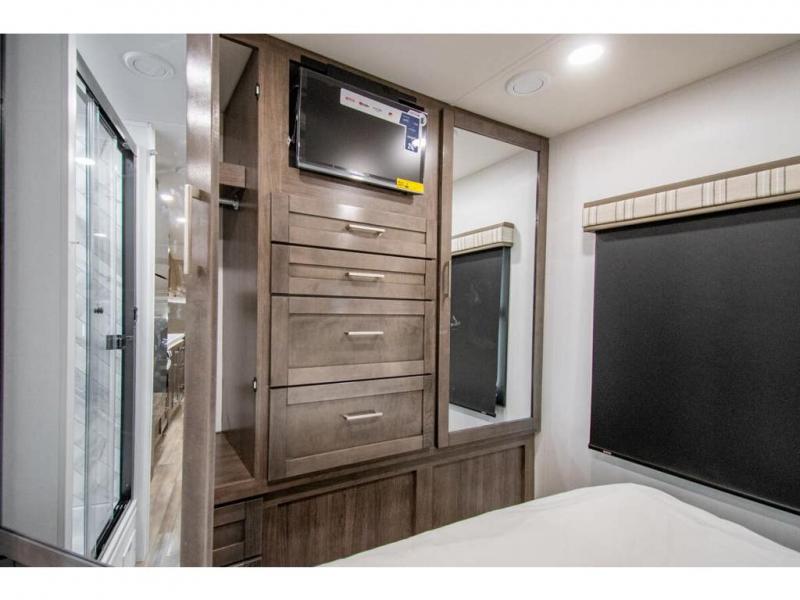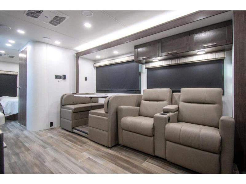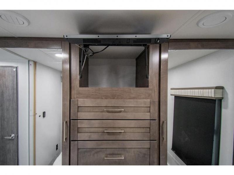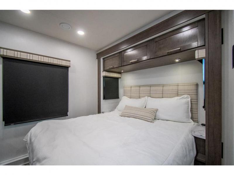 Enjoy a home on wheels with this motorhome! The rear private bedroom has a 60" x 74" queen bed slide to lay your head on at night and dual wardrobes opposite to keep your clothes looking their best. Add the optional TV if you enjoy watching a movie in bed. The separated bathroom makes it easy for one person to freshen up in the 30" x 36" shower while another uses the private toilet and sink. Prepare your best home cooked meals with the Furrion all-in-one cooktop and oven then enjoy them at the booth dinette. The tri-fold sofa offers a comfortable place to relax but it can be switched out for the an optional theater sofa instead. There is also a bunk over cab for more to join in on the fun!