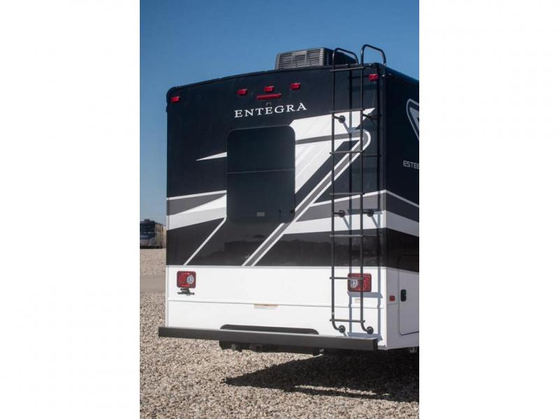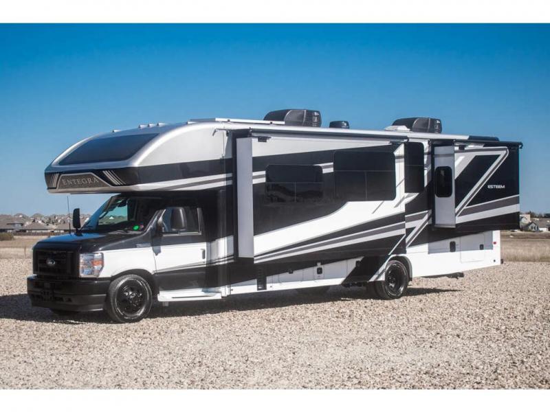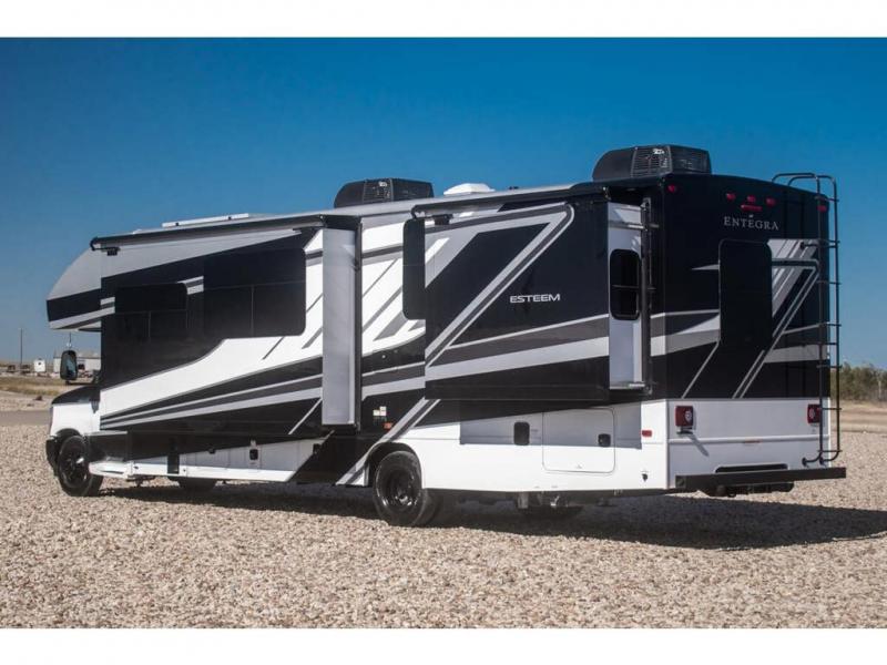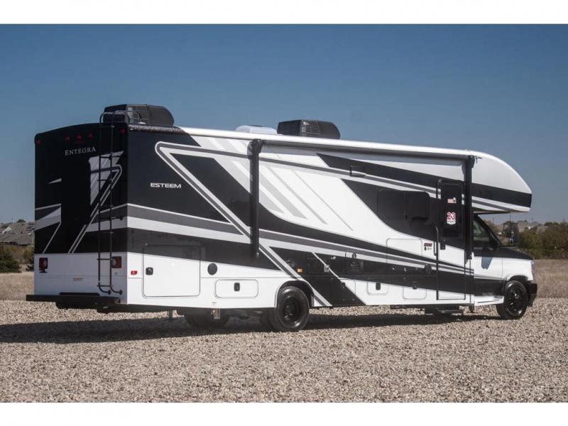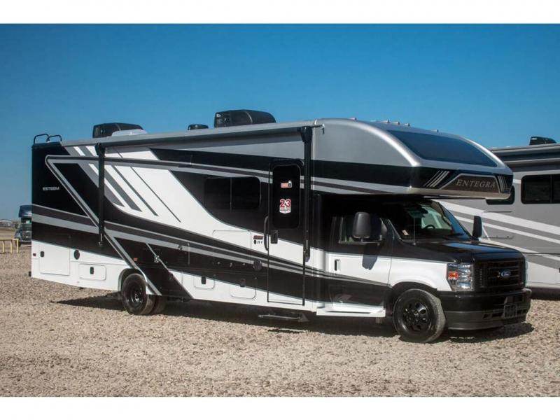Make one of these Entegra Coach Esteem Class C gas motorhomes your own! The interior design includes solid-surface countertops that pair well with the many technological upgrades. The fully custom-molded ABS surround in the cab area features its signature panoramic window and power shade for a beautiful view while you drive and provide privacy at night. They also come with E-Z Drive Elite which has a computer-balanced driveshaft, Koni FSD shocks, Hellwig helper springs, and a heavy-duty rear stabilizer bar for a smooth ride. Automatic leveling jacks will make set-up a breeze and the electric awning with LED lights will create an outdoor living space where you can relax after unpacking. Inside, you'll enjoy hardwood cabinet doors and drawer fronts, blackout night roller shades, and high-intensity recessed LED ceiling lights to keep your space well lit. There is also a JBL audio system and a BMPRO total coach control system to easily manage your unit's functions!