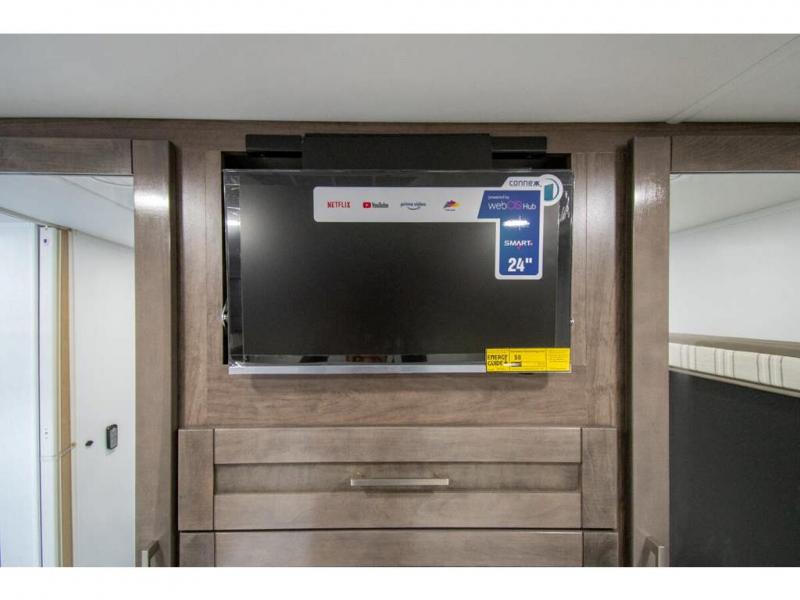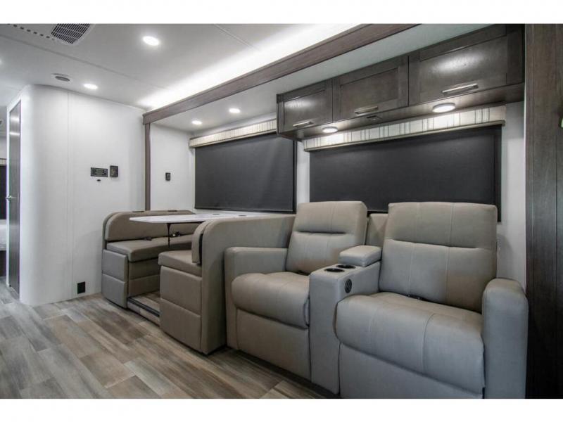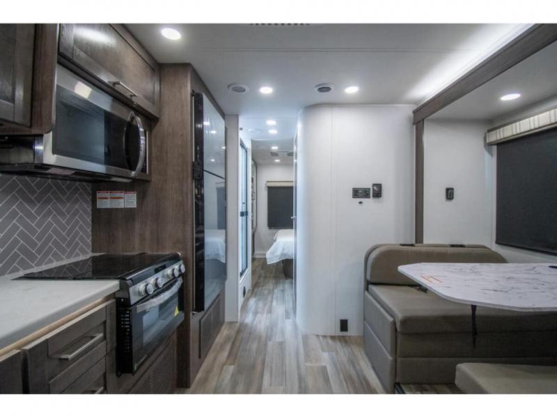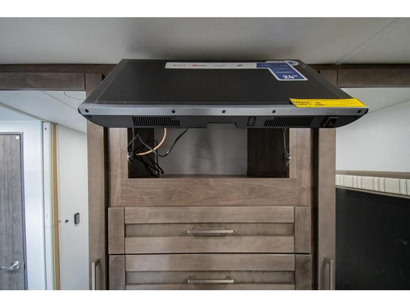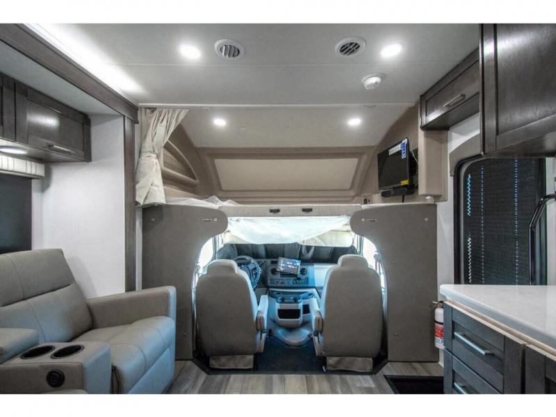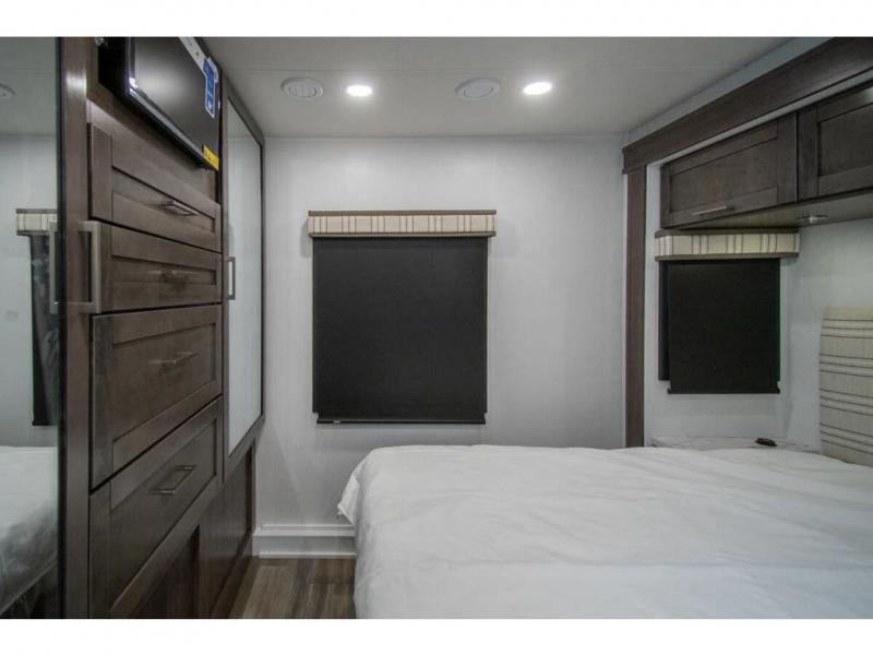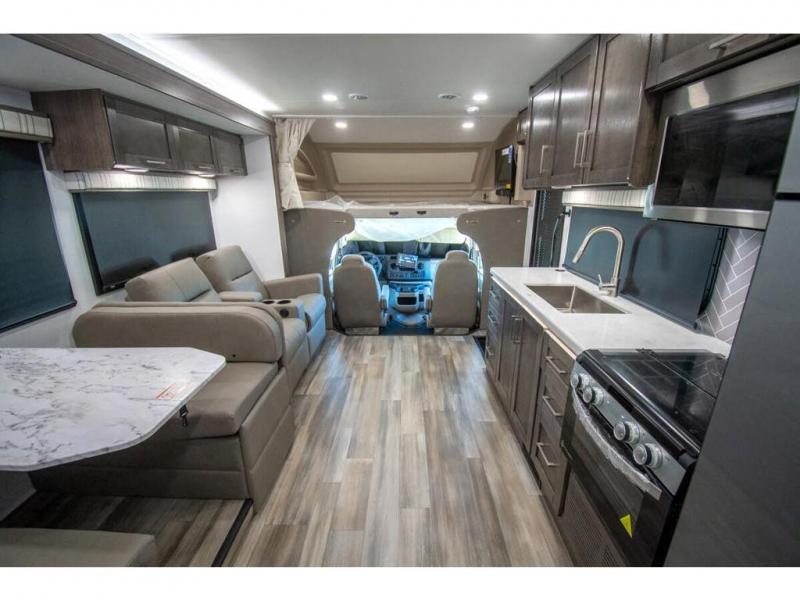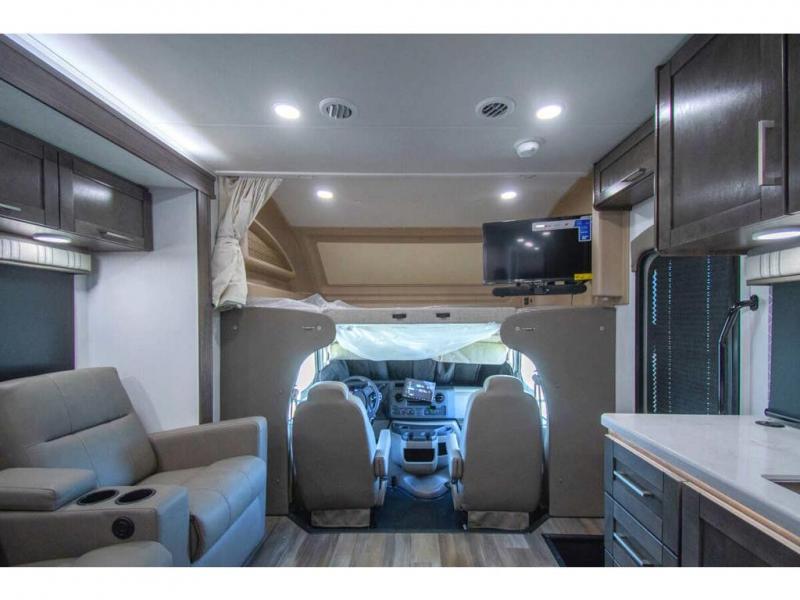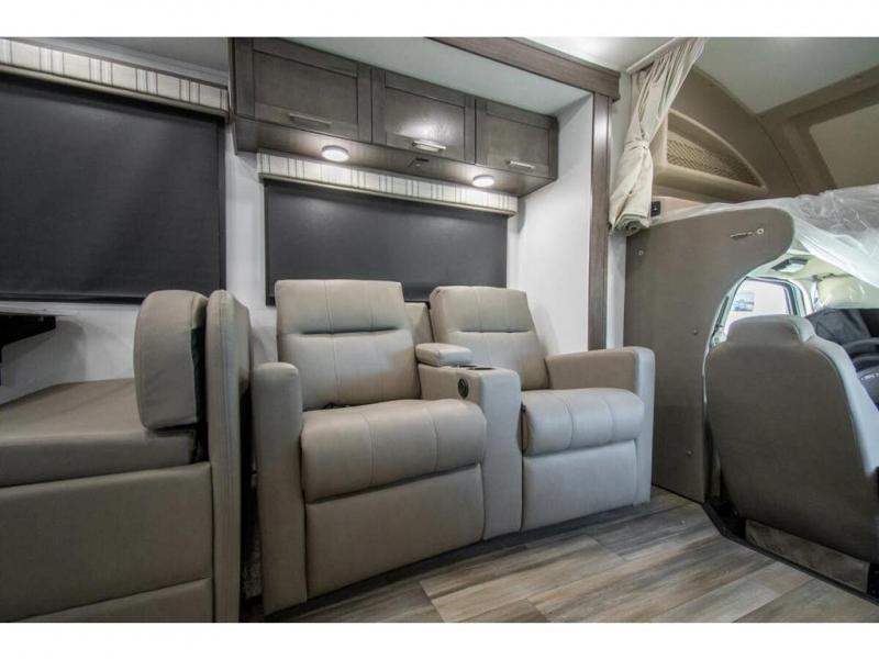Enjoy a home on wheels with this motorhome! The rear private bedroom has a 60" x 74" queen bed slide to lay your head on at night and dual wardrobes opposite to keep your clothes looking their best. Add the optional TV if you enjoy watching a movie in bed. The separated bathroom makes it easy for one person to freshen up in the 30" x 36" shower while another uses the private toilet and sink. Prepare your best home cooked meals with the Furrion all-in-one cooktop and oven then enjoy them at the booth dinette. The tri-fold sofa offers a comfortable place to relax but it can be switched out for the an optional theater sofa instead. There is also a bunk over cab for more to join in on the fun!