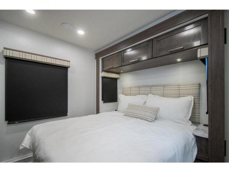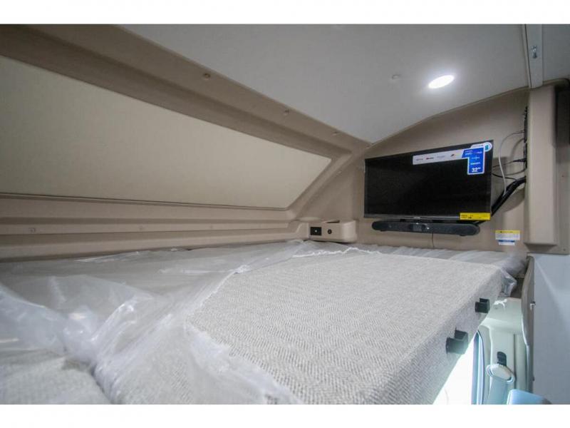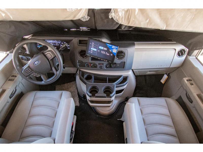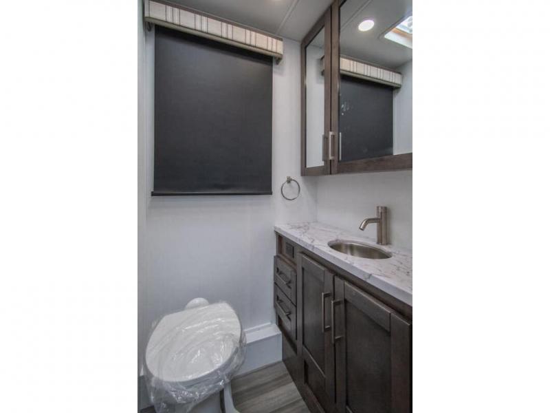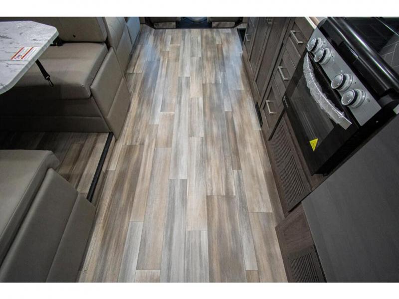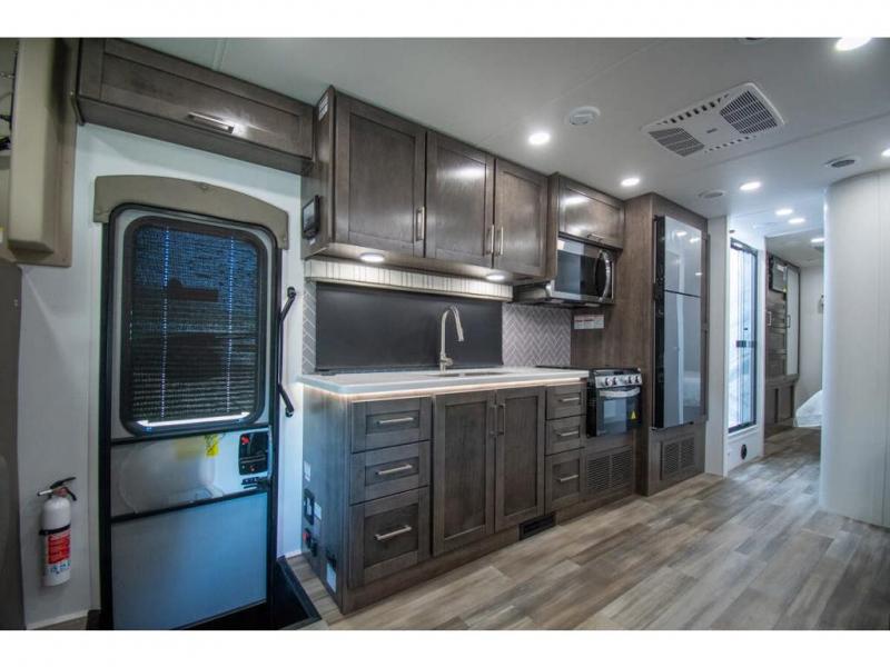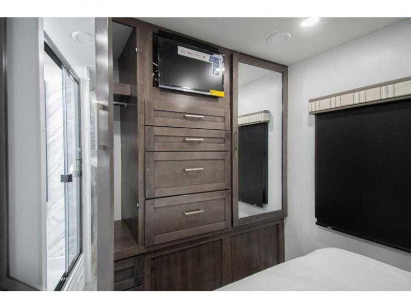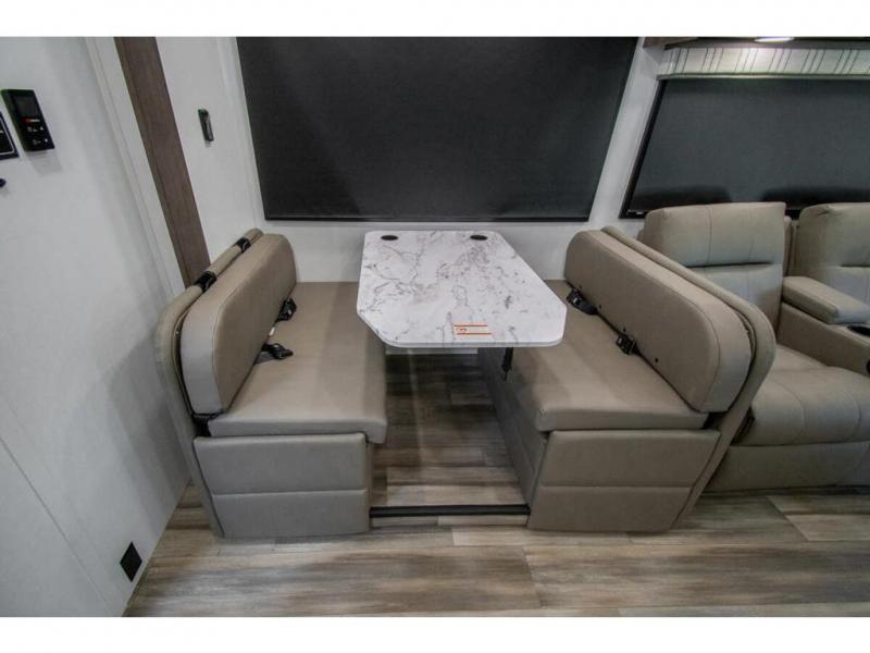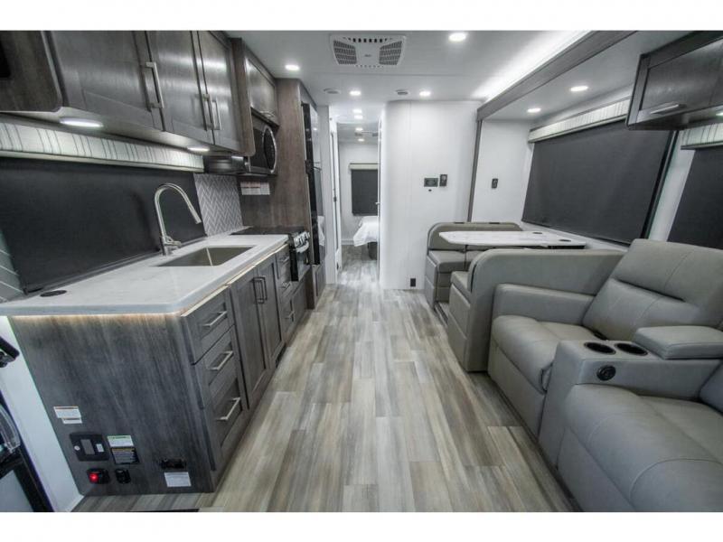 Enjoy a home on wheels with this motorhome! The rear private bedroom has a 60" x 74" queen bed slide to lay your head on at night and dual wardrobes opposite to keep your clothes looking their best. Add the optional TV if you enjoy watching a movie in bed. The separated bathroom makes it easy for one person to freshen up in the 30" x 36" shower while another uses the private toilet and sink. Prepare your best home cooked meals with the Furrion all-in-one cooktop and oven then enjoy them at the booth dinette. The tri-fold sofa offers a comfortable place to relax but it can be switched out for the an optional theater sofa instead. There is also a bunk over cab for more to join in on the fun!