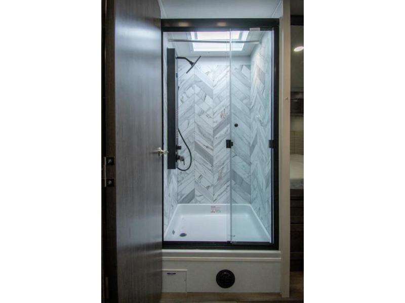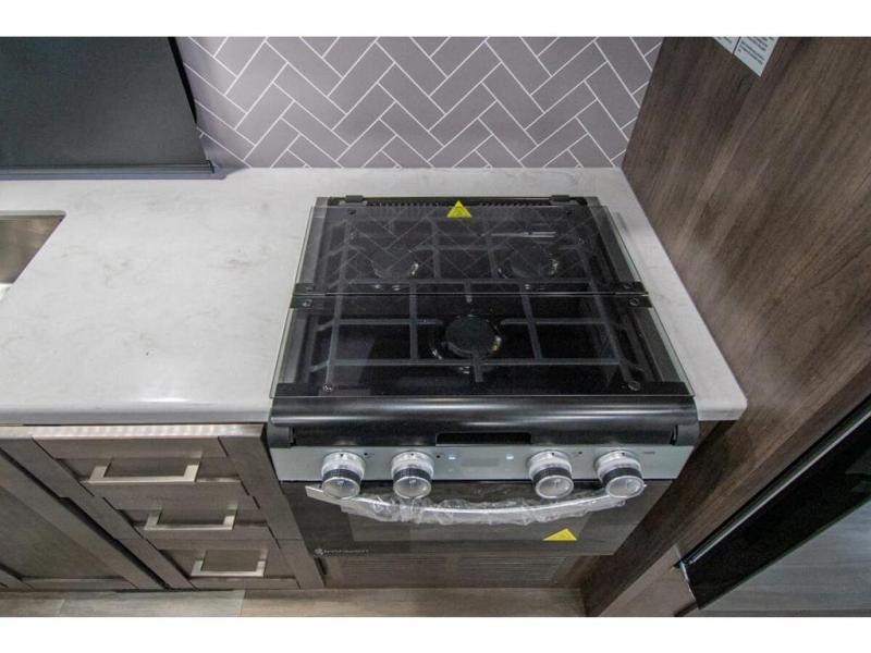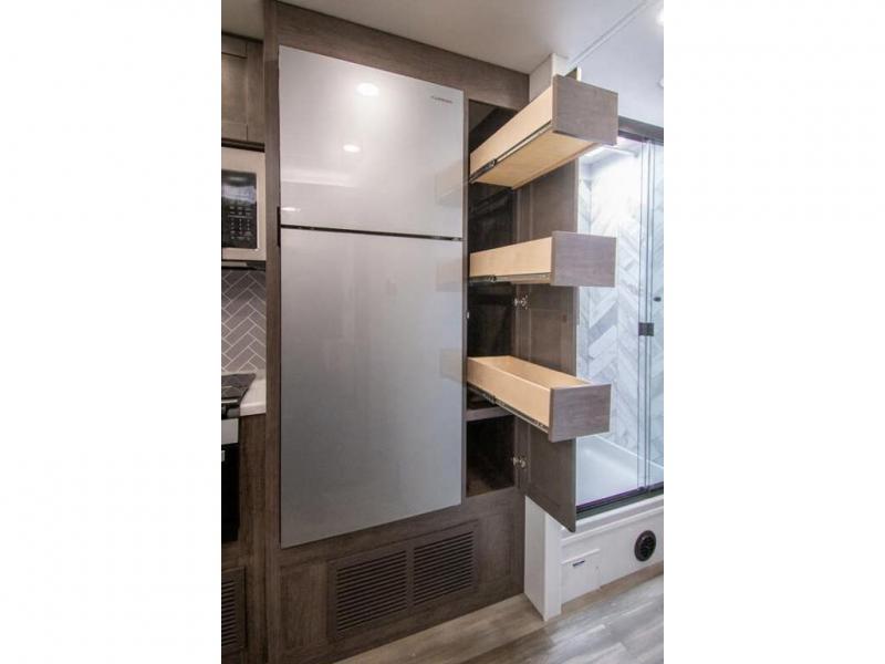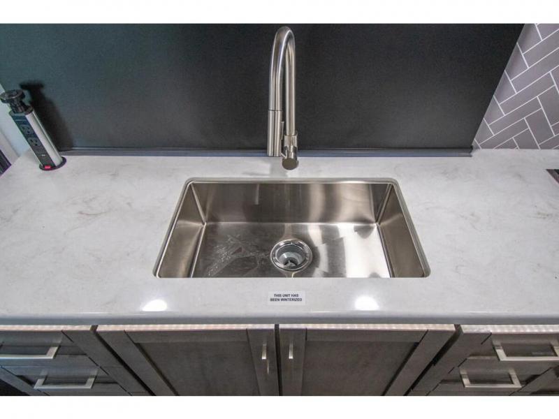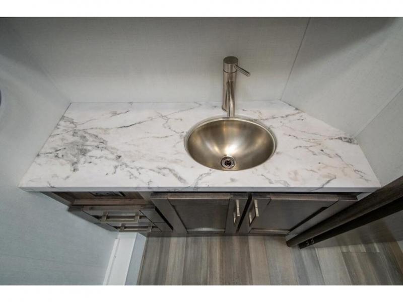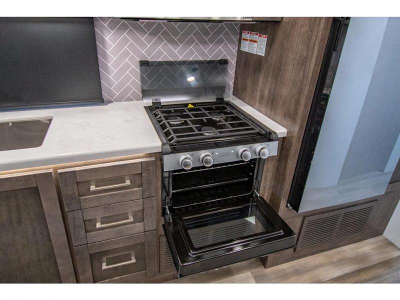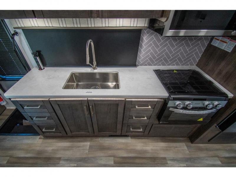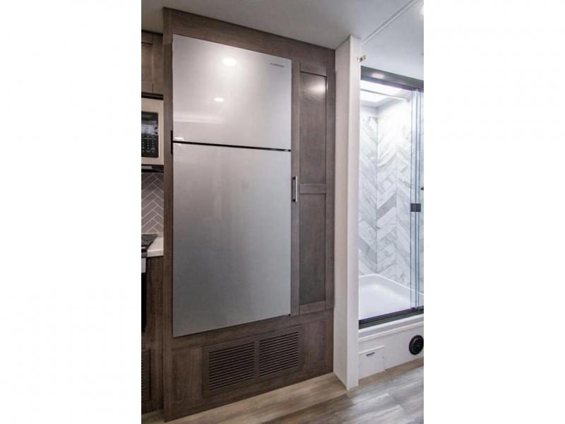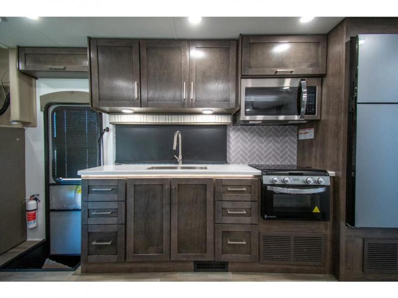 Enjoy a home on wheels with this motorhome! The rear private bedroom has a 60" x 74" queen bed slide to lay your head on at night and dual wardrobes opposite to keep your clothes looking their best. Add the optional TV if you enjoy watching a movie in bed. The separated bathroom makes it easy for one person to freshen up in the 30" x 36" shower while another uses the private toilet and sink. Prepare your best home cooked meals with the Furrion all-in-one cooktop and oven then enjoy them at the booth dinette. The tri-fold sofa offers a comfortable place to relax but it can be switched out for the an optional theater sofa instead. There is also a bunk over cab for more to join in on the fun!
