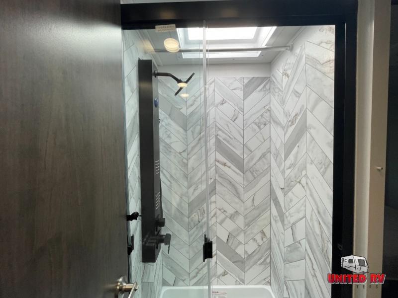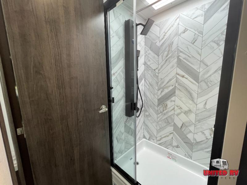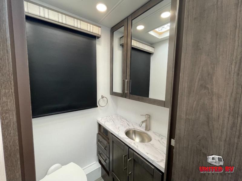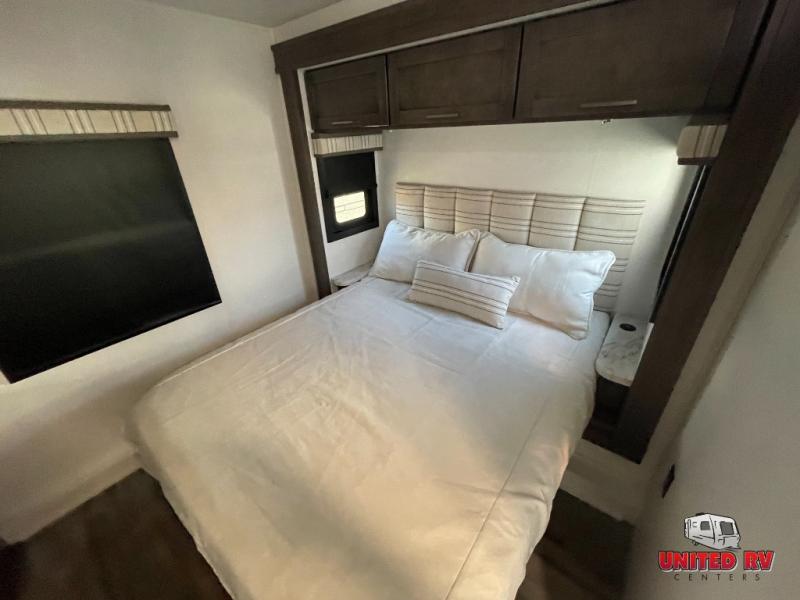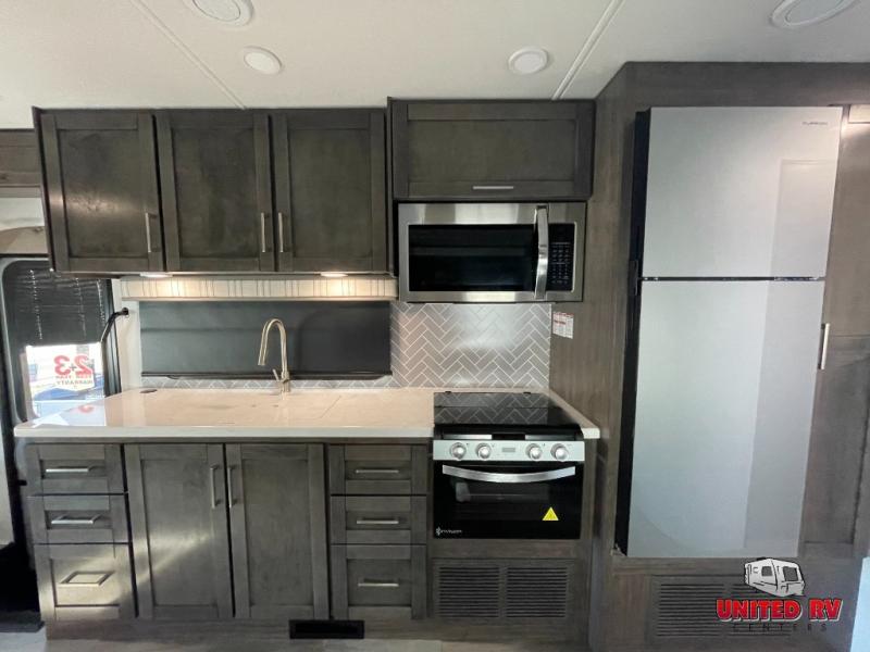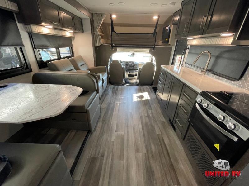 Enjoy a home on wheels with this motorhome! The rear private bedroom has a 60" x 74" queen bed slide to lay your head on at night and dual wardrobes opposite to keep your clothes looking their best. Add the optional TV if you enjoy watching a movie in bed. The separated bathroom makes it easy for one person to freshen up in the 30" x 36" shower while another uses the private toilet and sink. Prepare your best home cooked meals with the Furrion all-in-one cooktop and oven then enjoy them at the booth dinette. The tri-fold sofa offers a comfortable place to relax but it can be switched out for the an optional theater sofa instead. There is also a bunk over cab for more to join in on the fun!
