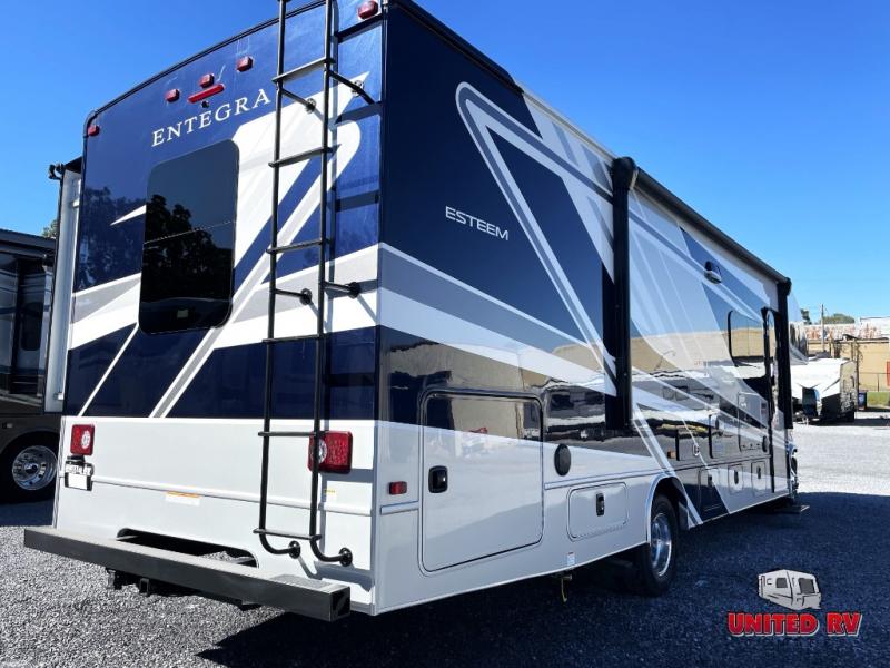 Make one of these Entegra Coach Esteem Class C gas motorhomes your own! The interior design includes solid-surface countertops that pair well with the many technological upgrades. The fully custom-molded ABS surround in the cab area features its signature panoramic window and power shade for a beautiful view while you drive and provide privacy at night. They also come with E-Z Drive Elite which has a computer-balanced driveshaft, Koni FSD shocks, Hellwig helper springs, and a heavy-duty rear stabilizer bar for a smooth ride. Automatic leveling jacks will make set-up a breeze and the electric awning with LED lights will create an outdoor living space where you can relax after unpacking. Inside, you'll enjoy hardwood cabinet doors and drawer fronts, blackout night roller shades, and high-intensity recessed LED ceiling lights to keep your space well lit. There is also a JBL audio system and a BMPRO total coach control system to easily manage your unit's functions!