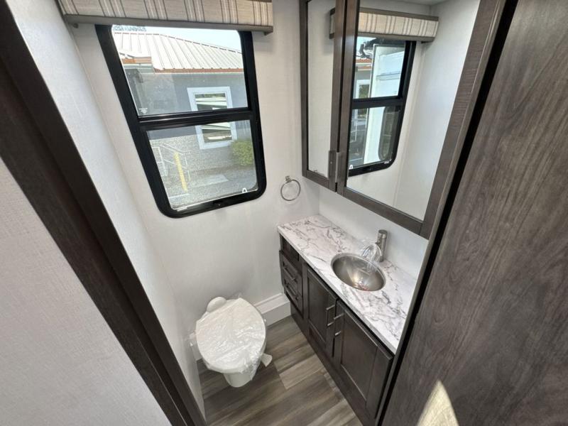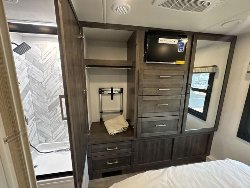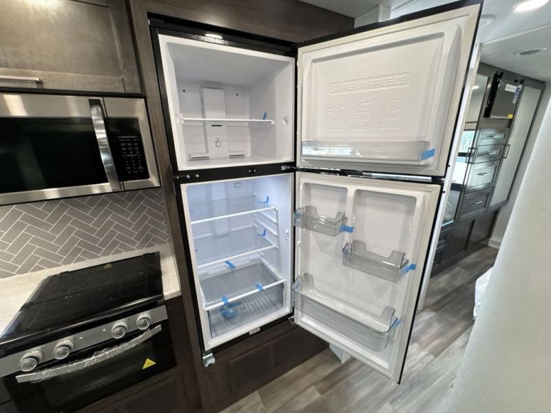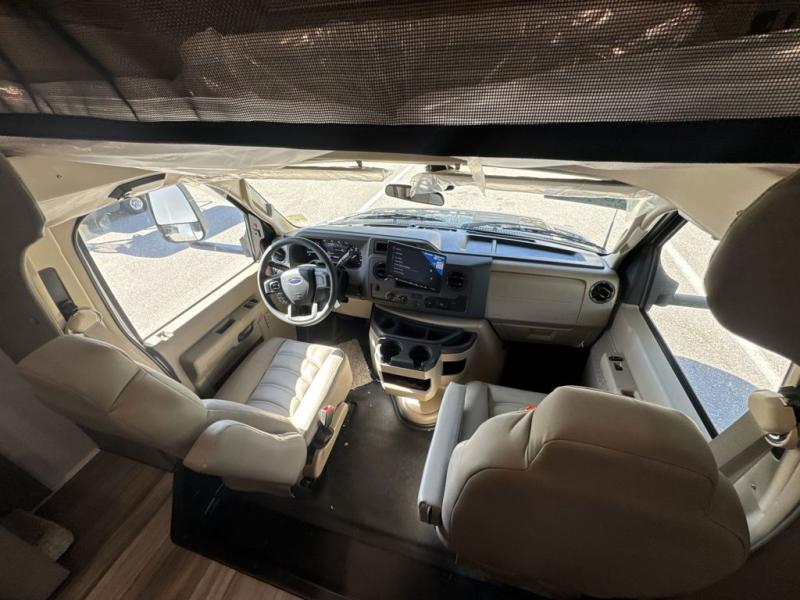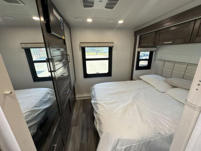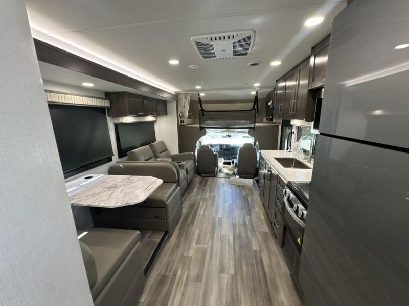 Enjoy a home on wheels with this motorhome! The rear private bedroom has a 60" x 74" queen bed slide to lay your head on at night and dual wardrobes opposite to keep your clothes looking their best. Add the optional TV if you enjoy watching a movie in bed. The separated bathroom makes it easy for one person to freshen up in the 30" x 36" shower while another uses the private toilet and sink. Prepare your best home cooked meals with the Furrion all-in-one cooktop and oven then enjoy them at the booth dinette. The tri-fold sofa offers a comfortable place to relax but it can be switched out for the an optional theater sofa instead. There is also a bunk over cab for more to join in on the fun!