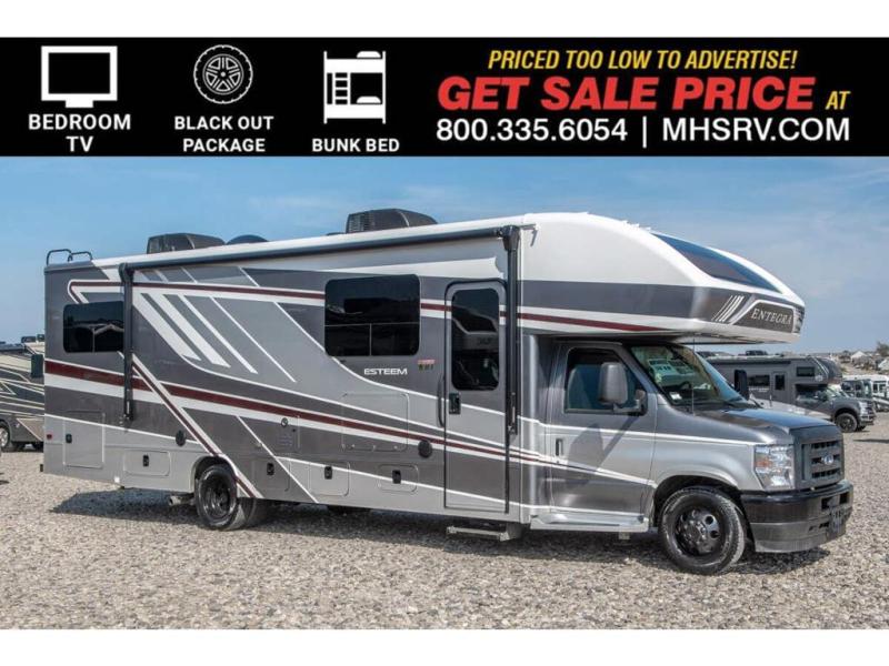 Make one of these Entegra Coach Esteem Class C gas motorhomes your own! The interior design includes solid-surface countertops that pair well with the many technological upgrades. The fully custom-molded ABS surround in the cab area features its signature panoramic window and power shade for a beautiful view while you drive and provide privacy at night. They also come with E-Z Drive Elite which has a computer-balanced driveshaft, Koni FSD shocks, Hellwig helper springs, and a heavy-duty rear stabilizer bar for a smooth ride. Automatic leveling jacks will make set-up a breeze and the electric awning with LED lights will create an outdoor living space where you can relax after unpacking. Inside, you'll enjoy hardwood cabinet doors and drawer fronts, blackout night roller shades, and high-intensity recessed LED ceiling lights to keep your space well lit. There is also a JBL audio system and a BMPRO total coach control system to easily manage your unit's functions!