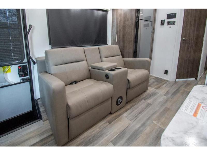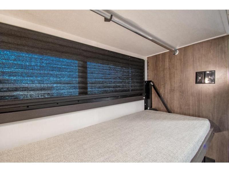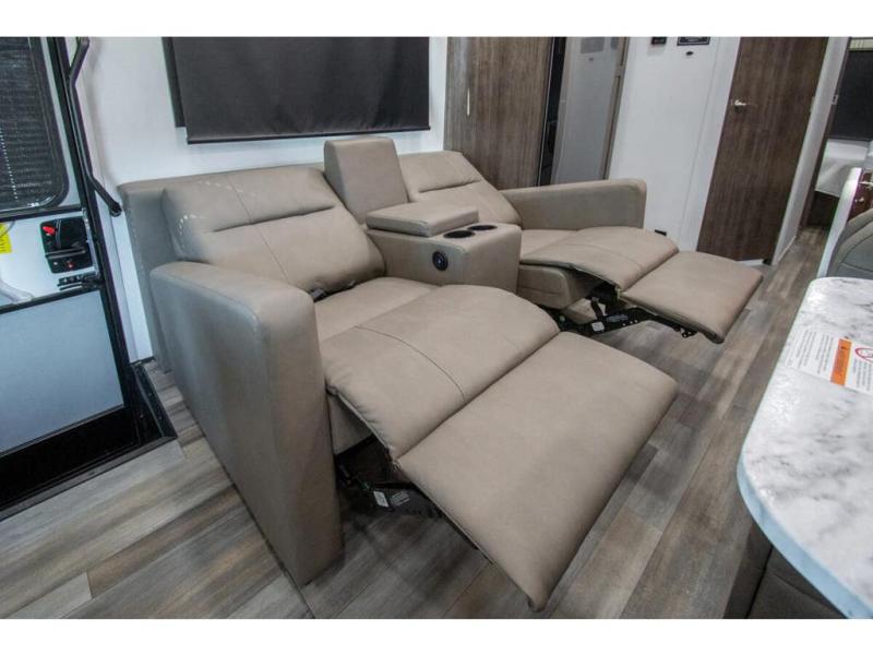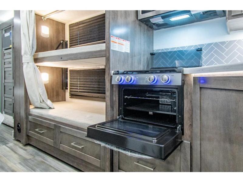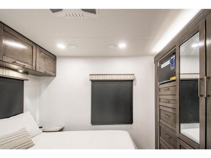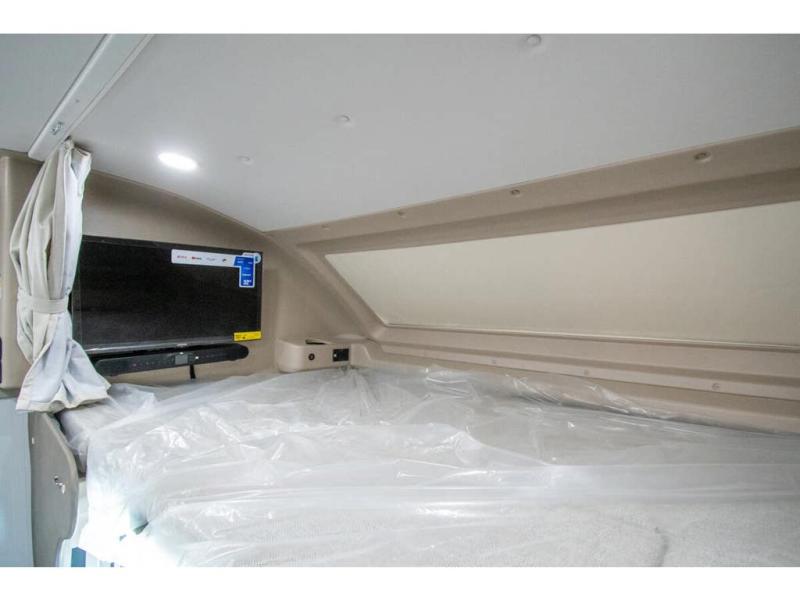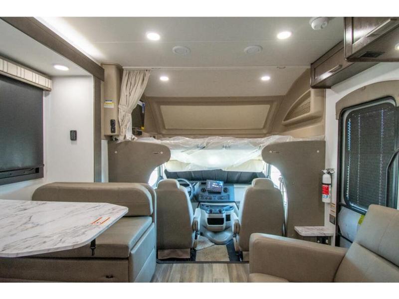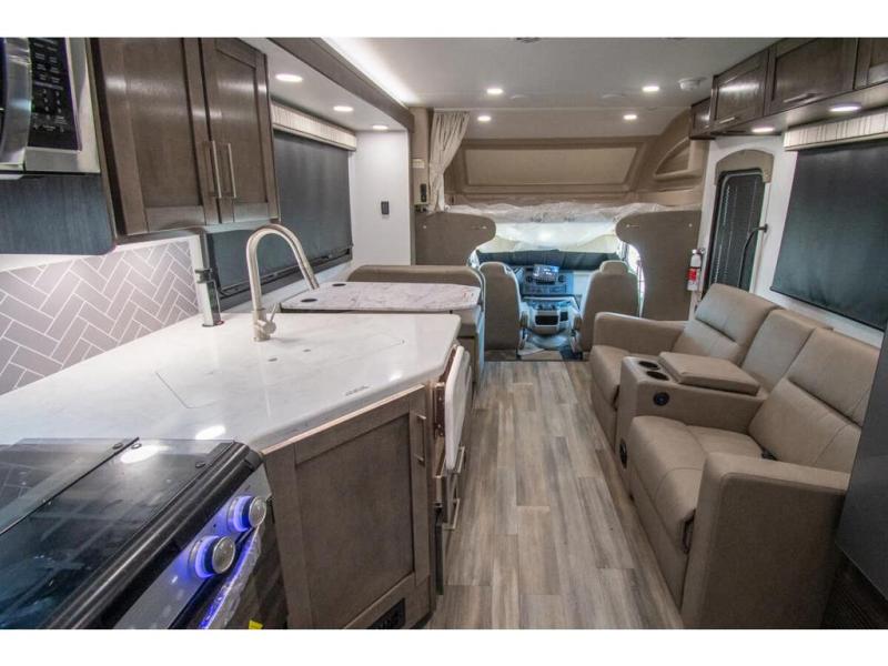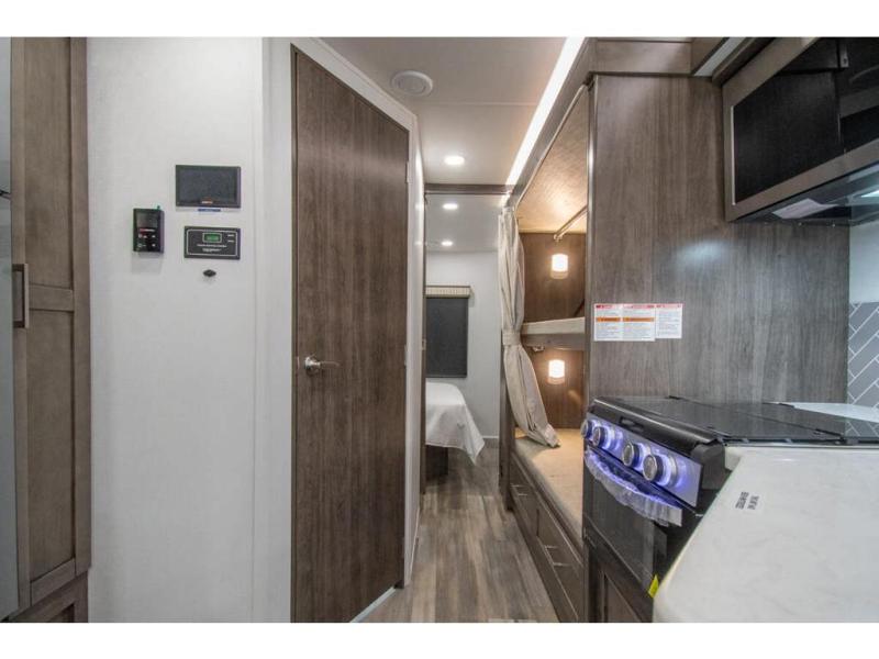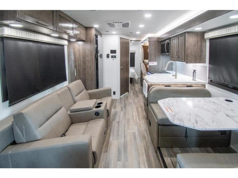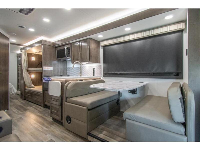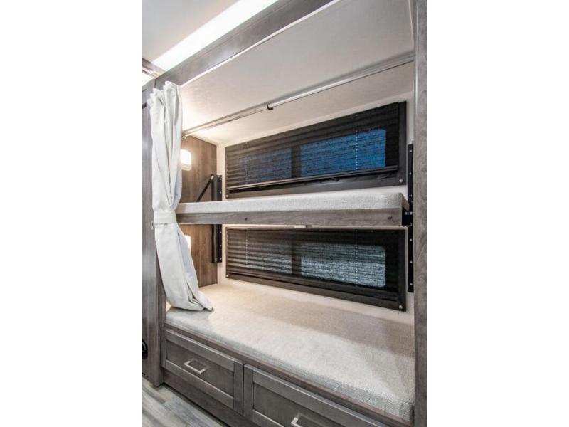 The whole family can travel together in this motorhome! The kiddos can sleep on the set of bunk beds with tablet holders and you can sleep on the 60" x 74" queen bed in the rear private bedroom. Everyone can easily access the dual entry bathroom to freshen up in the 32" radius shower each morning. Cook up delicious meals on the Furrion all-in-one cooktop, then head to the booth dinette which can also transform into an extra sleeping space. You can take an afternoon nap on the sofa or head outdoors to watch the big game at the exterior LED HD Smart TV underneath the 18' electric awning with LED lights to highlight the good times!
