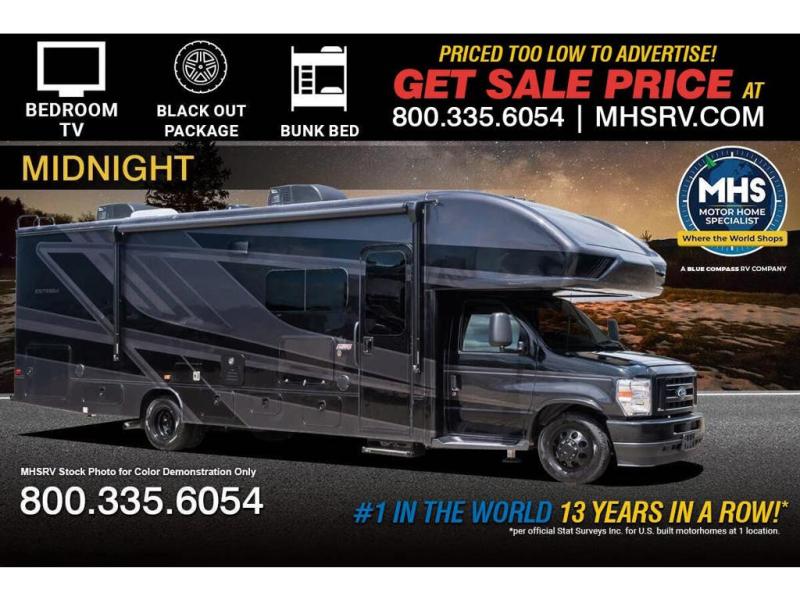 The whole family can travel together in this motorhome! The kiddos can sleep on the set of bunk beds with tablet holders and you can sleep on the 60" x 74" queen bed in the rear private bedroom. Everyone can easily access the dual entry bathroom to freshen up in the 32" radius shower each morning. Cook up delicious meals on the Furrion all-in-one cooktop, then head to the booth dinette which can also transform into an extra sleeping space. You can take an afternoon nap on the sofa or head outdoors to watch the big game at the exterior LED HD Smart TV underneath the 18' electric awning with LED lights to highlight the good times!