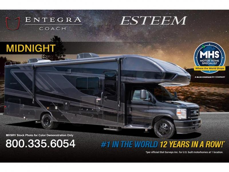 Make one of these Entegra Coach Esteem Class C gas motorhomes your own! The interior design includes solid-surface countertops that pair well with the many technological upgrades. The fully custom-molded ABS surround in the cab area features its signature panoramic window and power shade for a beautiful view while you drive and provide privacy at night. They also come with E-Z Drive Elite which has a computer-balanced driveshaft, Koni FSD shocks, Hellwig helper springs, and a heavy-duty rear stabilizer bar for a smooth ride. Automatic leveling jacks will make set-up a breeze and the electric awning with LED lights will create an outdoor living space where you can relax after unpacking. Inside, you'll enjoy hardwood cabinet doors and drawer fronts, blackout night roller shades, and high-intensity recessed LED ceiling lights to keep your space well lit. There is also a JBL audio system and a BMPRO total coach control system to easily manage your unit's functions!