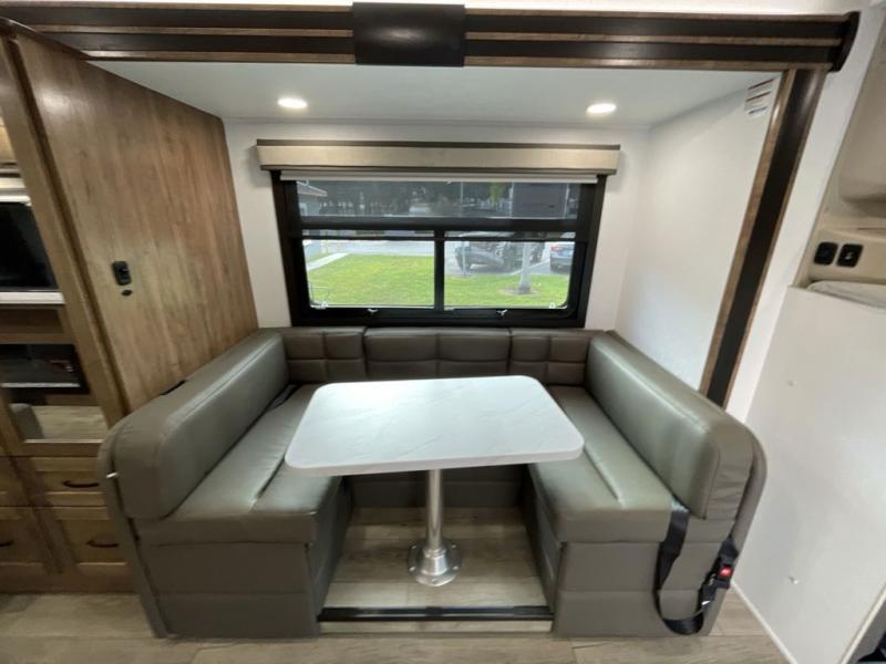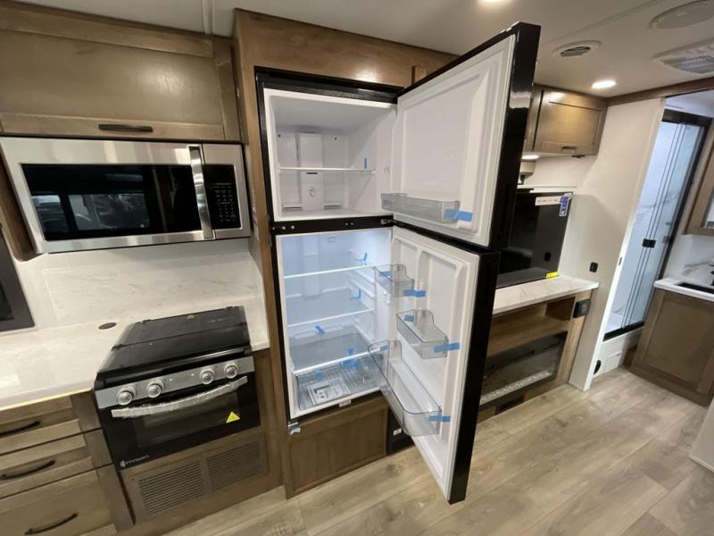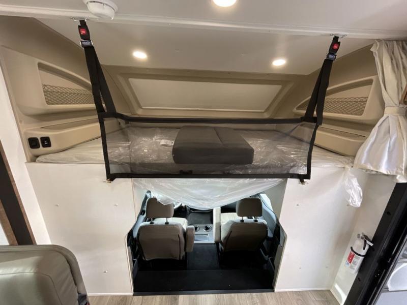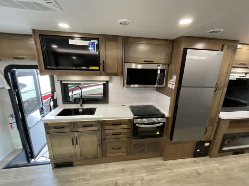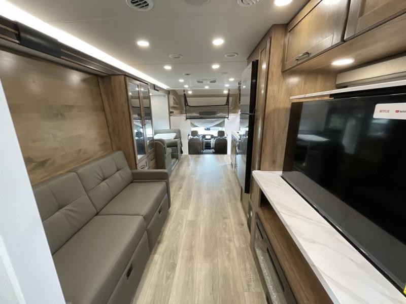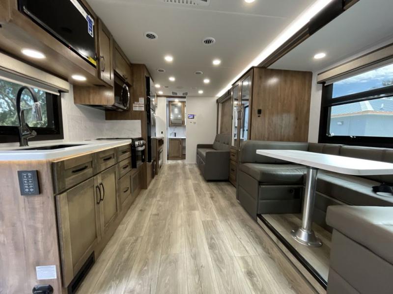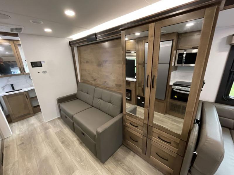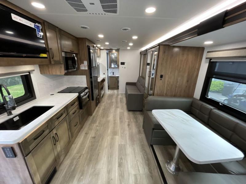 Have an amazing trip on board this motor home, which has different areas to spend a soothing moment like the 70" sofa with 60" x 75" queen Murphy bed and 42" x 80" U-shaped dinette where two more people can fit. You can also relax at the fireplace while watching the 50" TV. This unit also has plenty of space in wardrobe, and overhead cabinets to store your belongings. Moving to the kitchen area, you will also find overhead cabinets, a pantry to store different things, and a 10 cu. refrigerator, microwave, and all-in-one cooktop and oven to make your meals delectable. Get away from the days of boredom with the outside entertainment center ideal for watching a good show while enjoying the the surroundings. Finally, after a tiring day in the woods take a bath in the incredible full bathroom equipped with a 30" x 36" shower.