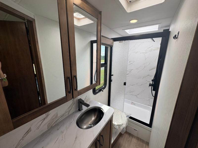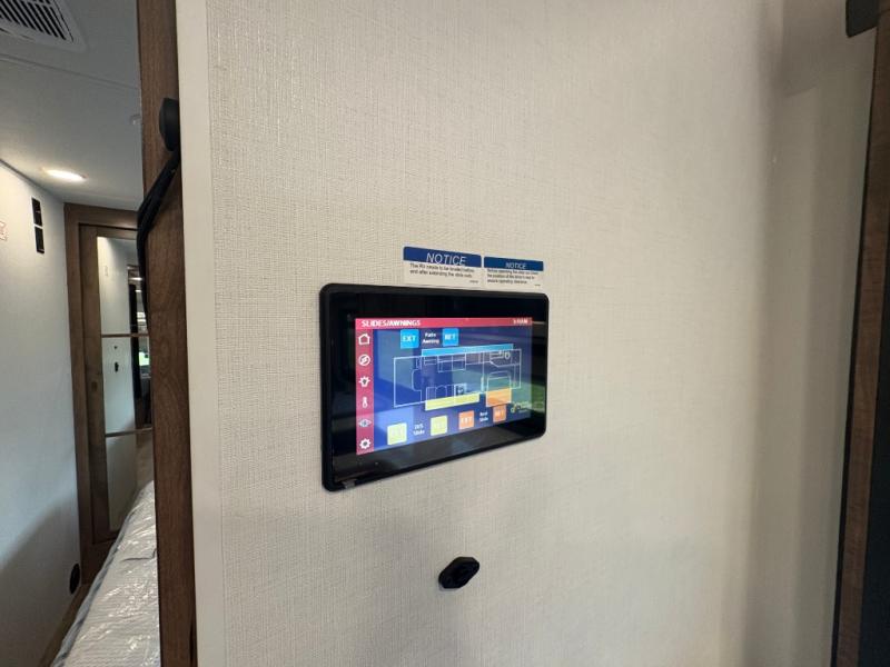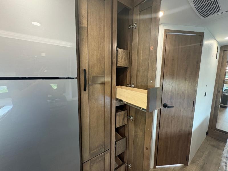 A perfect get-a-way coach for you and your guests with sleeping space for six thanks to the cabover bunk with a 750 lb. capacity and the 68" jack-knife sofa. You could choose the theater seat option in place of the jack-knife sofa if you didn't need the added sleeping space. Each morning and night you will enjoy the 30" x 36" shower with skylight for getting cleaned up. The kitchen will allow you to easily create great meals just like home with a Furrion cooktop and oven, residential microwave, and there is a 10 cu. ft. refrigerator and pantry for food storage. The walk-around king bed will be a welcome retreat at night, and there is a full wardrobe along the back wall for your things. Add an optional TV and you can enjoy late night movies in bed. This unit also allows you to enjoy the outdoors with a 20' awning and outside entertainment center. Note: you can choose a 15 cu. ft. optional refrigerator in place of the 10 cu. ft. if you like.